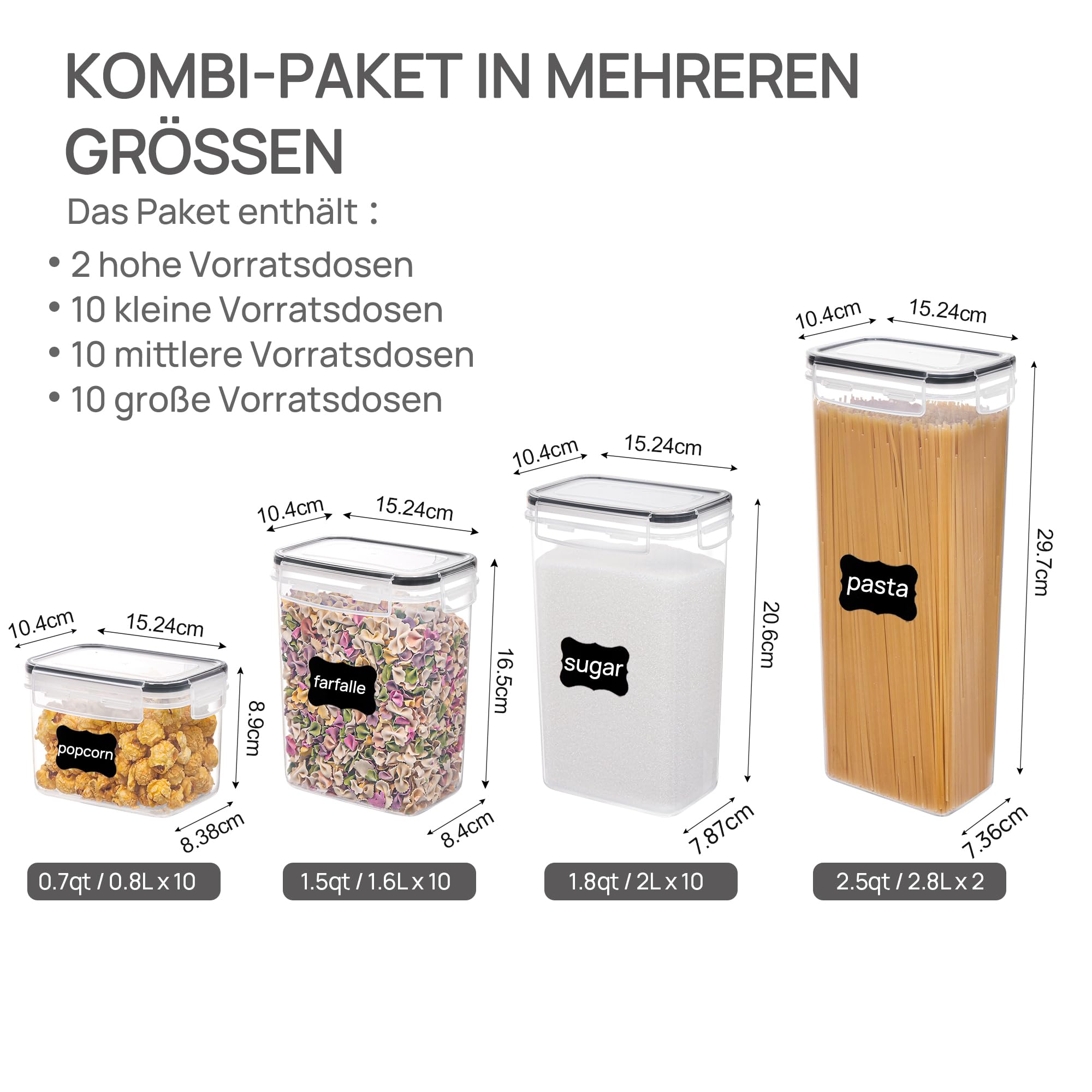 Lieferumfang: 2 hohe Behälter (2,8 Liter). 10 grosse Behälter (2,0 Liter). 10 mittelgrosse Behälter (1,4 Liter). 10 kleine Behälter (0,8 Liter). 24 Kreidetafel-Etiketten.