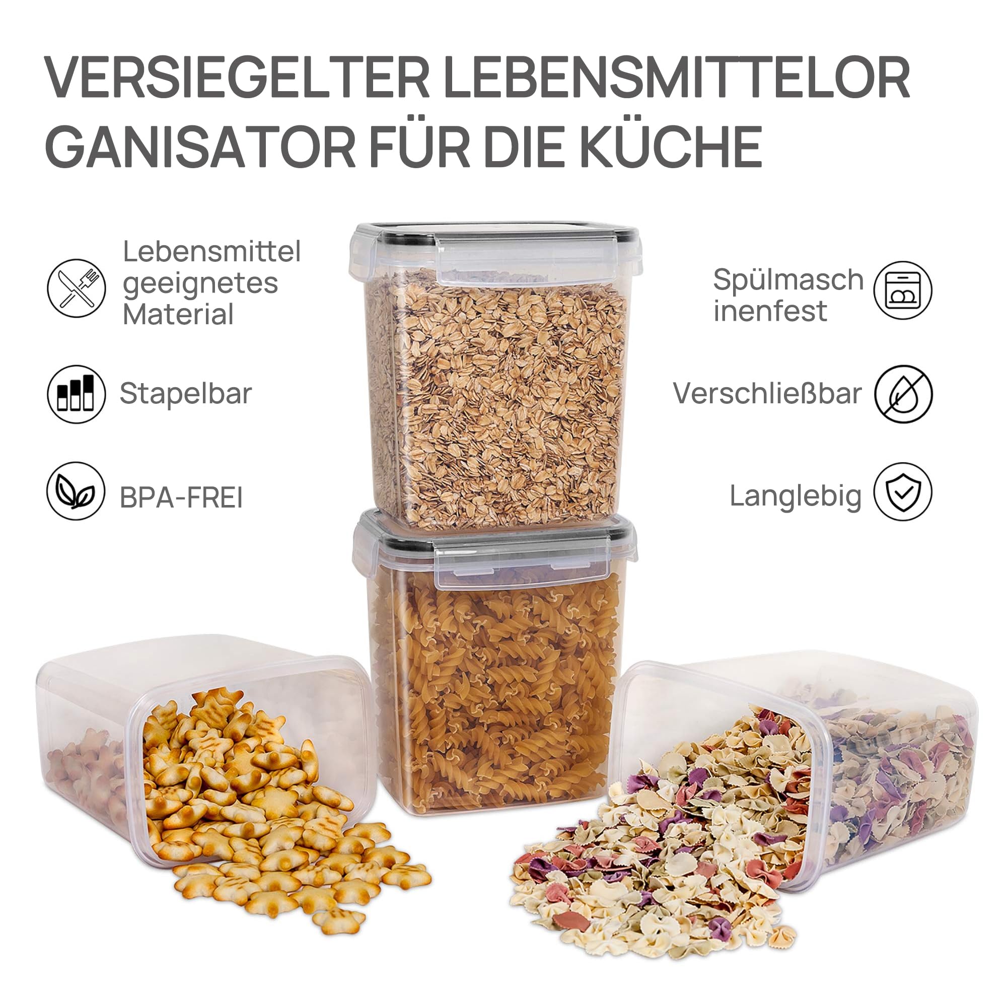 Warum sollten Sie Vtopmart Frischhaltedosen wählen? Machen Sie es einfach für Küche und Speisekammer. Trockene Lebensmittel kommen oft in Papier- oder Plastiktüten. Sobald Sie sie öffnen, können sie überall in Ihren Küchenschränken oder Speisekammerregalen verschütten. Hier können Vtopmart Frischhaltedosen diese Situation verändern. Sie helfen dabei, die Schränke zu organisieren, Platz zu sparen und verhindern, dass Lebensmittel überall verschüttet werden. Hält Lebensmittel trocken und frisch. 4 seitlich verschliessbare Deckel dichten diese Vorratsdosen fest, so dass sie Ihre Lebensmittel immer frisch halten, und Sie können diese Behälter leicht öffnen und schliessen.