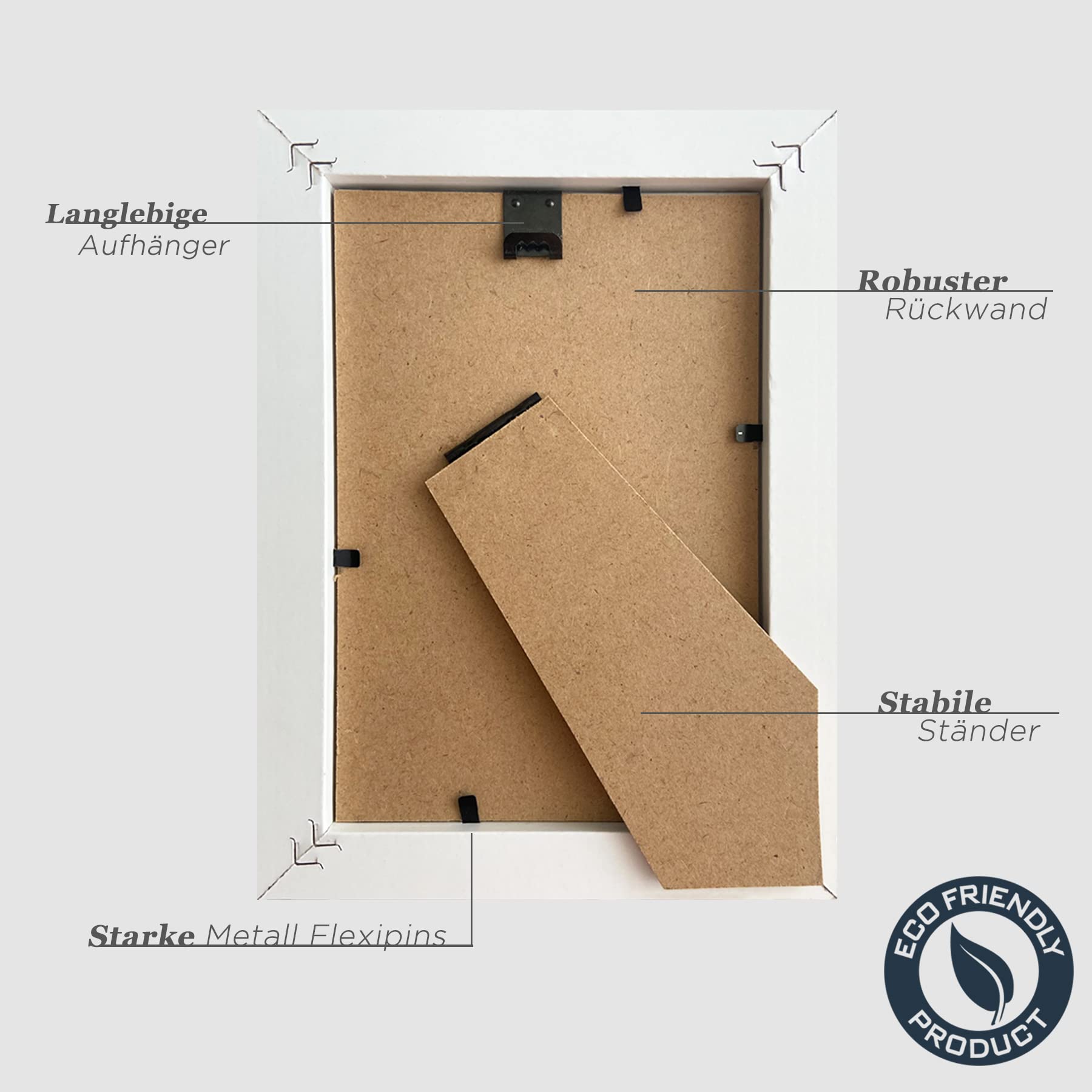 Die Bilderrahmen sind aus MDF Verbundholz & die Scheibe aus Plexiglas (die beidseitig mit einer leicht abziehbaren Folie versehen ist). Eine total saubere Verarbeitung, nicht nur geklebt, sondern auch zusätzlich geklammert. Einfach in der Handhabung