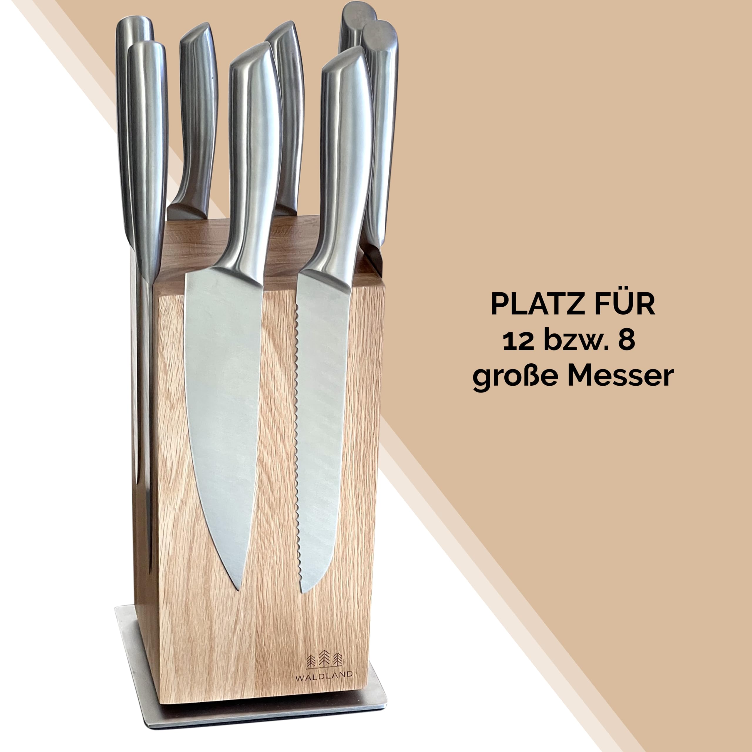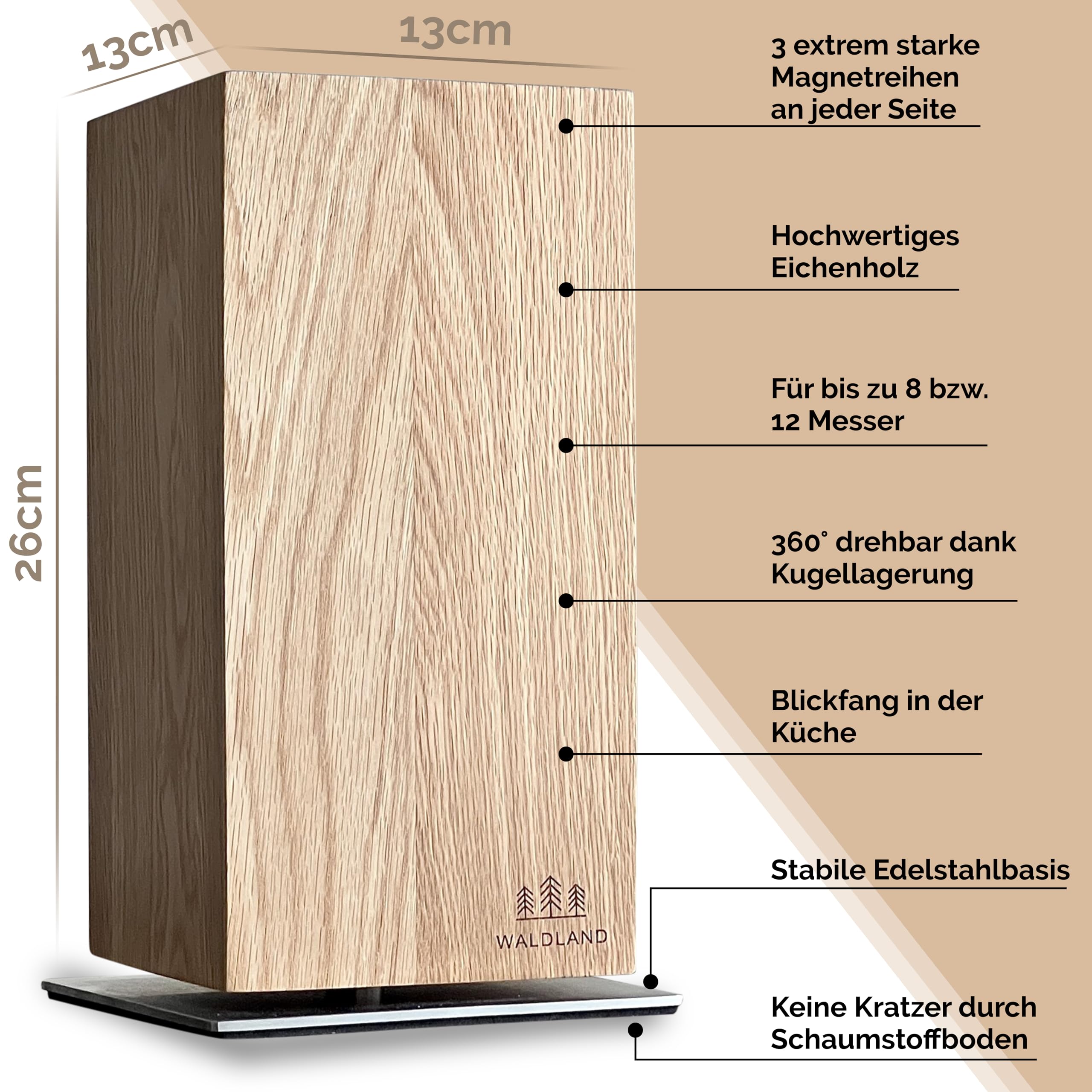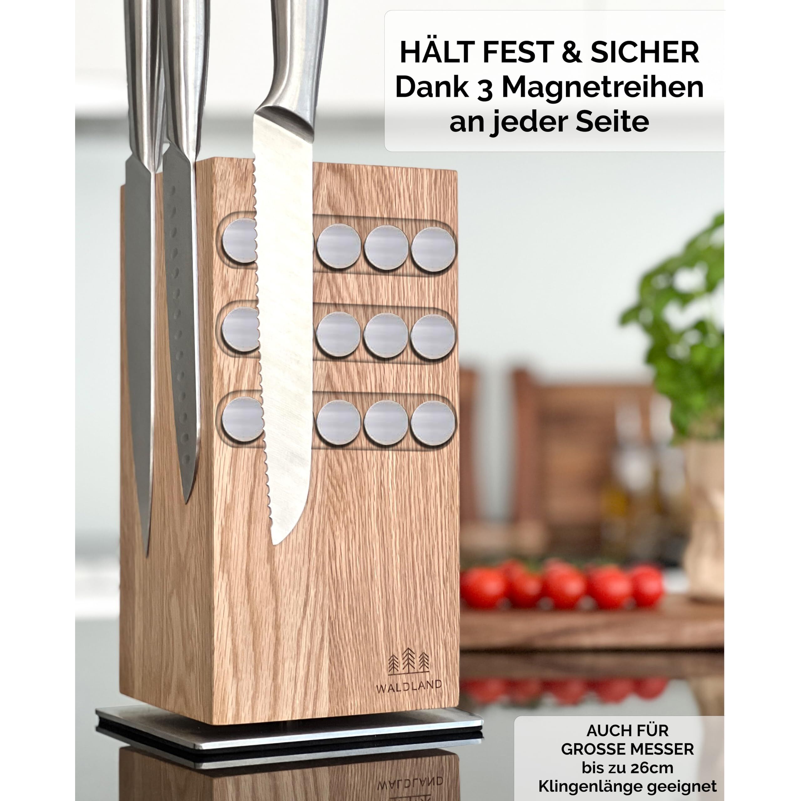 WALDLAND Premium Messerblock ohne Messer – Messerblock magnetisch und 360° drehbar aus edlem & robustem Eichenholz I Messerhalter magnetisch für Messer I Holzblock I Knife Holder Block (360°, Eiche)