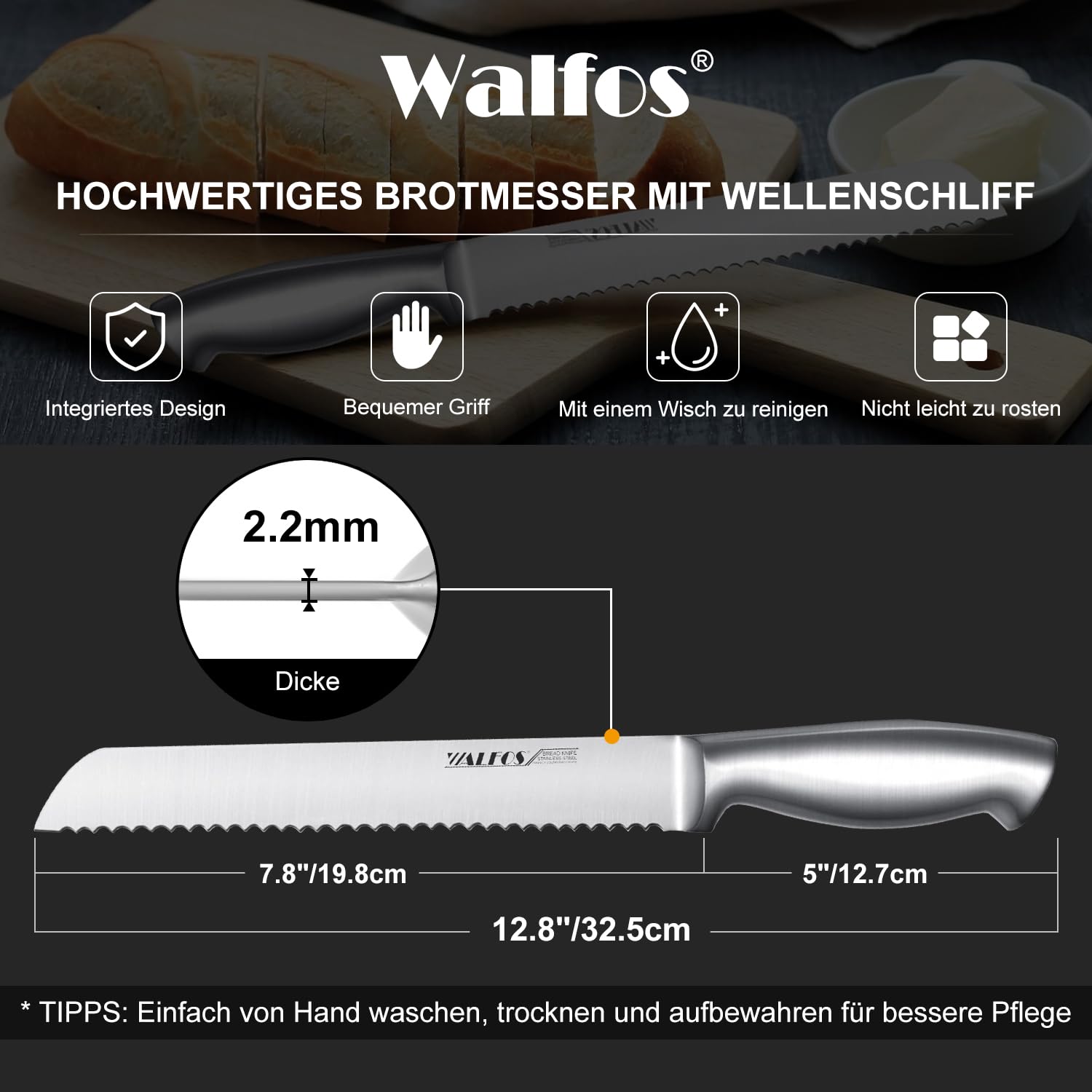 Walfos Brotmesser, Edelstahl-Brotmesser mit Wellenschliff, Ultrascharf, Einteiliges Design, Ergonomischer Griff und 8-Zoll-Klinge, ideal zum Schneiden von Brot, Bagels, Kuchen