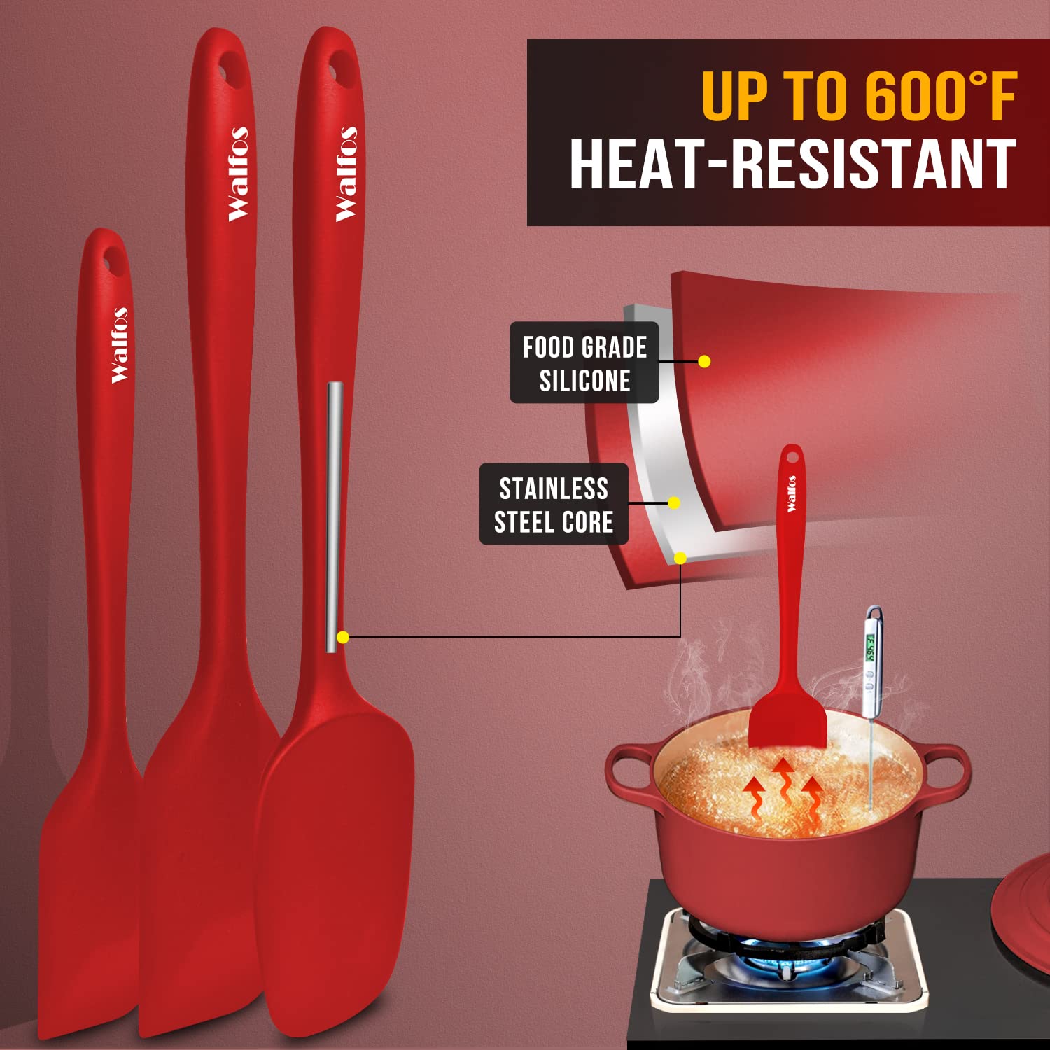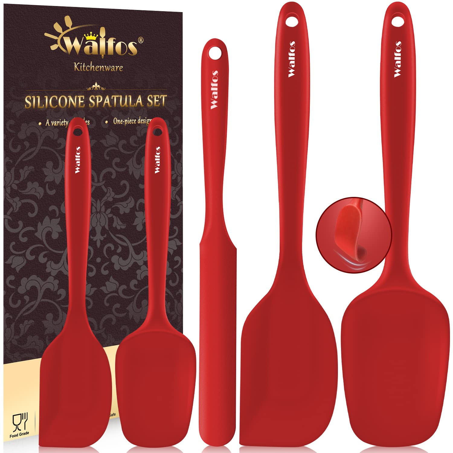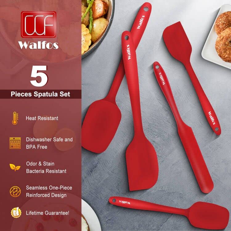 Walfos Silikon Spachtel, Hitzebeständiger bis 600°F Spatel, Antihaft Silikon Spatel Set mit Metallkern Ideal für Kochen und Backen (5 Stück Rot Spatel)