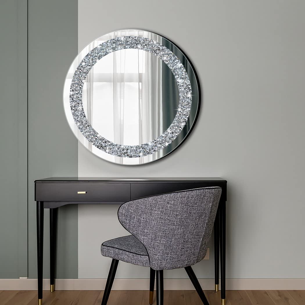 Wandspiegel, rund, für Heimdekoration, zerkleinerter Kristall, Diamant, Silber, 59,9 x 59,9 x 2,5 cm, zum Aufhängen an der Wand, ohne Rahmen, Spiegel, Glas, Diamant Dekor