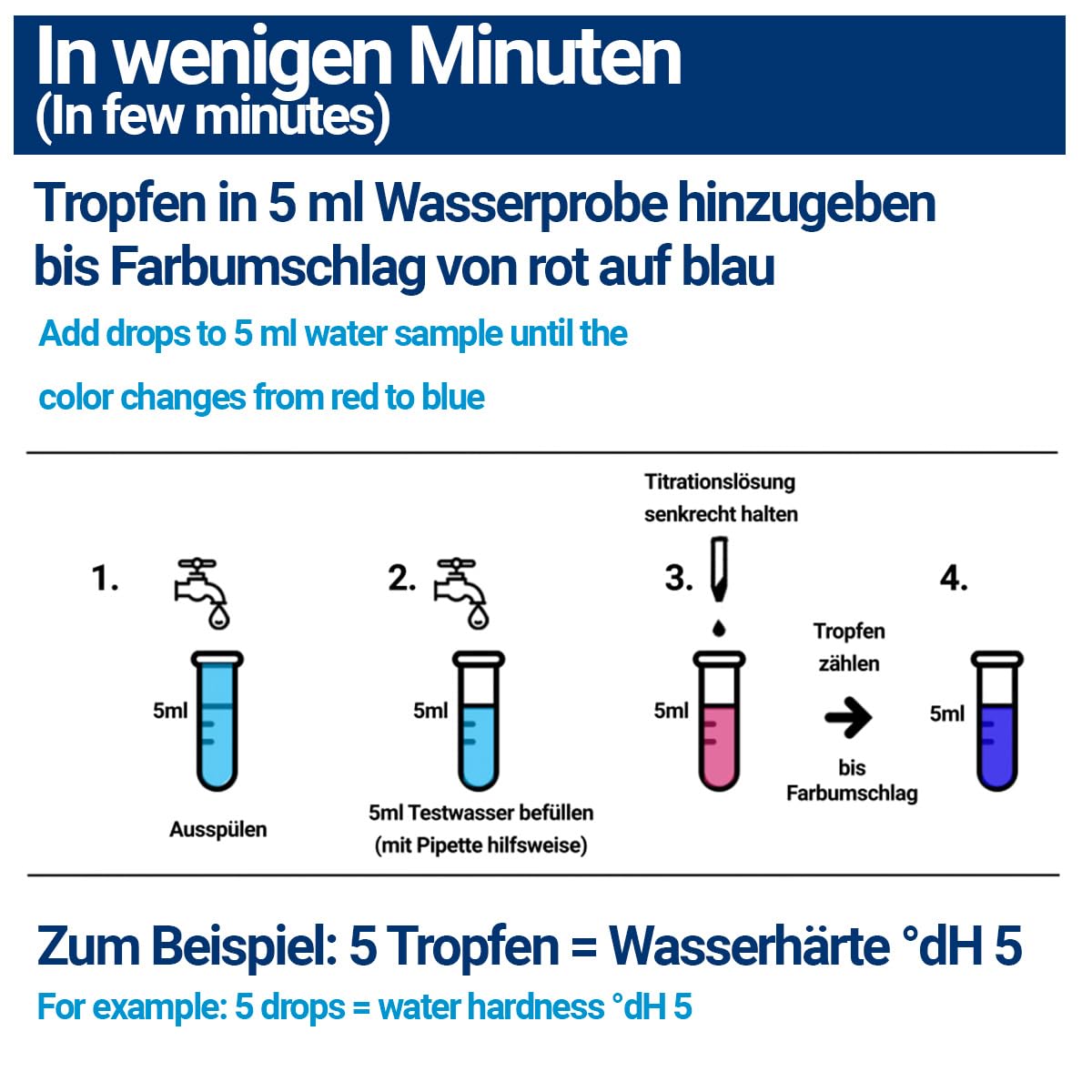 Wasserhärte messen | Test Set Deutscher Härtebereich | Titrierlösung | weich, mittel, hart | Titration | Messbereich 0-30 °dH – Kalk prüfen (1x15ml)