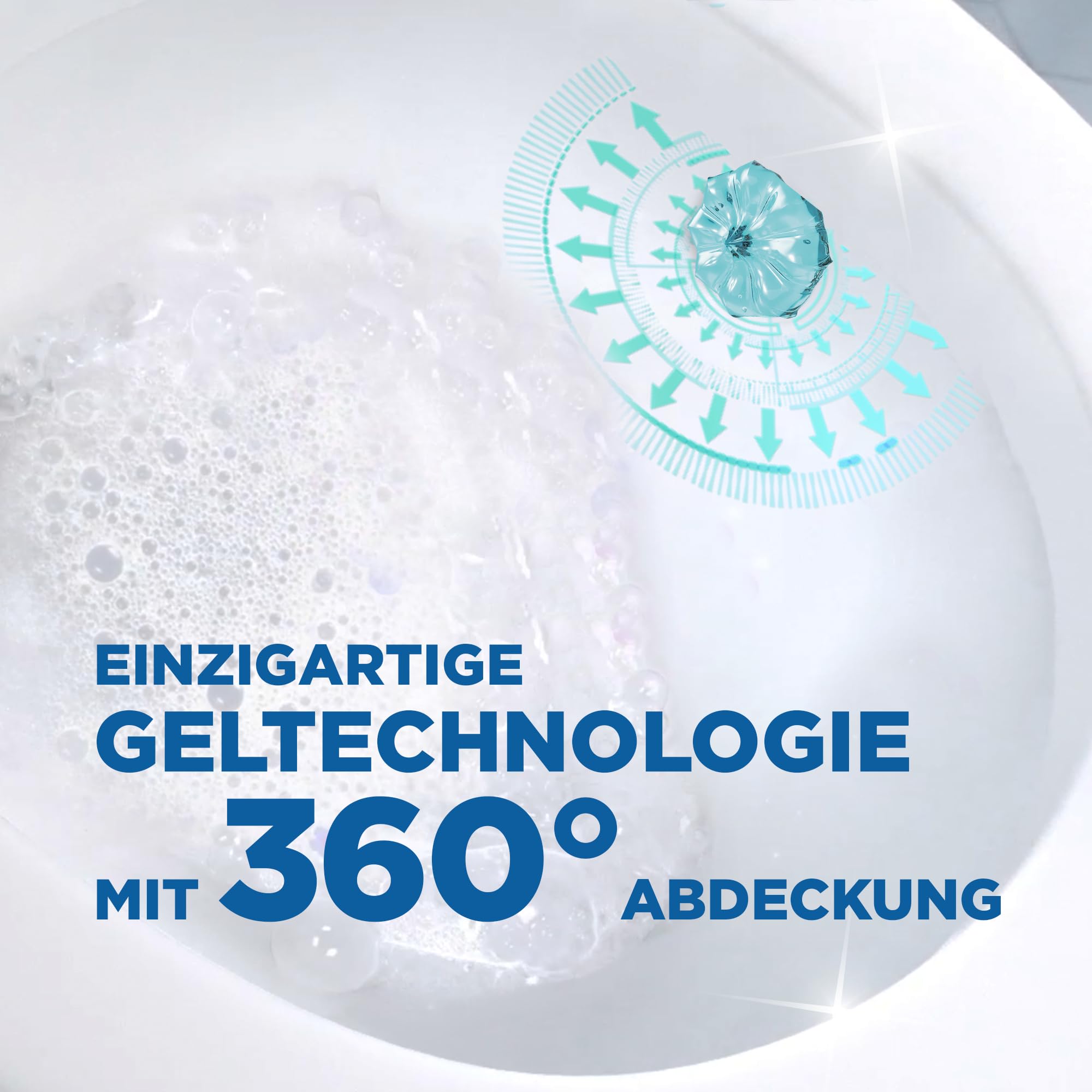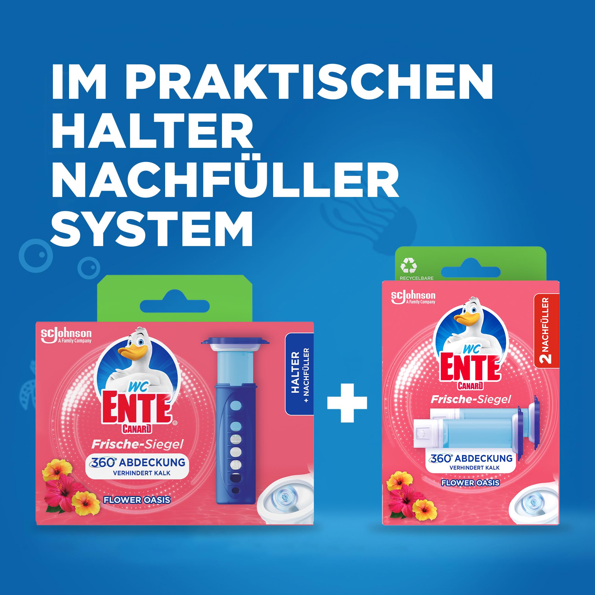 WC-Ente Frische-Siegel Starterpack (1 Original Spendergriff plus 1 Nachfüller mit 6 Siegeln) ist die innovative und dezente Alternative zum klassischen WC-Einhänger. Das Frische-Siegel ist das erste Frische-Gel für die Toilette, das ohne Toiletteneinhänger auskommt. Deswegen ist es sowohl für Toiletten mit Spülrand als auch für spülrandlose WCs geeignet. Das Gel wird mit Hilfe eines Spenders an der Innenwand des WC-Beckens wie ein Siegel/Stempel platziert, wo das Wasser beim Spülvorgang entlang fliesst. Es setzt reinigende Substanzen und frischen Duft bei jeder Spülung frei. Einfache Anwendung: Den Gel-Behälter in den blauen Spendergriff schieben, bis der Druckknopf mit einem Klick im ersten Loch einrastet. Verschlusskappe abnehmen und den Spender mit dem offenen Ende dort an der Innenwand des WC-Beckens platzieren, wo das Wasser beim Spülvorgang entlang fliesst. Den Druckknopf drücken und gleichzeitig den blauen Spendergriff in Richtung des WC-Beckens schieben, bis der Druckknopf im nächsten Loch einrastet. Wichtig: Den Spender mit etwas Druck an die Innenwand des WC-Beckens pressen. Den Spender einfach abziehen und das Frische Siegel haftet im WC Becken. Verschlusskappe wieder am Spender aufbringen und bis zum nächsten Gebrauch lagern. Toilettenspülung benutzen, um das Frische-Siegel zu aktivieren. 1 Siegel hält bis zu 10 Tage bzw. 1 voller Spender mit 6 Siegeln bis zu 8 Wochen. Das WC-Ente Frische-Siegel kann auch in Toiletten mit Nano-Versiegelung oder Lotus-Effekt angewendet werden. Das Produkt ist sicher in der Anwendung, solange es nach Gebrauchsanweisung angewendet wird. Wie alle Reinigungsmittel sollte das Produkt nicht in die Hände von Kindern gelangen. Das Material des Spendergriffs ist LDPE, ein Polyethylen und ist gemäss dem Grünen Punkt in der gelben Wertstofftonne zu entsorgen. Damit kann der Spender dem Wiederverwertungskreislauf rückgeführt werden.