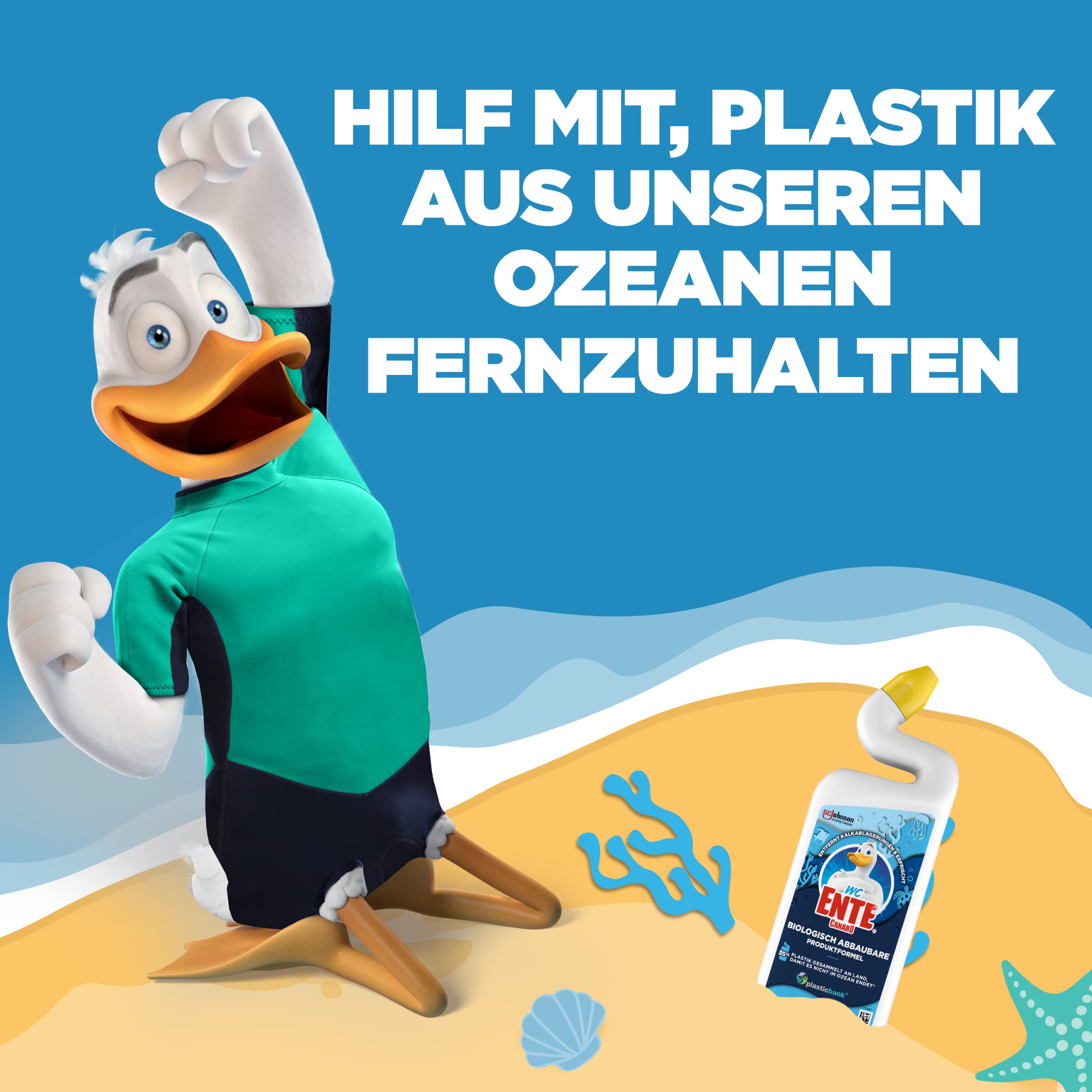 Der WC-Ente® Biologisch Abbaubare Produktformel WC-Reiniger macht Ihre Toilette hygienisch rein und beugt bei regelmässiger Anwendung Urinstein und Kalk vor. Die Flasche des WC-Ente® Biologisch Abbaubare Produktformel Hygienereiniger besteht aus 50% Plastik, welches an Land in Meeresnähe gesammelt wurde, um zu verhindern, dass es im Ozean endet.
