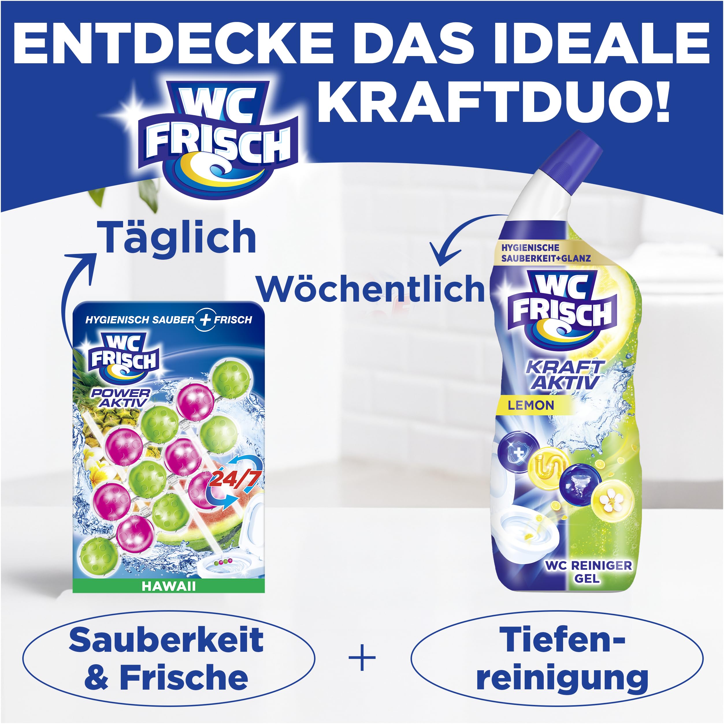 *nach mehreren Spülungen im Vergleich zu unbehandelten OberflächenAnwendung1. WC Duftstein an den Rand der Toilettenschüssel hängen.2. Toilettenstein dem Wasserfluss anpassen und Sauberkeit sowie einen intensiven Toilettenduft mit jeder Spülung erleben.3. WC Duftspüler ersetzen, wenn die Kugeln leer sind.Die Marke WC FRISCHWC FRISCH, der Experte für Toilettenreinigung, bietet viele Lösungen, um Ihnen das Leben im Bereich Sauberkeit und Frische in Ihrer Toilette zu erleichtern. Seit der Markteinführung des ersten WC-Steins im Jahre 1968 hat WC FRISCH nie aufgehört, den Markt der Toilettenreiniger und -erfrischer zu revolutionieren. Die Produkte von WC FRISCH helfen Ihnen, die Toilette sauber und frisch zu halten – bis zu 4 Wochen.