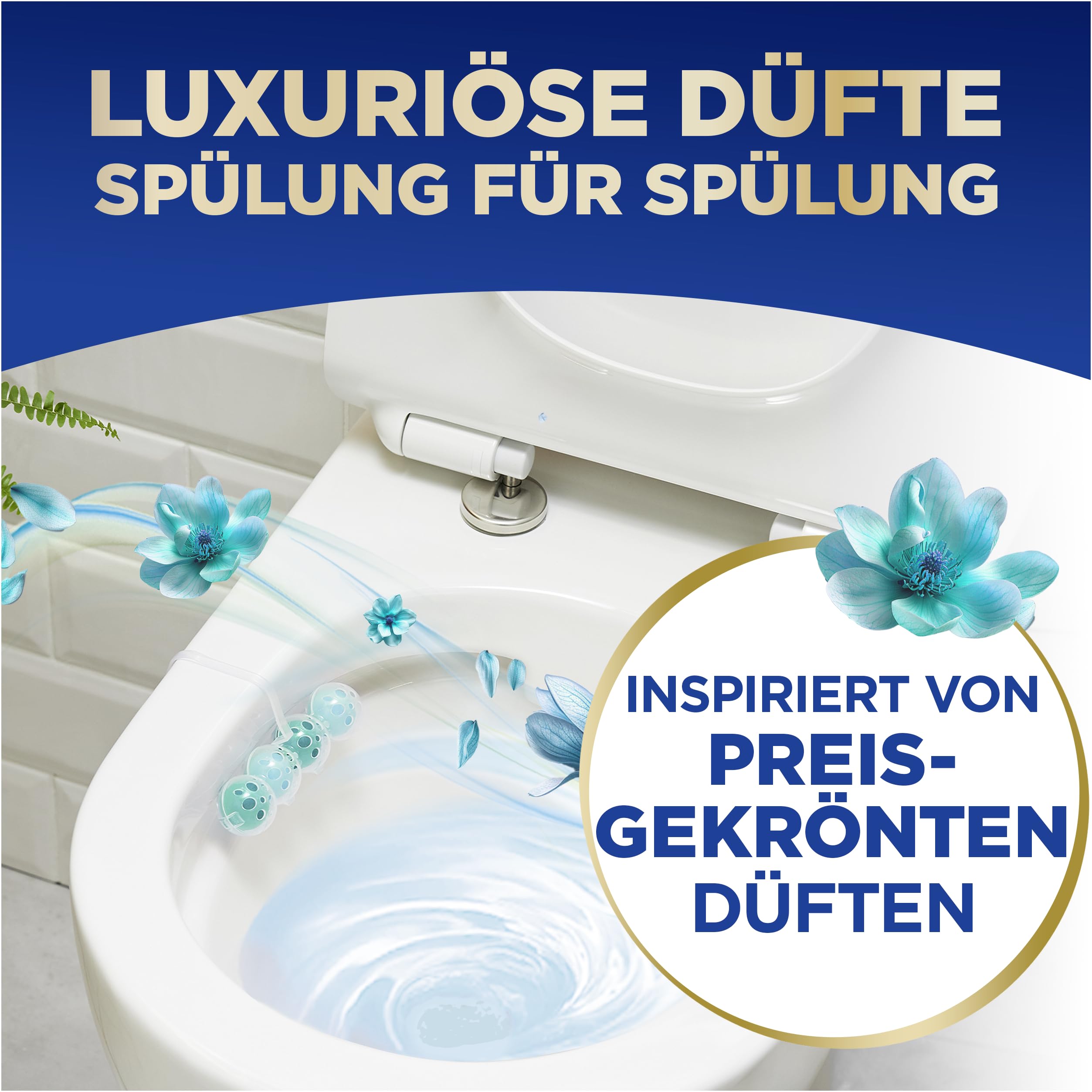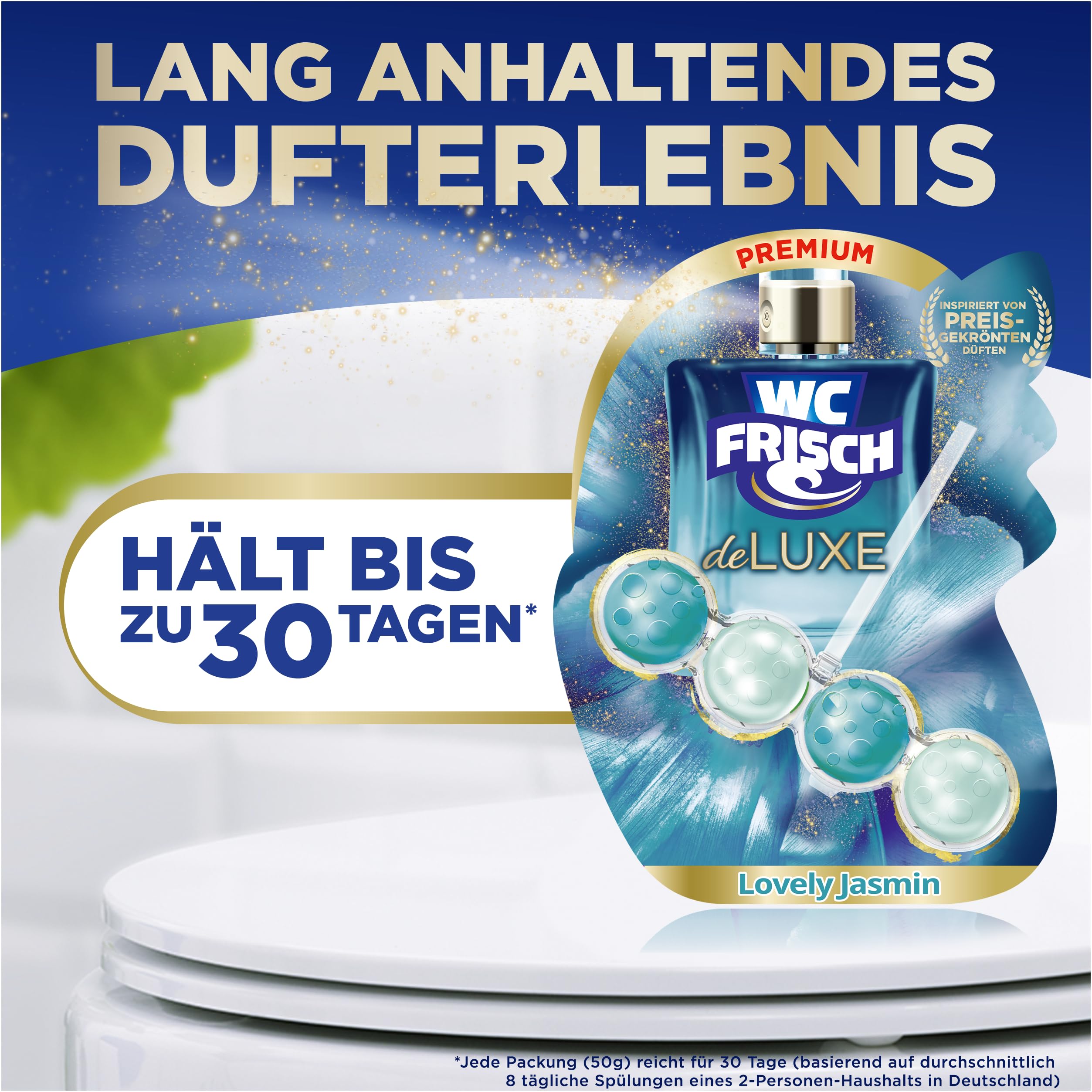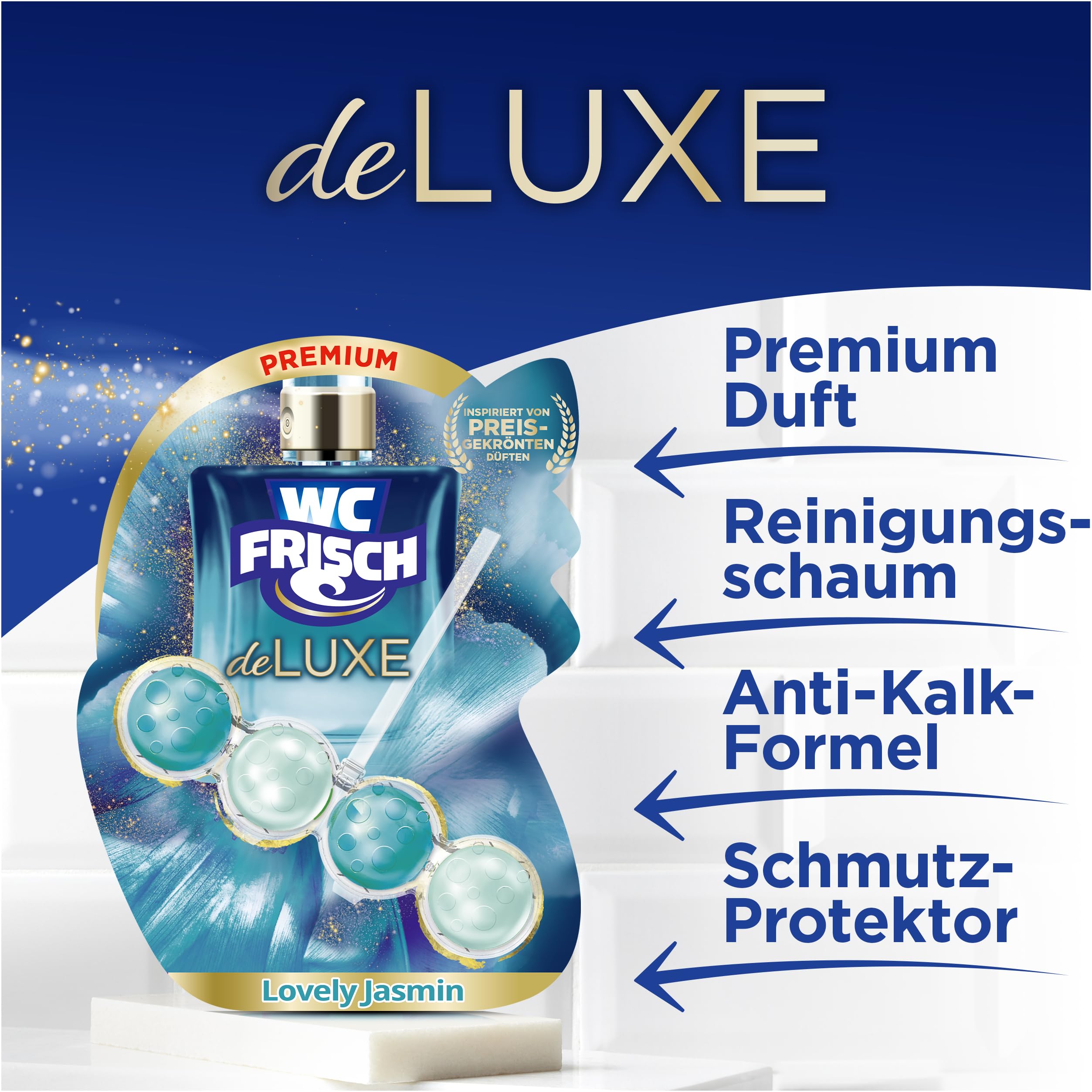 WC FRISCH DeLuxe Lovely Jasmin Toilettenspüler (50 g) – 4-fach Reinigung & Parfüm-Boost mit jeder SpülungDer WC FRISCH DeLuxe Toilettenreiniger verfügt über eine verbesserte Formel mit Parfüm Perlen, welche bei jeder Spülung aktiviert werden und einen zusätzlichen Boost für einen noch intensiveren Duft freisetzen. Inspiriert von edlen Parfüms!Die Formel besteht aus einer 4-fachen Aktivstoff-Kombination: Das edle Parfüm sorgt für einen lang anhaltenden, frischen und eleganten Duft im Badezimmer, der aktive Reinigungsschaum sorgt für eine Reinigung bei jeder Spülung, die Anti-Kalk-Formel verhindert die Kalkbildung und der Schmutz Protektor verhindert, dass sich neuer Schmutz festsetzt.Die Produktvorteile im Detail:Mit Parfüm Perlen für einen Parfüm-Boost mit jeder Spülung