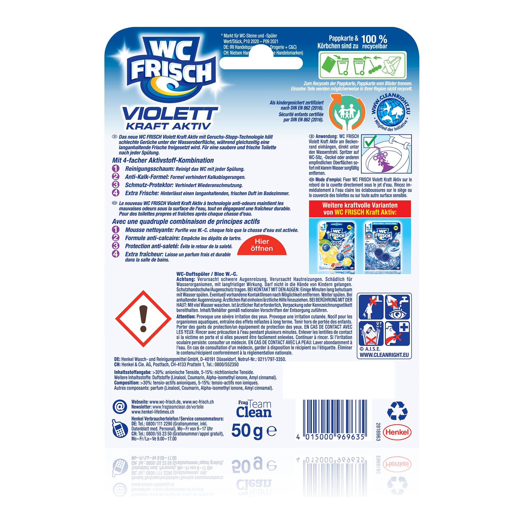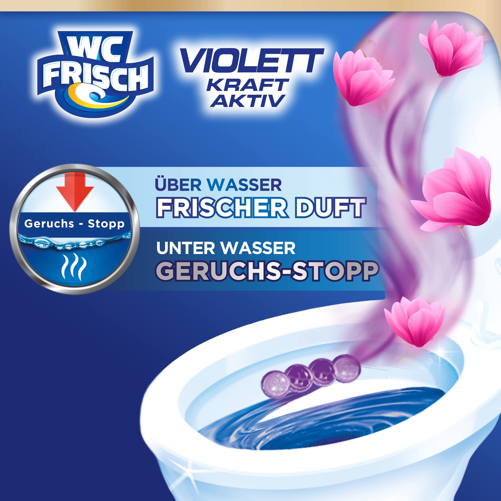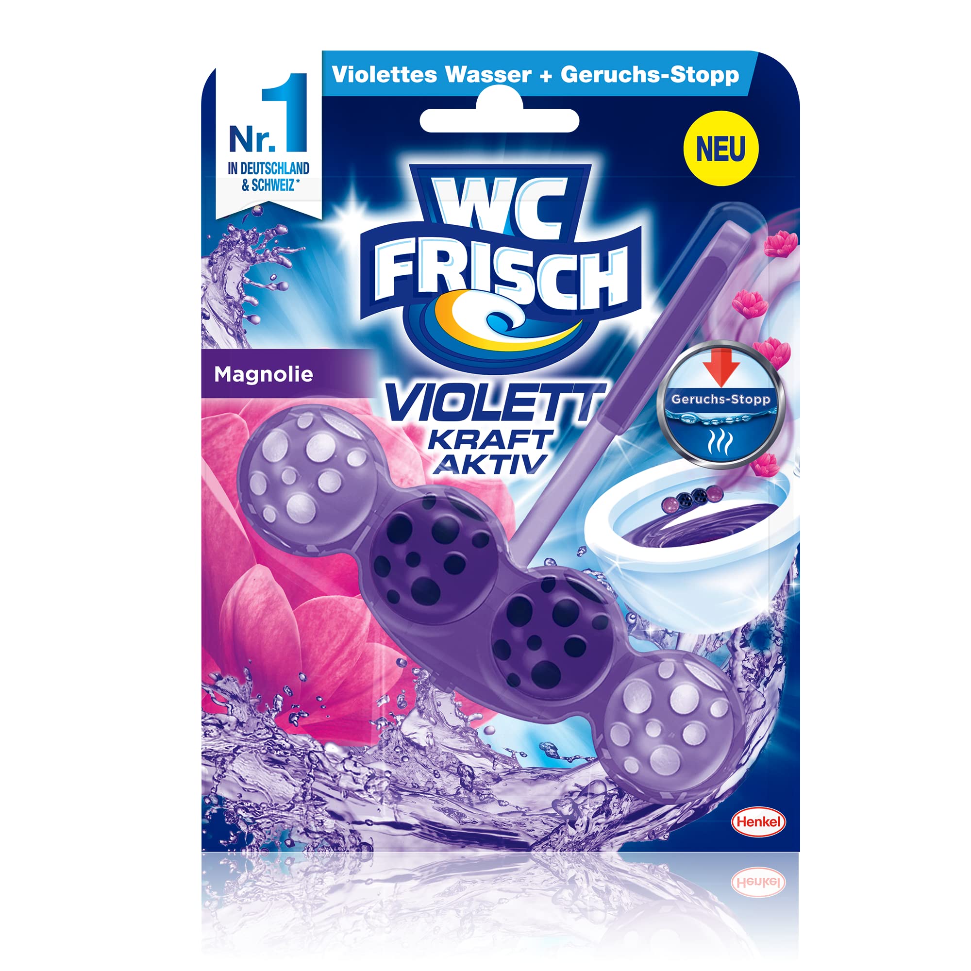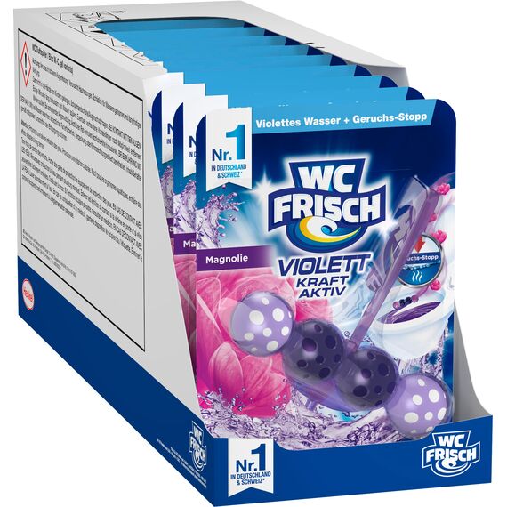 WC FRISCH Violett Kraft Aktiv Violettspüler – verbesserte Formel mit Geruchs-Stopp EffektWäre es nicht wunderbar, wenn die Toilette immer sauber und frisch wie eine violette Oase wäre? Dank der Violett-Wasser-Kugeln erhält der WC FRISCH Kraft Aktiv Toilettenspüler mit verbesserter Formel sichtbar die Sauberkeit und Frische der Toilette sogar zwischen den Spülungen. Aber wie? Beim Spülen sammelt das Körbchen des Toilettensteins das Wasser, reichert es mit Aktiv-Inhaltsstoffen an und lässt es am Ende der Spülung frei. Der Beweis hierfür ist das violett gefärbte Wasser, welches in der Toilette zurückbleibt: für beste Sauberkeit und Frische sogar zwischen den Spülungen. Die innovative Geruchs-Stopp-Formel hält Gerüche unter Wasser und sorgt für intensive Frische.Mit der WC FRISCH 4-fach Aktivstoff-Kombination schützen die Toilettensteine vor Kalkablagerungen und bieten Reinigungsschaum, Schmutz-Protektor und Extra Frische in der Toilette. Mit seinem dezenten Design und seinen tollen Farben passt WC FRISCH ideal unter den Toilettenrand. WC FRISCH Violettspüler: mehr als ein üblicher WC Stein.Die Produktvorteile im Detail:Geruchs-Stopp-Formel