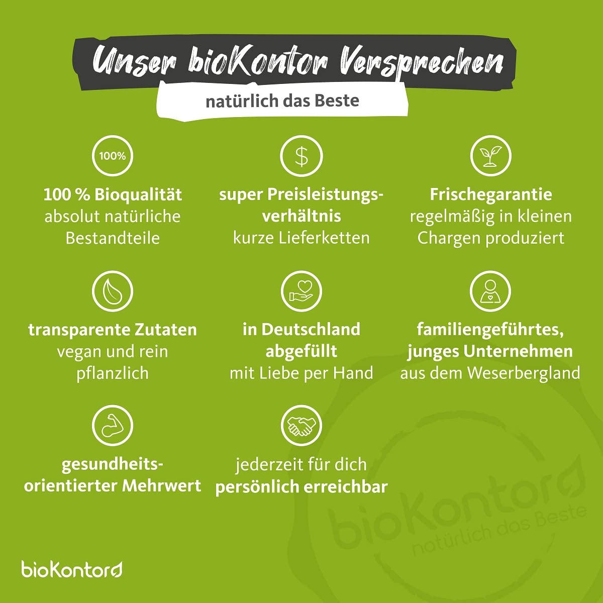 - QUALITÄT & ZUFRIEDENHEIT: bioKontor ist bio-zertifiziert und wird folglich regelmässig auf Einhaltung der geltenden Standards hin überprüft.