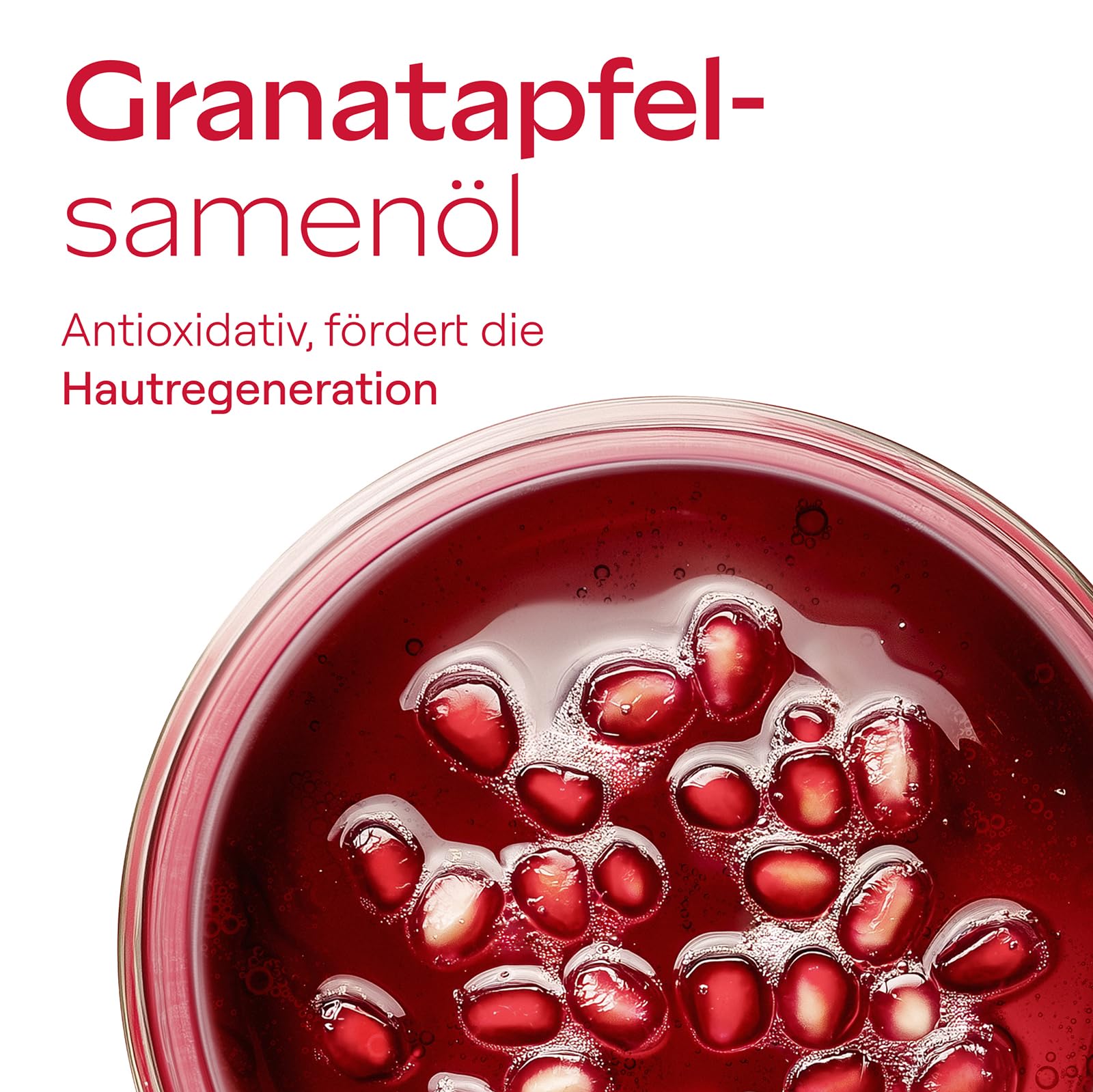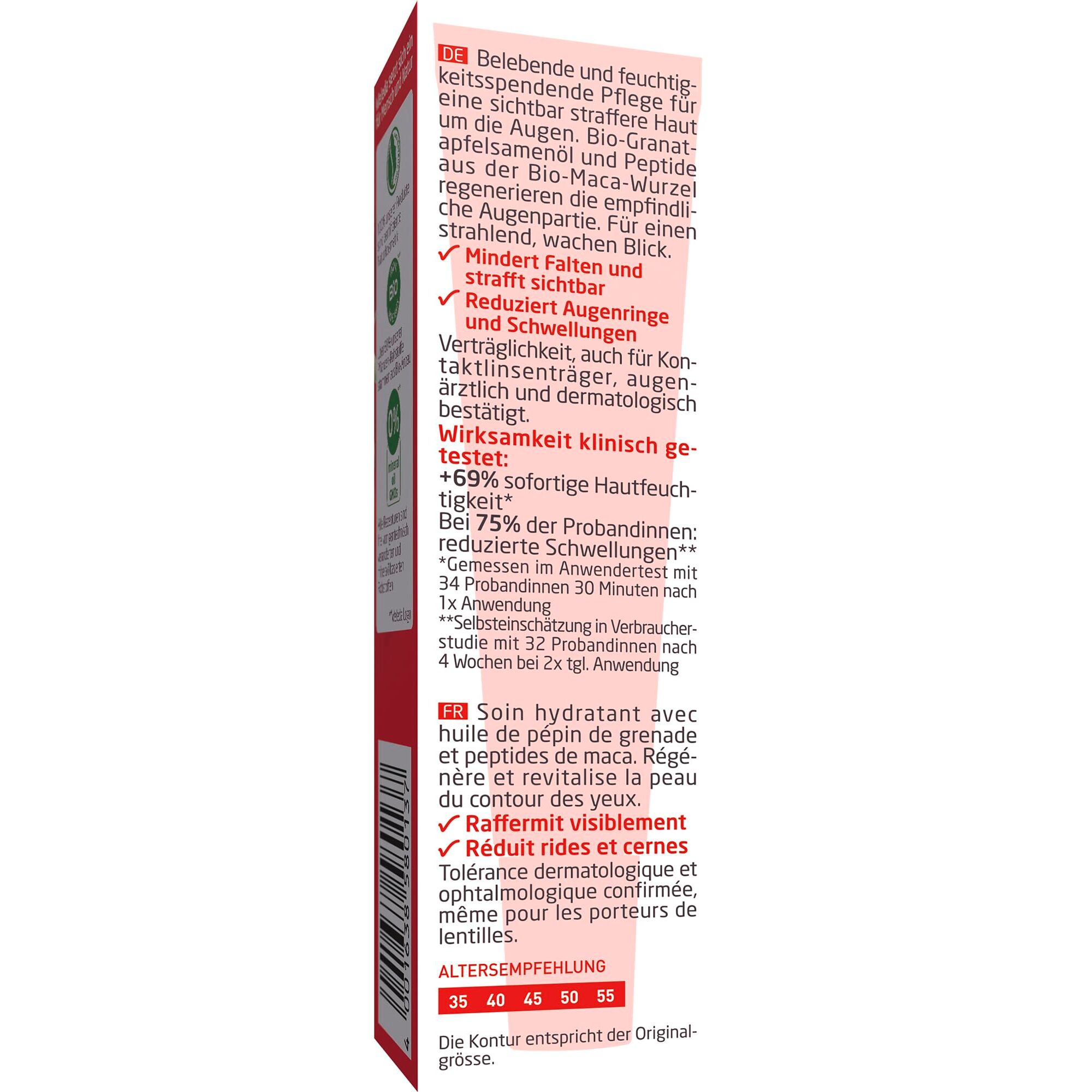 Während antioxidativ wirkendes Bio Granatapfelsamenöl die empfindliche Augenpartie vor freien Radikalen schützt und die Neubildung von Zellen anregt, unterstützen Peptide der Bio Maca-Wurzel den hauteigenen Zellregenerationsprozess, fördern die Elastizität der Haut und reduzieren Falten, Augenringe und Schwellungen.
