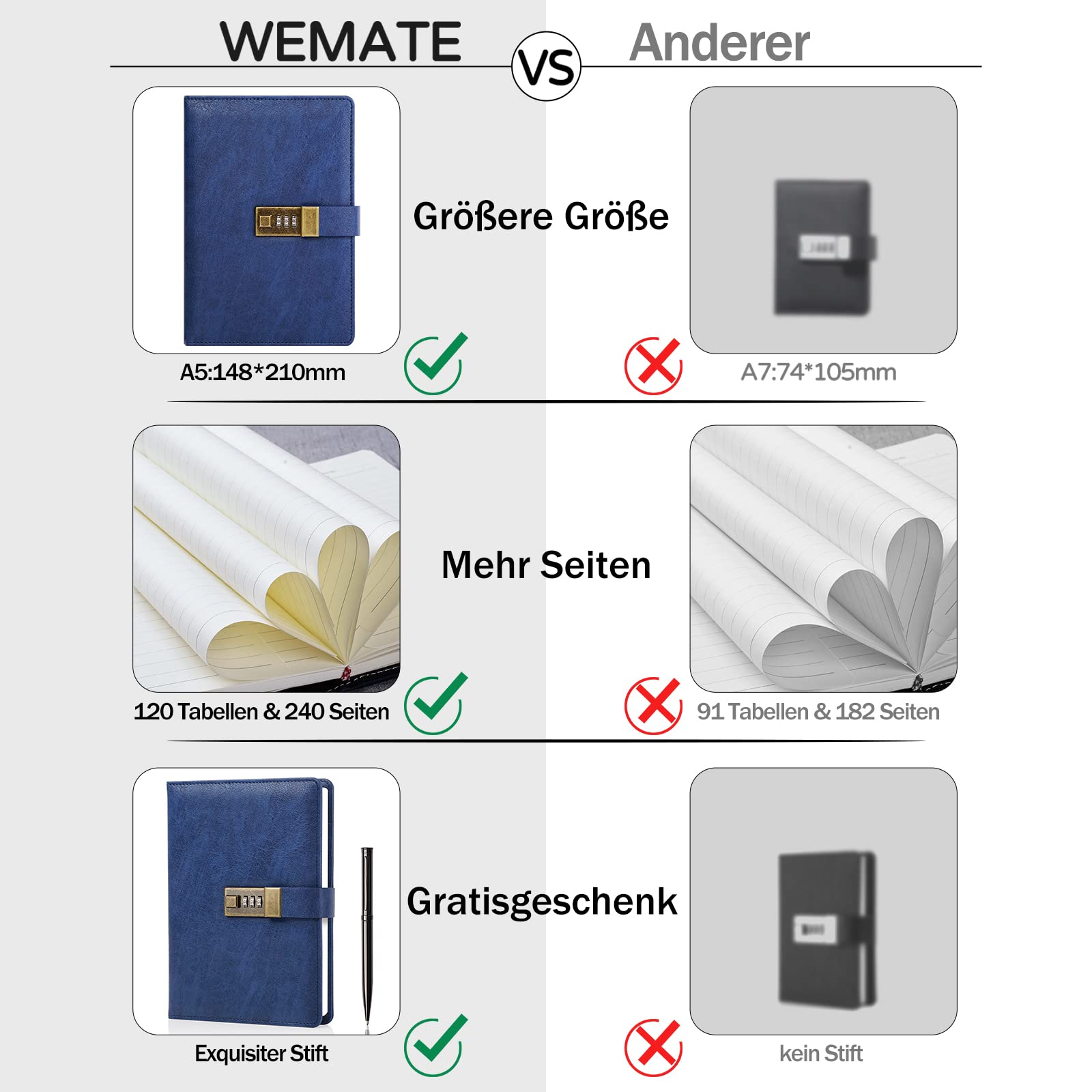 Wemate-Tagebuch mit Schloss, A5-Pu-Leder-Tagebuch mit Schloss, 240 Seiten, Vintage-Schloss-Tagebuch mit Stift und Geschenkbox, abschliessbares Tagebuch für Frauen und Männer, 8,6 x 5,8 Zoll braunes Tagebuch mit Schloss – Wemate Lock Journal-Notizbuch ist aus einem kreativen antiken Metall gestaltet Ausgestattet mit einer Passwortsperre ist dieses abschliessbare Tagebuch Ihr eigener Geheimraum, egal ob es sich um Geschäftsgeheimnisse oder persönliche Privatsphäre handelt, der vollständig geschützt werden kann. Passende Grösse für die meisten Bedürfnisse – das Tagebuch mit Schloss verfügt über 120 Blatt und 240 Seiten, die nachfüllbar und dick sind, um ein Auslaufen von Tinte zu vermeiden. Es hat die Grösse A5, 8,5" x 5,7", und die Kombination aus horizontalen Linien und leeren Seiten erfüllt perfekt verschiedene Schreibbedürfnisse und ermöglicht es Ihnen, mehr Erinnerungen und Geheimnisse festzuhalten. Hochwertiges Leder – Die Oberfläche besteht aus hochwertigem PU-Leder mit einer einzigartigen Textur. Es sieht Vintage und stilvoll aus und fühlt sich so weich an, dass Sie es vielleicht gar nicht mehr aus der Hand legen oder in Ihre Tasche stecken möchten. Vintage-Schloss – Das Vintage-Schloss ist einfach zu bedienen, das Passwort besteht aus drei Zahlen von 0 bis 9 und Hunderte von Passwortkombinationen machen Ihr abschliessbares Tagebuch sicher und privat genug. Das anfängliche Passwort lautet 0-0-0, und Sie können der Anleitungskarte folgen, um Ihr eigenes Passwort zu ändern. Perfektes Geschenk – jedes Lock-Tagebuch wird mit einem Metallstift in einer schönen Geschenkbox geliefert, die sich ideal als Geschenk für Freunde, Familie, Liebhaber usw. eignet.