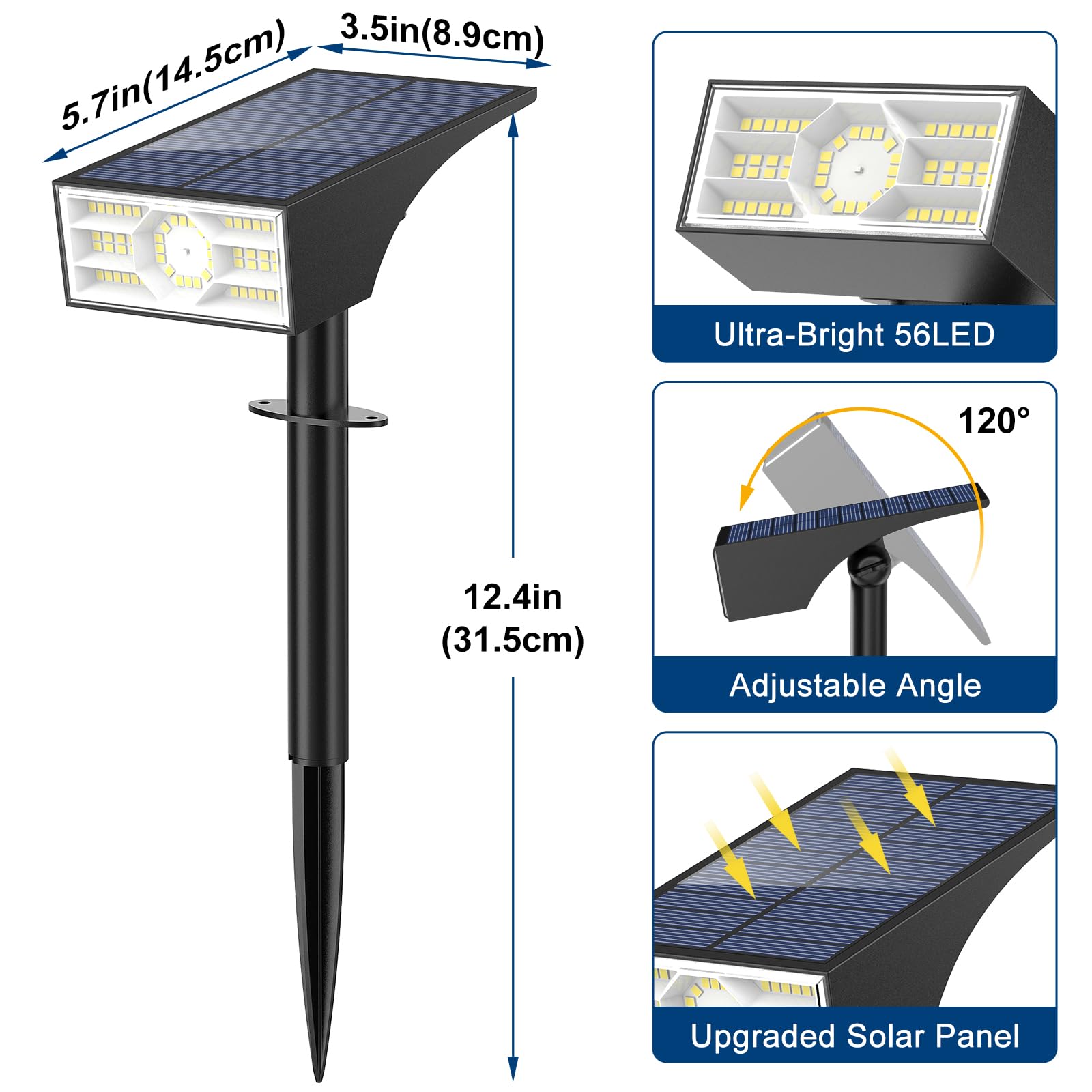WENATY Solarlampen für Aussen, 56 LED Solarstrahler für Aussen Garten 6500K Kaltweiss LED Solar Strahler, 4 Helligkeitsmodi Solar Gartenleuchten IP65 Wasserdicht Solarleuchten für Weg Hof Gehweg【2 Stück】