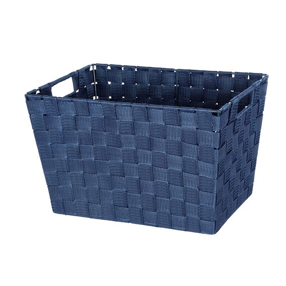 Der trendige, dunkelblaue Korb in Flechtoptik ist der ideale Aufbewahrungsort für Utensilien im gesamten Haushalt. Im Badezimmer sorgt der Korb aus hochwertigem Kunststoff-Geflecht (Polypropylen) für Stil und Ordnung bei der Aufbewahrung von Gästehandtüchern oder Bad-Accessoires. Im Kinderzimmer können kleine Spielzeugteile übersichtlich gesammelt werden. Auch in Kleiderschränken hilft die dekorative Box, Wäsche und Socken geordnet zu lagern. In der Küche finden Küchenutensilien einen attraktiven Platz. Bitte beachten Sie, dass sich die Massangaben auf die breitesten Stellen an der Oberseite des Korbes beziehen. Aufgrund der konischen Form sind die Badkörbe an der Unterseite etwas schmaler. Material: 100 % Polypropylen - Farbe: Dunkelblau - Masse B/H/T: 35 cm x 22 cm x 22,5 cm - Nettogewicht: 428 g