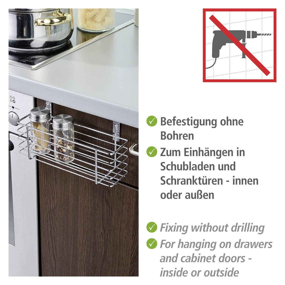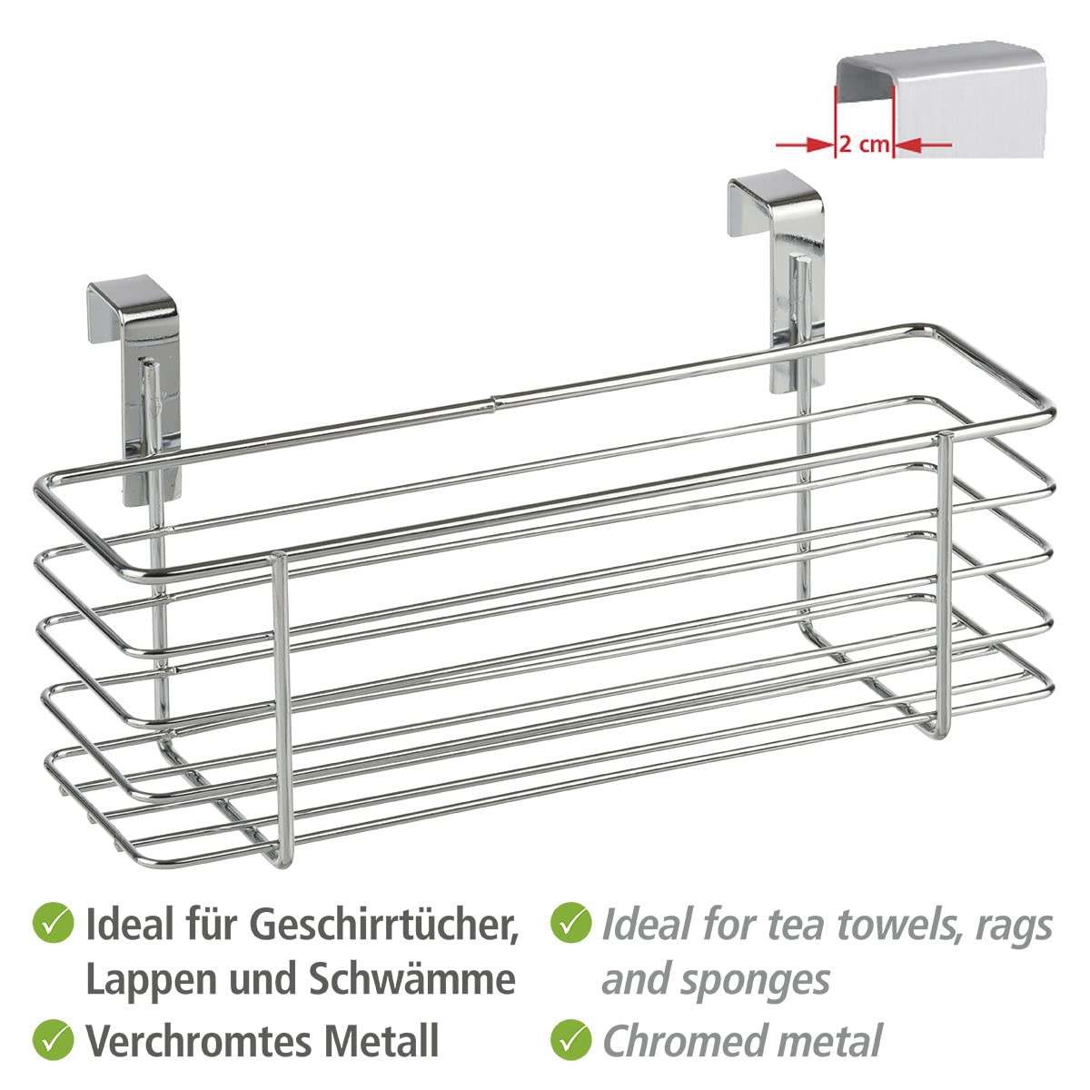 Besonders eignet sich das Multi-Talent für die übersichtliche und griffbereite Aufbewahrung von allen schmalen Gegenständen wie Lappen, Schwämmen und vielem mehr im Küchenschrank unter der Spüle. Der dekorative Sammler aus verchromtem Metall wird einfach an Schublade oder Schranktüre innen oder aussen eingehängt.