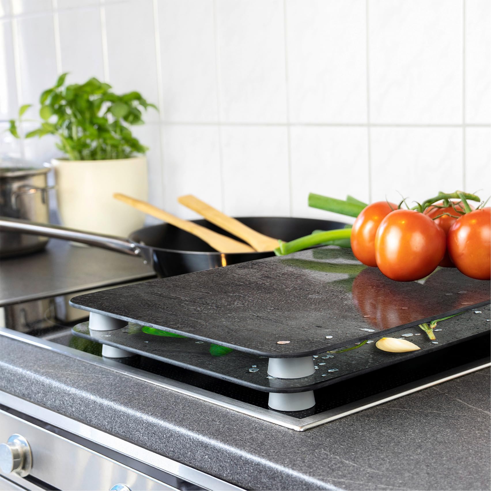 Sie können die Kochfeldabdeckungen ausserdem als Erweiterung Ihrer Arbeitsfläche auf und neben dem Herd nutzen – besonders praktisch in kleinen Küchen, in denen jeder Zentimeter zählt. Nutzen Sie die Glasplatten als Schneidebrett zur Vorbereitung von Speisen oder als Servierplatten beim Anrichten von Buffets. Die kratzfeste, porenfreie Oberfläche der Abdeckungen ist hierbei besonders hygienisch, da sie das Einnisten von Bakterien und Gerüchen verhindert und leicht zu reinigen ist.