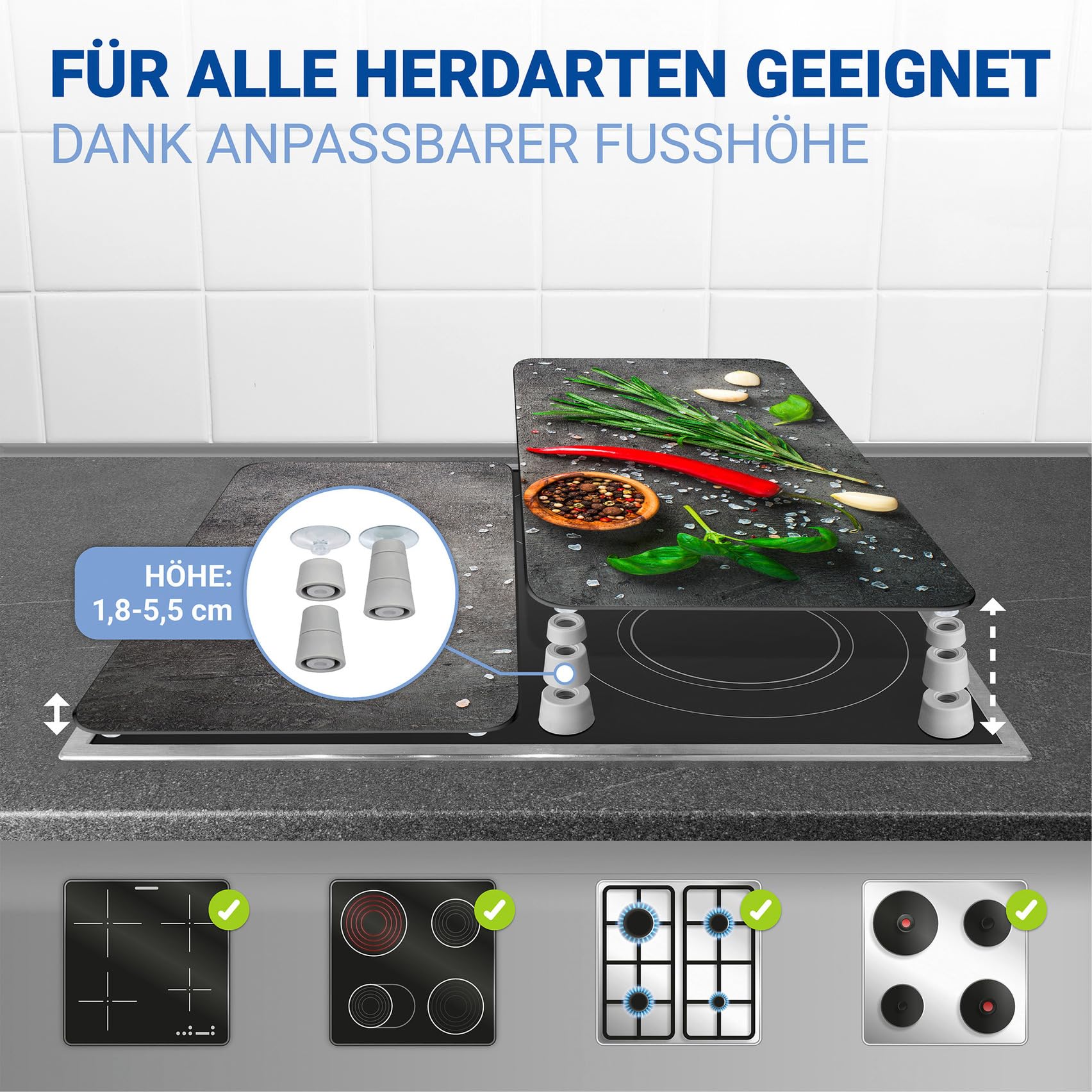 Ein besonderer Vorteil: Dank der vier höhenverstellbaren, rutschfesten Füsse pro Platte sind die Abdeckplatten flexibel für alle Herdarten geeignet, sei es Induktion, Glaskeramik, Elektro oder Gas.
