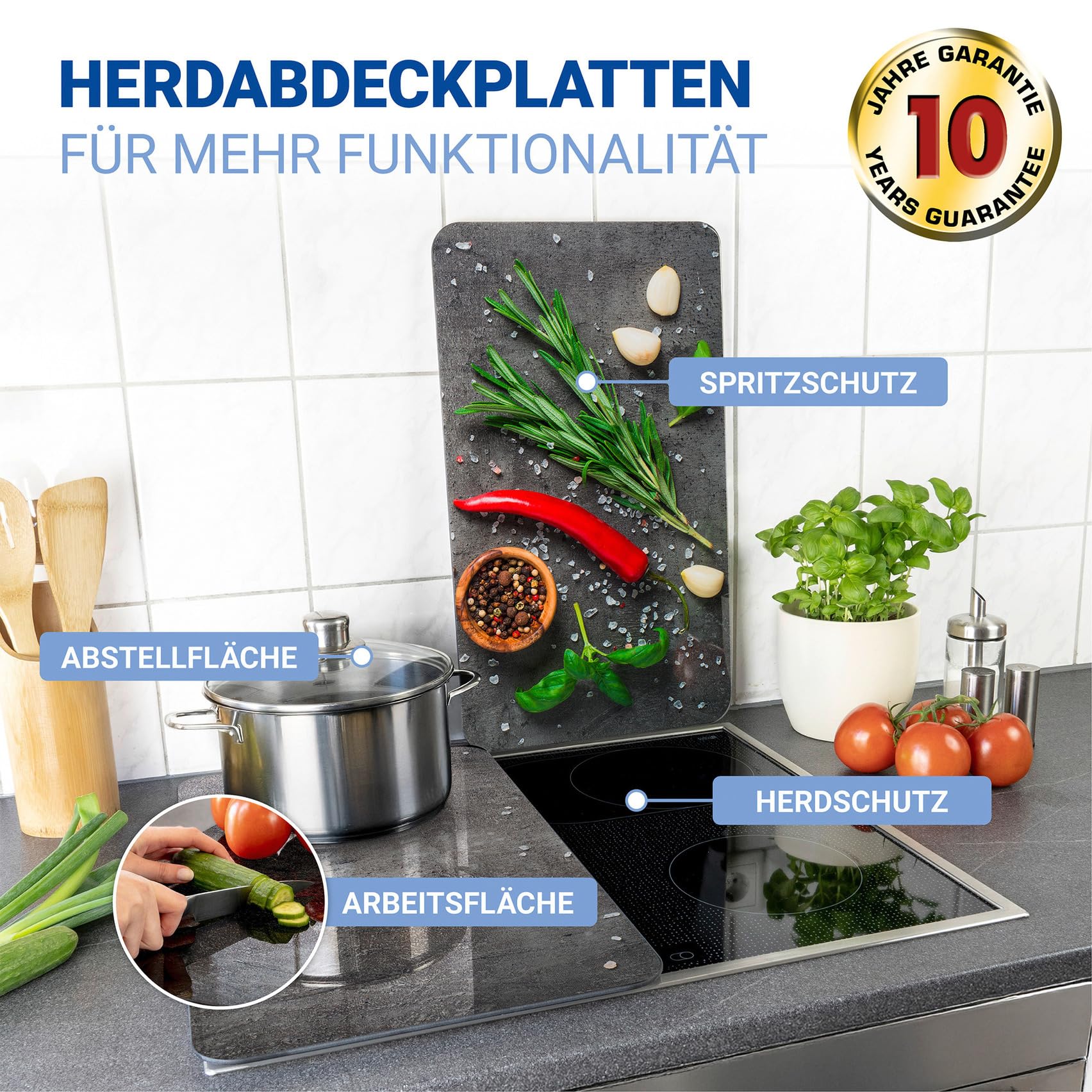 Mit den robusten Herdabdeckungen aus schlagfestem Sicherheitsglas bewahren Sie Ihr Kochfeld dekorativ vor Schmutz und Beschädigungen, während Sie es gleichzeitig vor neugierigen Blicken verbergen. Zusätzlich können Sie die hitzebeständigen Glasplatten auch als Spritzschutz beim Kochen hinter dem Herd aufstellen.