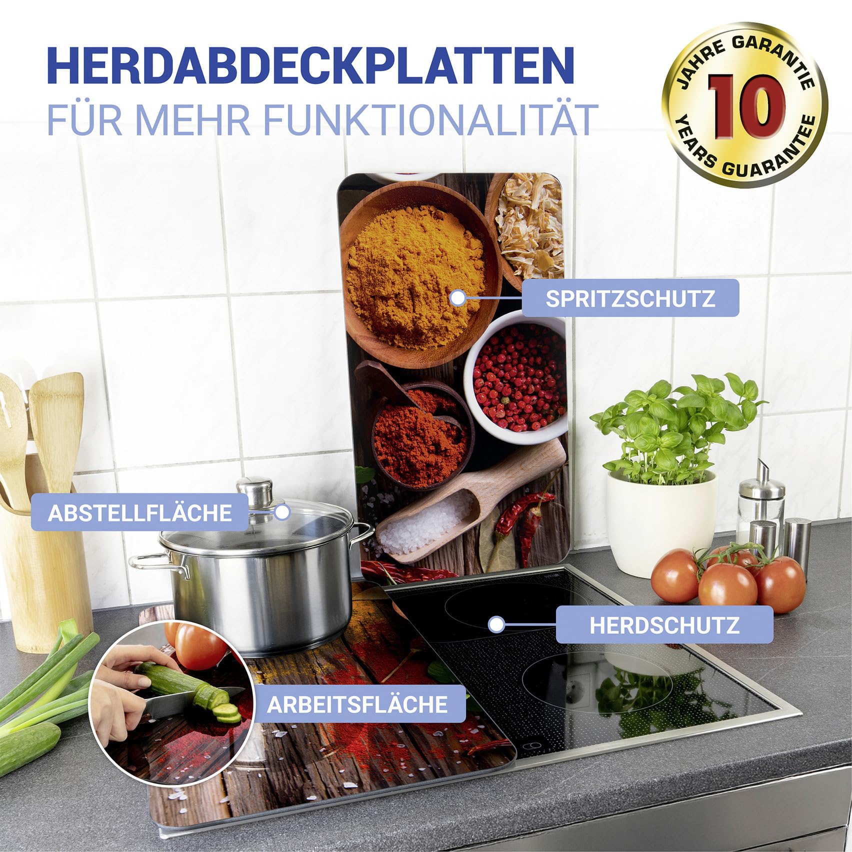 Mit den robusten Herdabdeckungen aus schlagfestem Sicherheitsglas bewahren Sie Ihr Kochfeld dekorativ vor Schmutz und Beschädigungen, während Sie es gleichzeitig vor neugierigen Blicken verbergen. Zusätzlich können Sie die hitzebeständigen Glasplatten auch als Spritzschutz beim Kochen hinter dem Herd aufstellen.