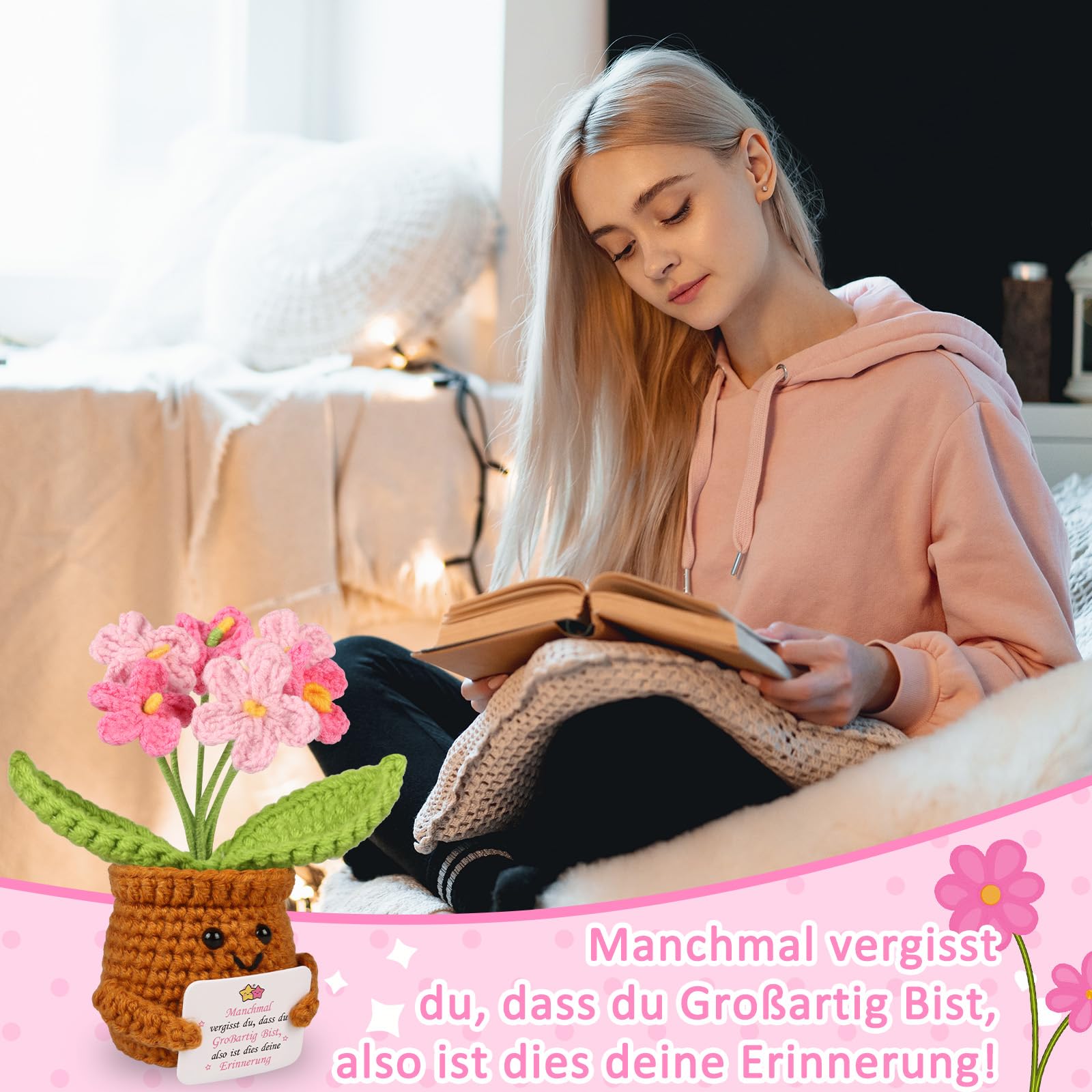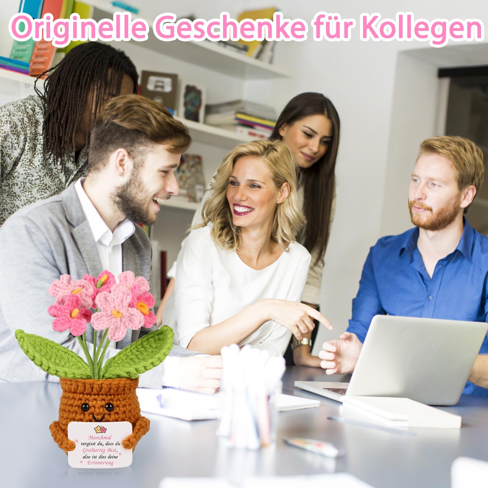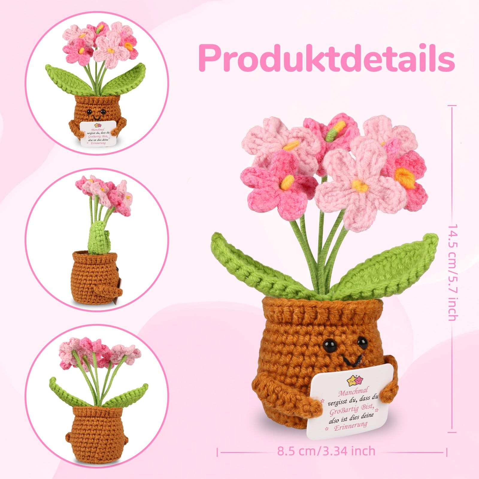 WenmthG Gestrickte Rosa Vergissmeinnicht Deutsch Glücksbringer Anti Stress Kleines Geschenk für Schwester Freundin Frauen Kollegen Freunde, Beste Freundin Geschenke Positive Kartoffel Deutsch Ersatz