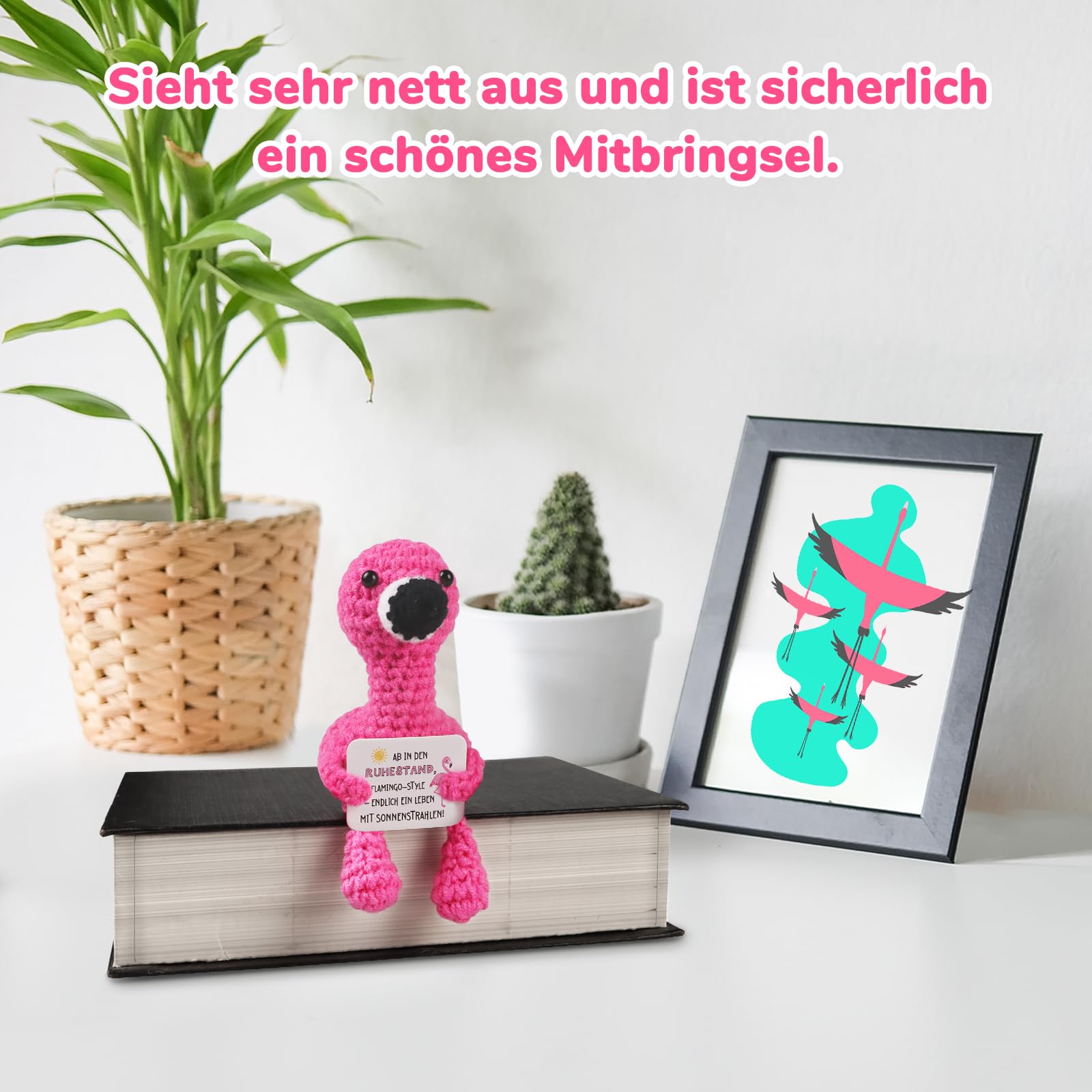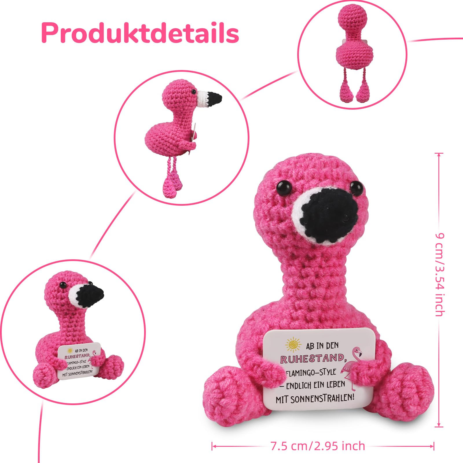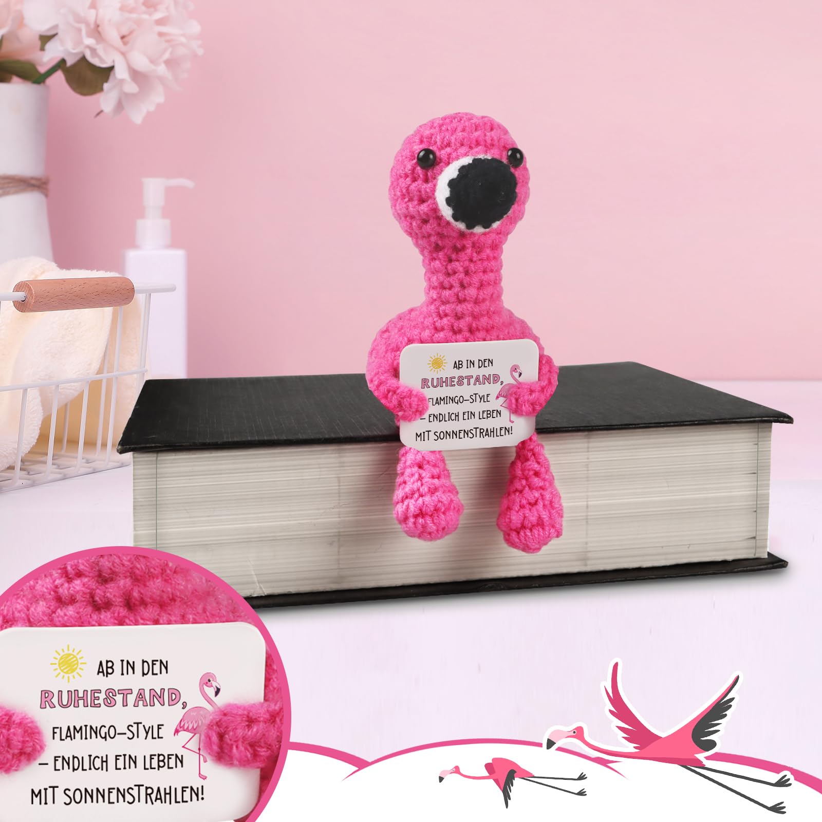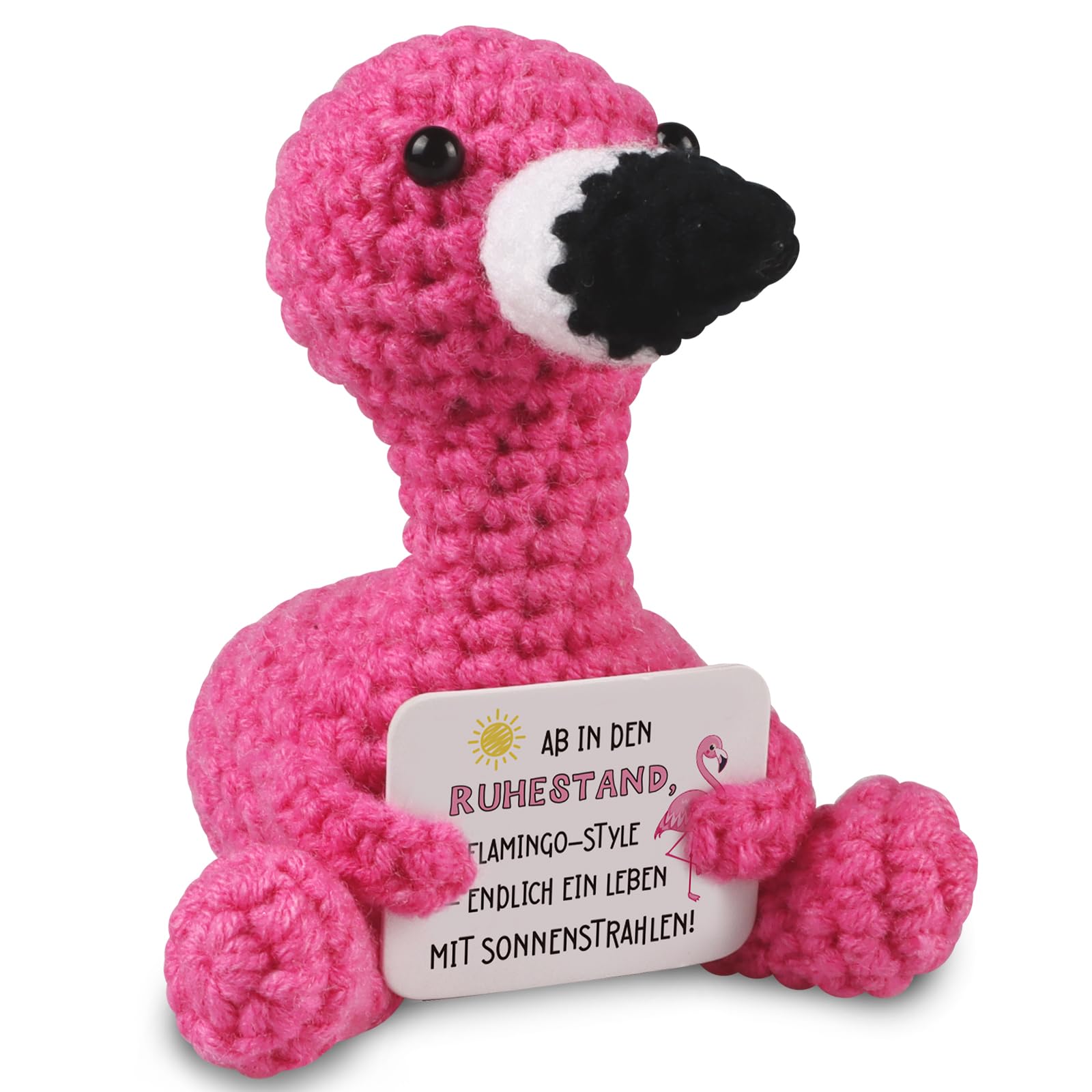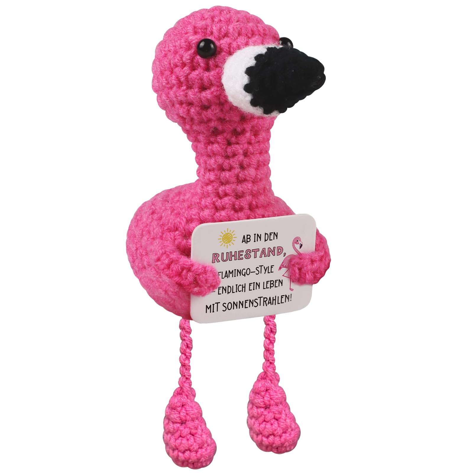 • Original-Design Gestrickte Flamingo-Puppe Geschenke zum Ruhestand, hält einen Karton Zeichen mit dem Wort “AB IN DEN RUHESTAAND FLAMINGO-STYLE ENDLICH EIN LEBEN MIT SONNENSTRANHLEN” sieht sehr niedlich, das perfekte Geschenk für Papa Opa Mama Oma Freundin und Kollegin.