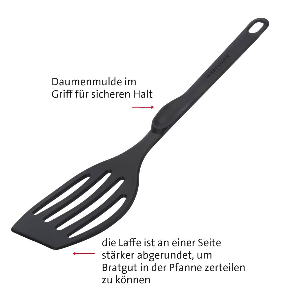 2 leichte und schmale Schlitz-Pfannenwender zum Wenden Ihrer Speisen in der Pfanne und zum Servieren am Tisch, Daumenmulde im Griff für sicheren Halt - Kein Zerkratzen von antihaftbeschichtetem Kochgeschirr durch Kunststoffmaterial, einseitig stärker abgerundete Laffe für einfaches Zerteilen von Bratgut in der Pfanne - Angenehmer Halt und ergonomisches Arbeiten durch langen Griff, platzsparend verstaubar dank Aufhänge-Öse, Hochhitzebeständig bis 270°C - Made in Germany; Langlebig, Sorgfältig solide Verarbeitung, Einfache Reinigung, Spülmaschinengeeignet - Lieferumfang: 2x Westmark Pfannenwender, Flonal Plus, 5 Jahre Garantie, Material: Kunststoff (PPA), Farbe: Schwarz, 203522E5