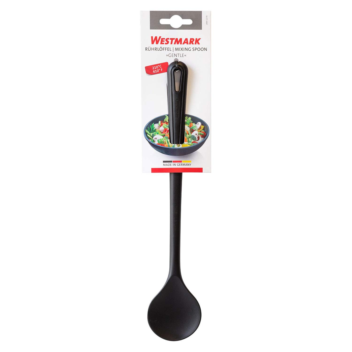 Rühr- und Kochlöffel aus Kunststoff zum Umrühren und Mischen Ihrer Speisen in der Pfanne oder dem Kochtopf, ideal geeignet für beschichtetes Kochgeschirr - Kein Zerkratzen von antihaftbeschichtetem Kochgeschirr durch Kunststoffmaterial, verfärbungsresistent, hitzebeständig bis 210 °C - Angenehmer Halt und ergonomisches Arbeiten durch langen, abgerundeten Griff, platzsparend verstaubar dank Aufhänge-Öse - Made in Germany; Langlebig, Sorgfältig solide Verarbeitung, Einfache Reinigung, Spülmaschinengeeignet - Lieferumfang: 1x Westmark Rührlöffel, Gentle, Masse: 30,2 x 5,8 x 1,1 cm, Gewicht: 50 Gramm, Material: Kunststoff (PA), Farbe: Schwarz, 28842270