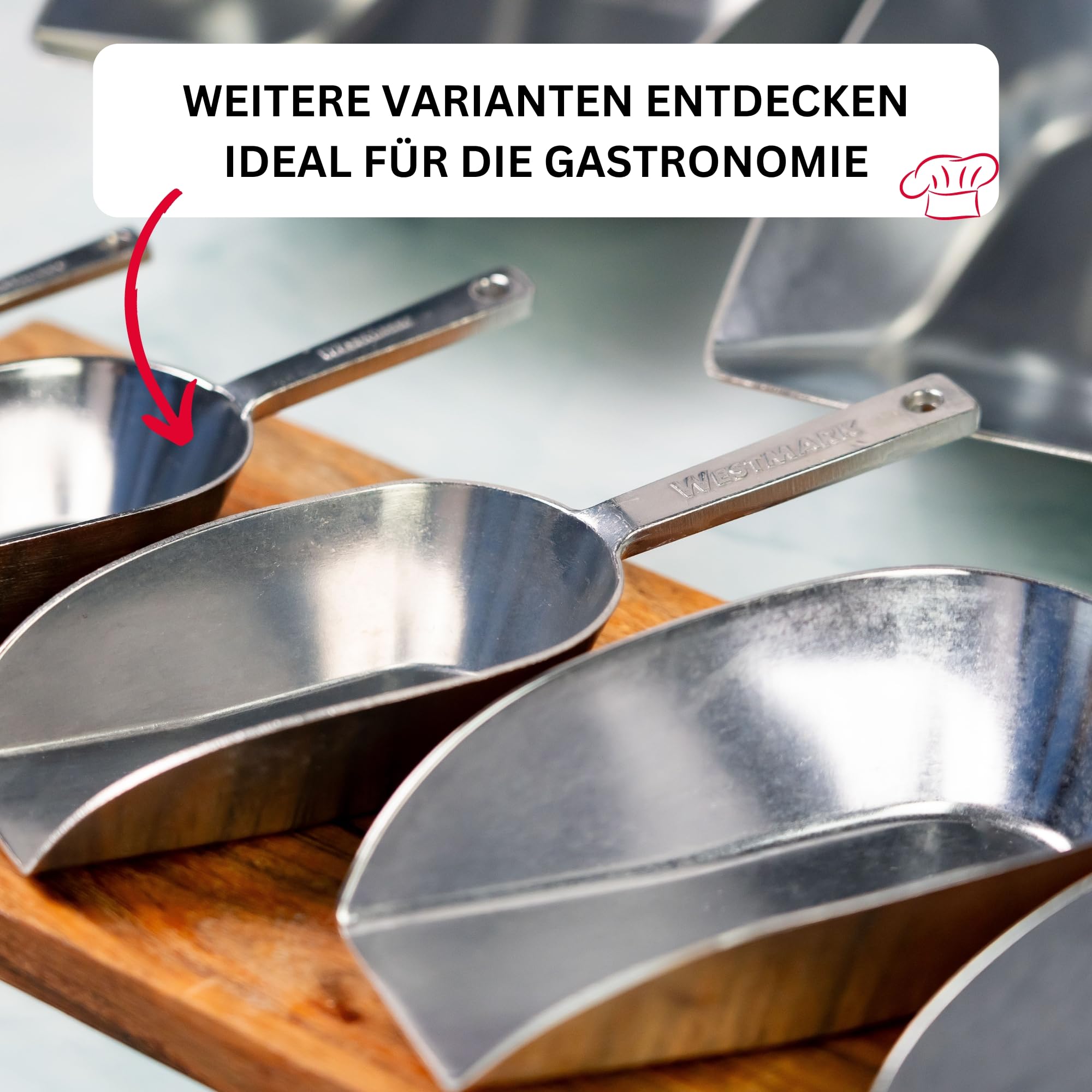 • Mittelgrosse Lebensmittel-Schaufel zum Portionieren von trockenen, pudrigen, körnigen, stückigen Lebensmitteln wie Mehl, Zucker, Gewürzen, Futter-/Sackschaufel und für Streusalz, für Profi-Bäckereien, Buffet, etc.