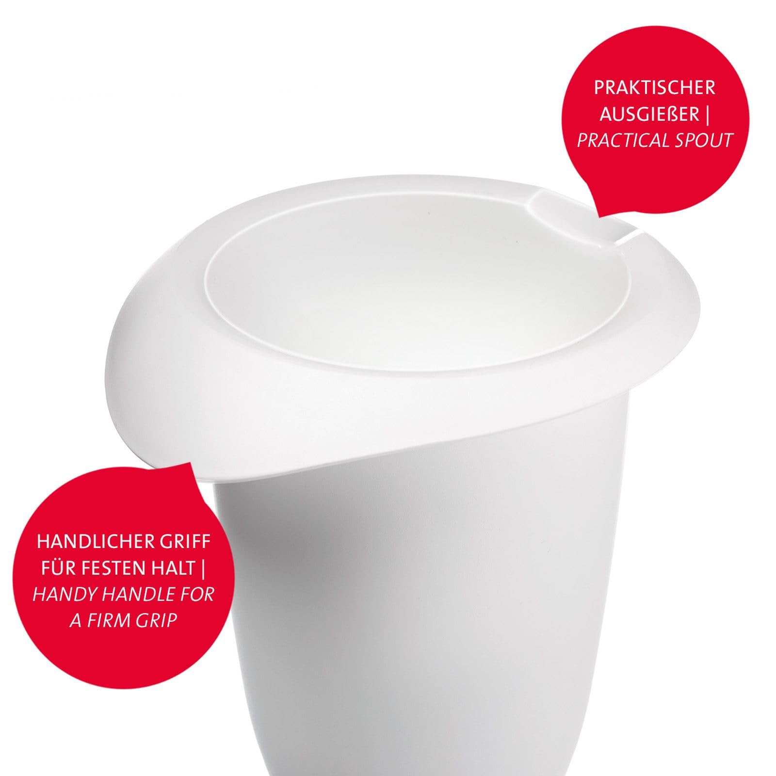 1 stabile Messkanne mit Ausgiesser zum Abmessen und Dosieren von Back- und Kochzutaten, Füllvolumen: 1 Liter, verschiedene Masseinheiten: Gramm (Mehl, Zucker, Reis, Griess), Liter/Milliliter (200-1000 ml), Mehrsprachige Skalen (DE, FR, ES, IT, NL, GB) - Aus geruchs- und geschmacksneutralem durchsichtigen Kunststoff, einfache Handhabung durch gut zu fassenden Griff, kein Verrutschen auf glatten Oberflächen durch Gummiring an der Kannenbodenunterseite - 1 Quirltopf zum Mischen und Verrühren von Koch- und Backzutaten sowie zum Steifschlagen von Eischnee und Sahne, 1 Liter, geeignet für Rührgeräte mit zwei Rührbesen-Aufsätzen, breiter Rand für gutes Greifen beim Rühren, Gummierung an Unterseite - Made in Germany: Einfaches Reinigen von Hand, spülmaschinengeeignet, BPA-frei - Lieferumfang: 1x Westmark Set, 2-tlg.: 1 Messkanne, Gerda + 1 Quirltopf, je 1 Liter, Material: Kunststoff (SAN/PP), Farbe: Weiss/Transparent, 306822E9