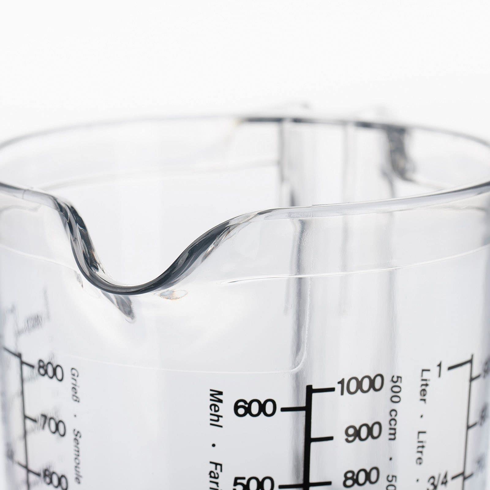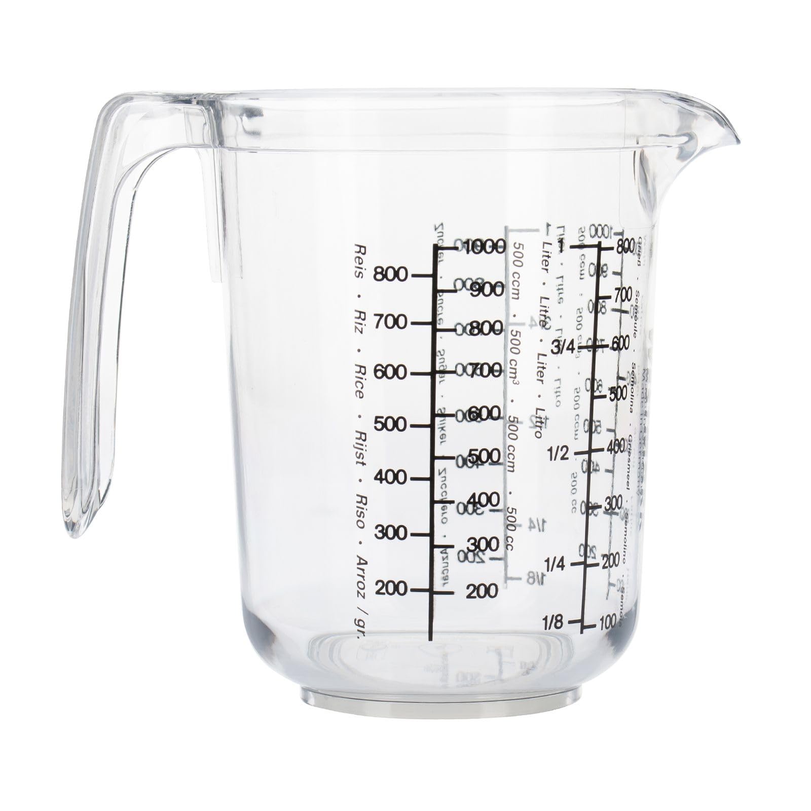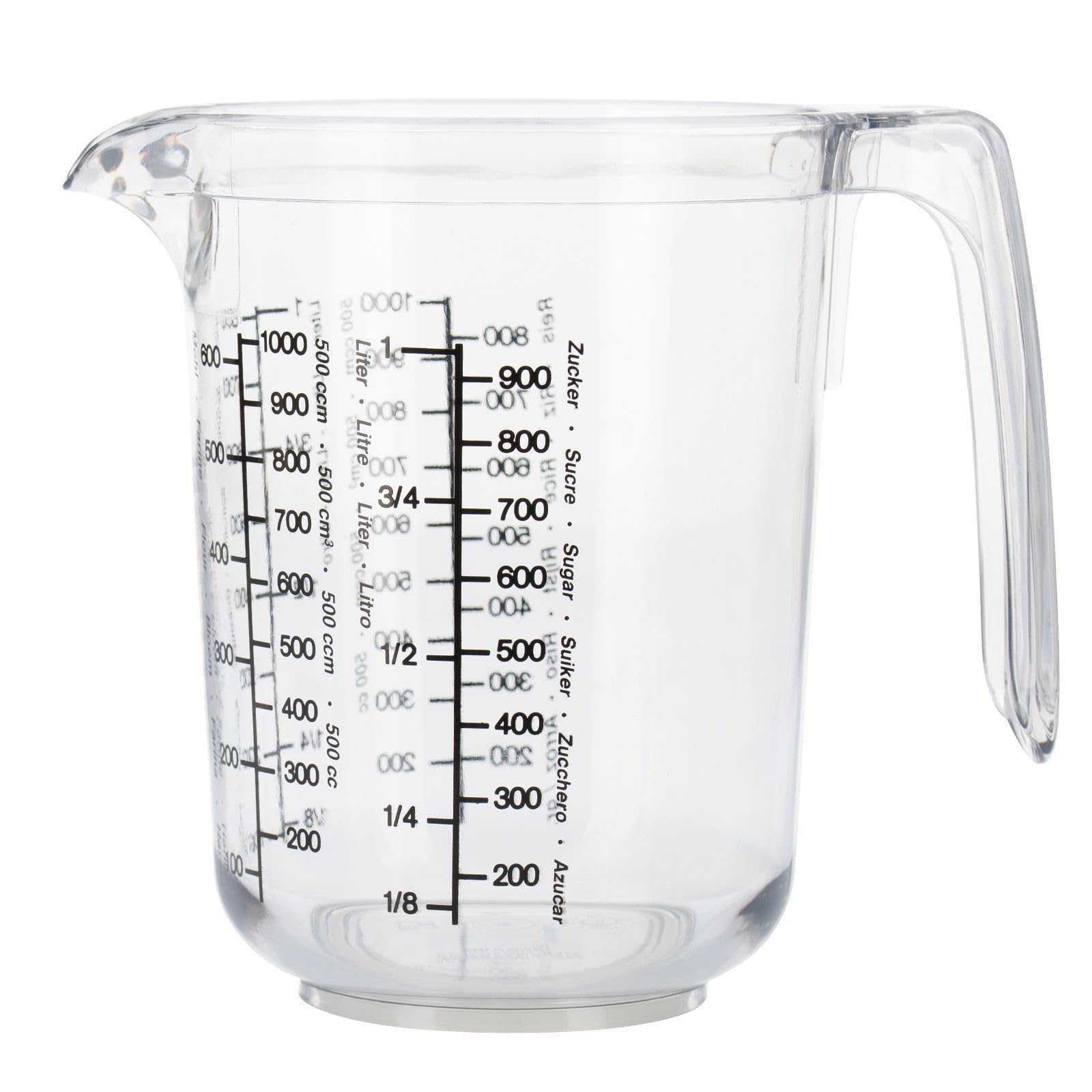 Stabile Messkanne mit Ausgiesser zum Abmessen und Dosieren von Back- und Kochzutaten, Füllvolumen: 1 Liter - Genaues Abmessen von Flüssigkeiten und trockenen Zutaten durch verschiedene Masseinheiten: Gramm (Für Mehl, Zucker, Reis und Griess) sowie Liter und Milliliter (200-1000 ml), Mehrsprachige Messskalen (DE, FR, ES, IT, NL und GB) - Messkanne aus geruchs- und geschmacksneutralem Kunststoff, einfache Handhabung durch gut zu fassenden Griff, kein Verrutschen auf glatten Oberflächen durch Gummiring an der Kannenbodenunterseite - Made in Germany, einfaches Spülen von Hand, spülmaschinengeeignet, Beschriftung kratz- und spülmaschinenfest - Lieferumfang: 1x Westmark Messkanne, Gerda, Füllvolumen: 1 Liter, Masse: 18 x 12,4 x 16,5 (H x B x T), Gewicht: 194 Gramm, Material: Kunststoff (SAN), Farbe: Transparent, 30682270