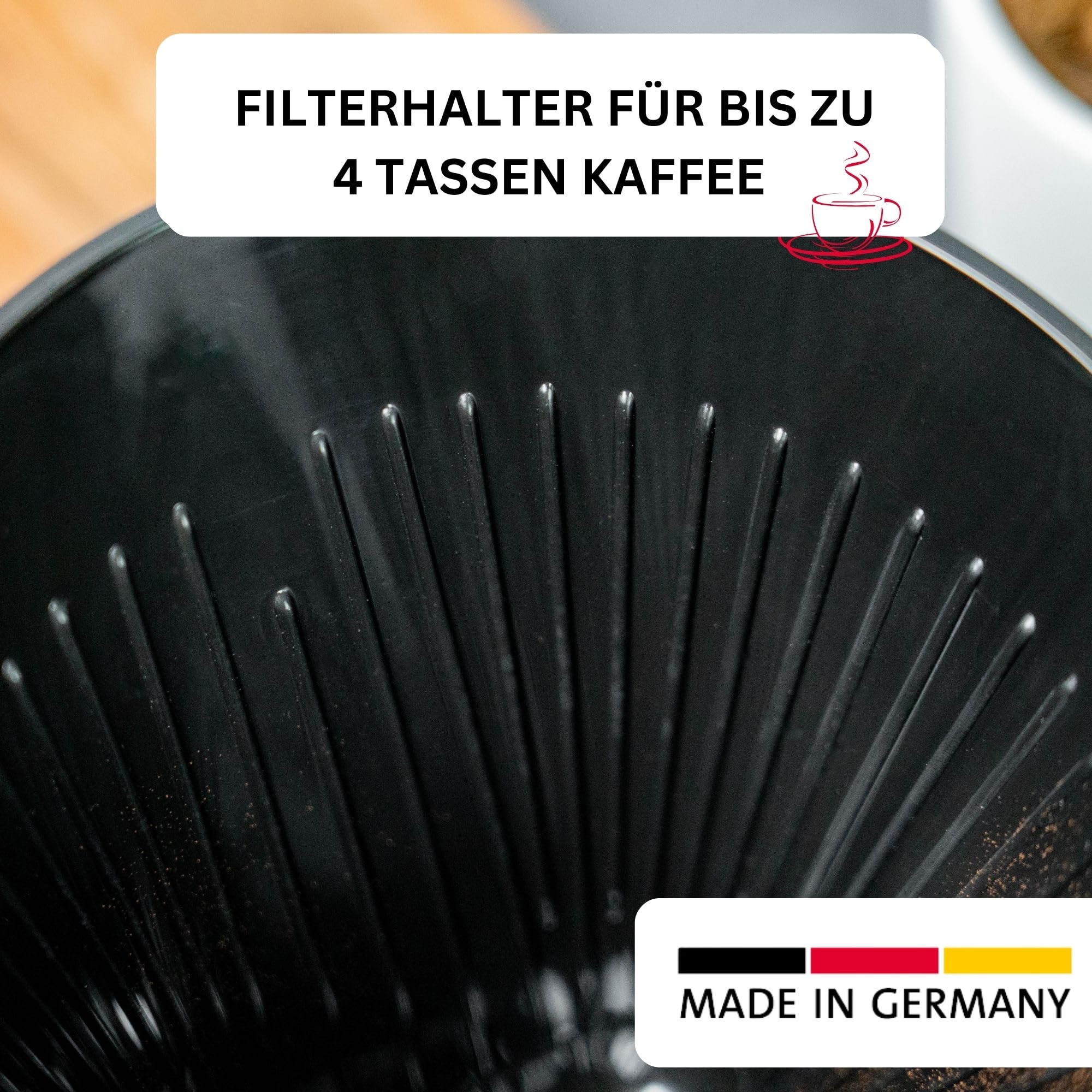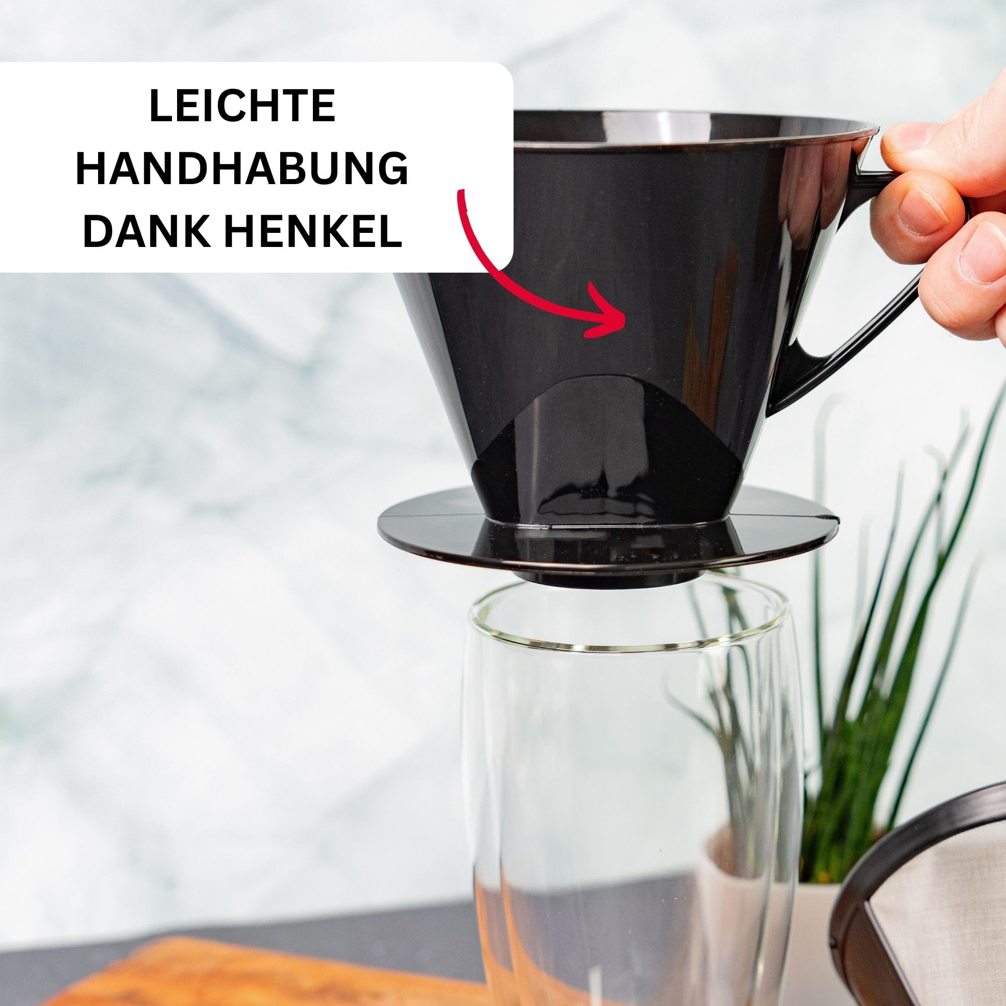 Klassischer Kaffeefilterhalter aus Kunststoff zum Handaufbrühen von Kaffeepulver für bis zu 4 Tassen frischen Kaffee, auch für losen Tee geeignet - Für Camper und Gelegenheits-Kaffeetrinker: Schonendes Aufbrühen von Hand ohne Strom für besonders aromatischen Kaffee, guter Halt auf einzelnen Tassen, Kaffee- oder Isolierkannen durch grossen Bodenaufsatz (Ø 11 cm) - Gerillte Filter-Innenseite für guten Halt der Papierfilter und für optimalen Fluss in die Tasse oder Kanne, einfaches Einsetzen von Papierfiltern (Grösse 4) und Eingiessen heissen Wassers auf das Kaffeepulver, leichte Handhabung durch schmalen Henkel - Made in Germany; Langlebig, Sorgfältig solide Verarbeitung, Einfache Reinigung, Spülmaschinengeeignet - Lieferumfang: 1x Westmark Kaffeefilter, Four, Filtergrösse 4, Abmessungen: 15,7 x 13,2 x 11 cm, Gewicht: 81 Gramm, Material: Kunststoff (PP), Farbe: Schwarz, 24442261