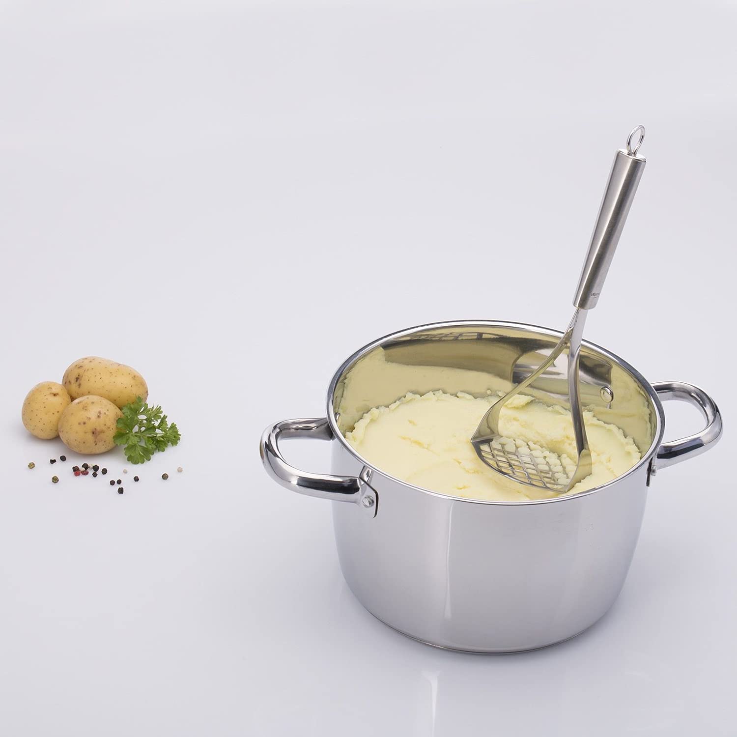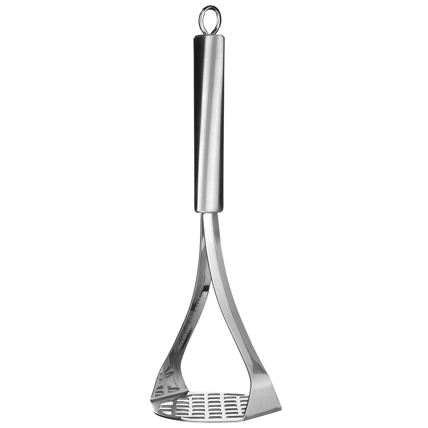 Kartoffelstampfer aus rostfreiem Edelstahl mit viereckiger Lochung zum Zerstampfen von gekochten Kartoffeln, Gemüse und Obst in der Pfanne oder dem Kochtopf - Einfaches Zerdrücken von gekochtem Obst und Gemüse durch runden, viereckig gelochten Stampferkopf, geschmacksneutral und verfärbungsresistent - Angenehmer Halt durch abgerundeten, konisch geformten Griff, platzsparend verstaubar dank Aufhänge-Öse - Sehr langlebig, leicht zu reinigen, spülmaschinengeeignet - Lieferumfang: 1x Westmark Kartoffelstampfer, Glory, Länge: 25,7 cm, Gewicht: 151 Gramm, Material: Rostfreier Edelstahl, Farbe: Silber, 18482270