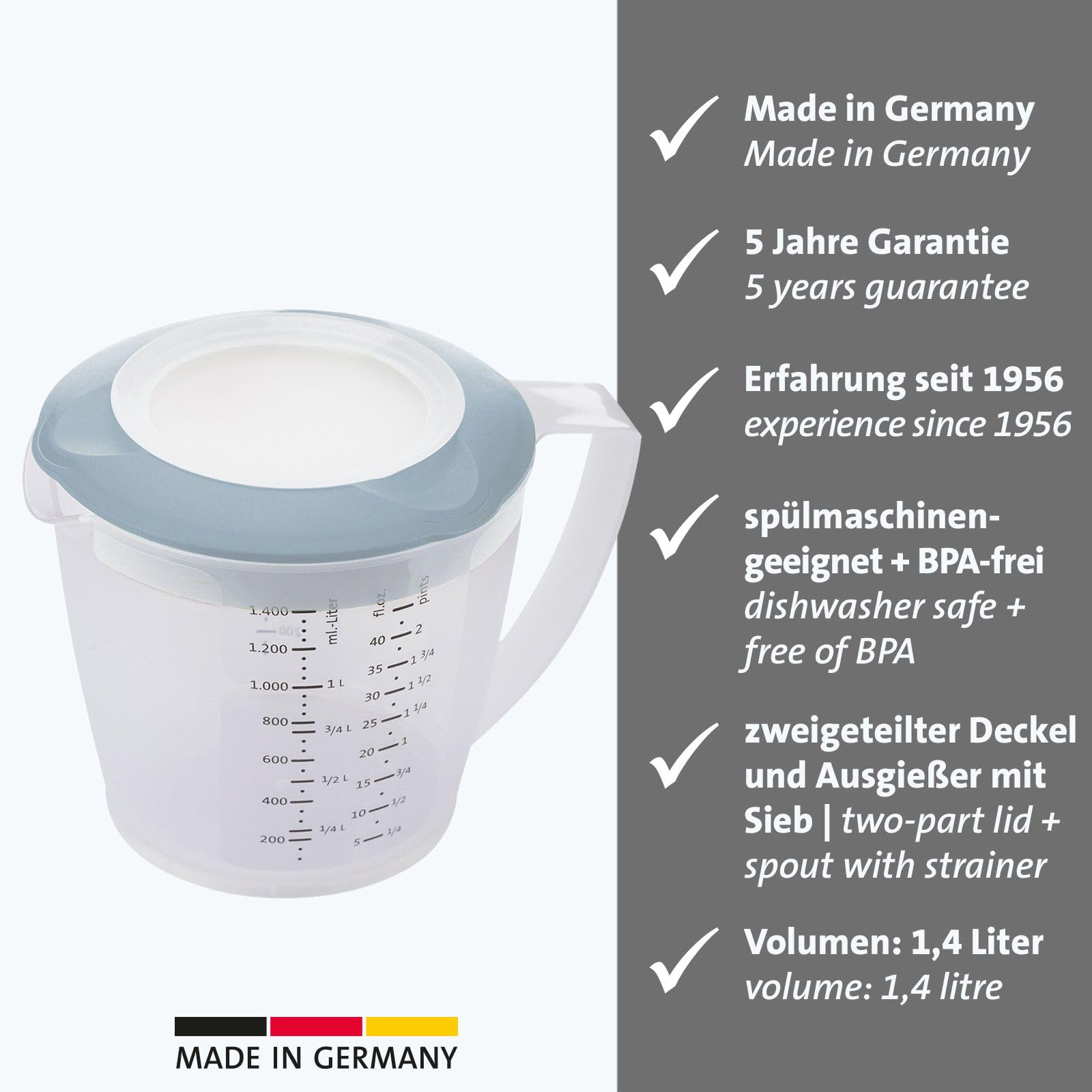 Westmark Rührbecher/Messkanne mit Spritzschutz, Deckel und Ausgiesser, Kunststoff, Füllvolumen: 1,4 Liter, Helena, Transparent/Blau, 3105227B, 1 – Pack