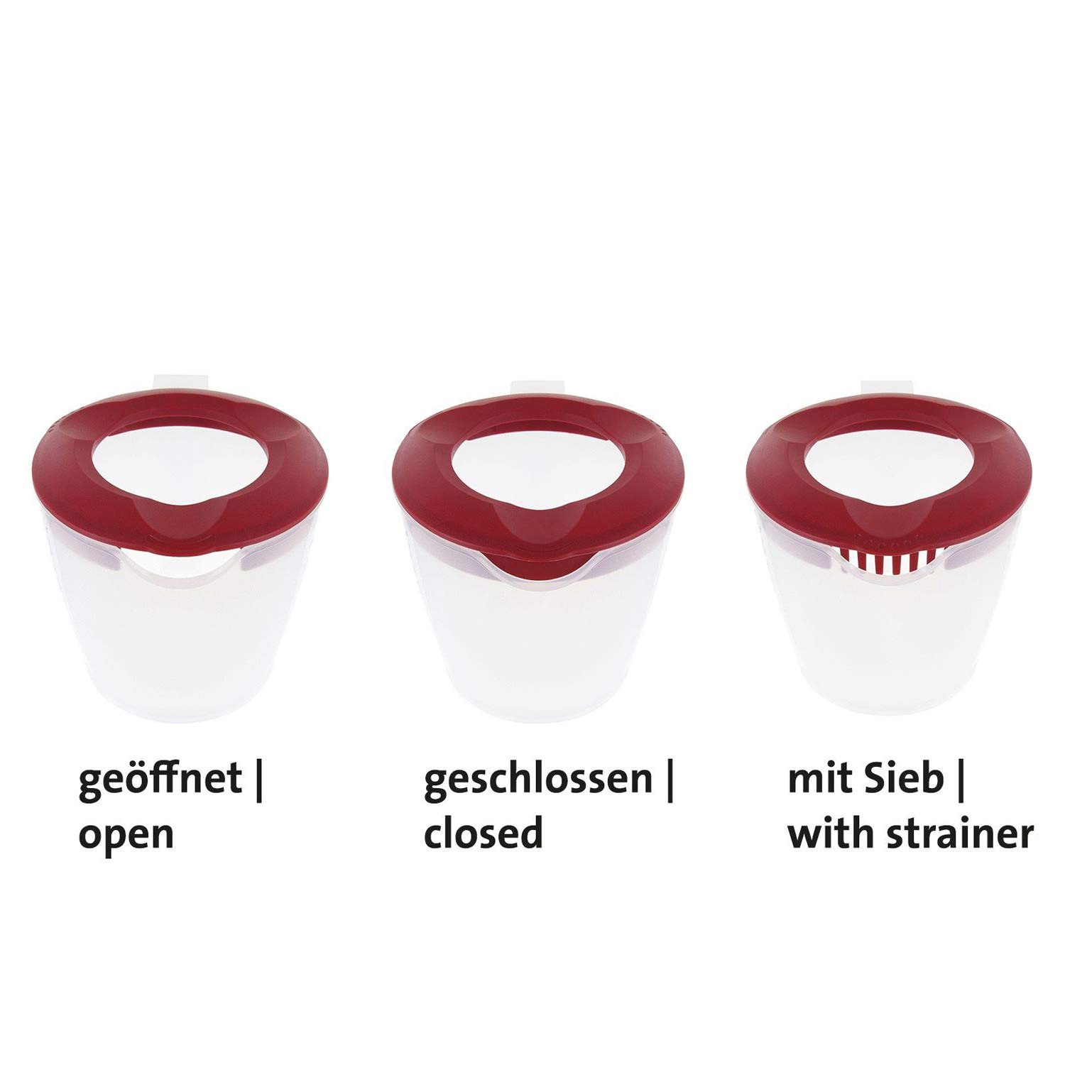 Rührbecher zum Mischen und Verrühren von Koch-/Backzutaten und zum Steifschlagen von Eischnee und Sahne, Füllvolumen: 1,4 Liter, mehrsprachige Messskalen (DE, GB, FR) und ml-/Liter-/Gramm-Angaben, geeignet für Handrührgeräte - Aufsetzbarer Spritzschutz-Ring für sauberes Verquirlen, Ausgiesser mit Sieb für exaktes sowie klumpfreies Dosieren und einfaches Umgiessen, passgenauer Deckel für hygienisches, geschmacks- und geruchsneutrales Aufbewahren von empfindlichen Zutaten - Sicherer Stand auf glatten Oberflächen durch Gummiring an der Topfunterseite, breiter Griff für festen Halt beim Rühren - Made in Germany: sehr langlebig, spülmaschinengeeignet, BPA-frei - Lieferumfang: 1x Westmark Rührbecher mit Spritzschutz und Deckel, Helena, Füllvolumen: 1,4 Liter, Gewicht: 192 Gramm, Material: Kunststoff (PP), Farbe: Transparent/Rot, 3105227R