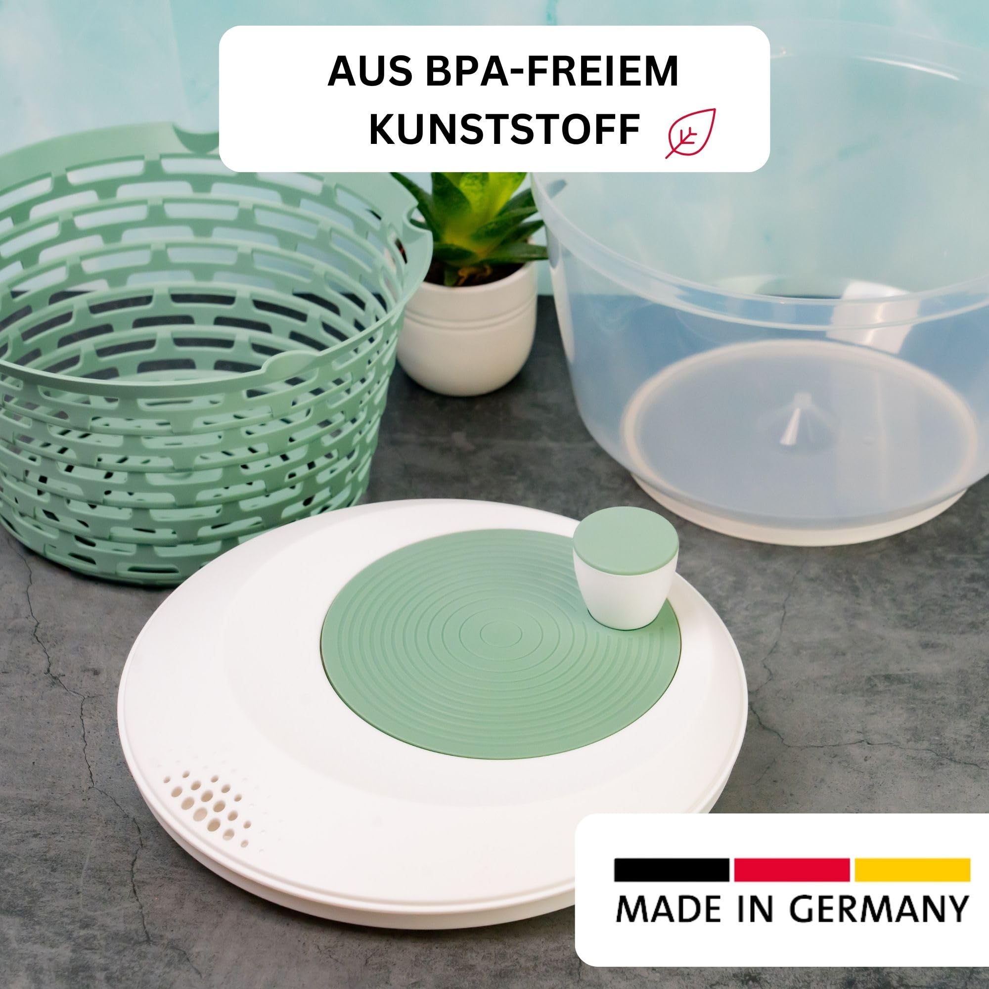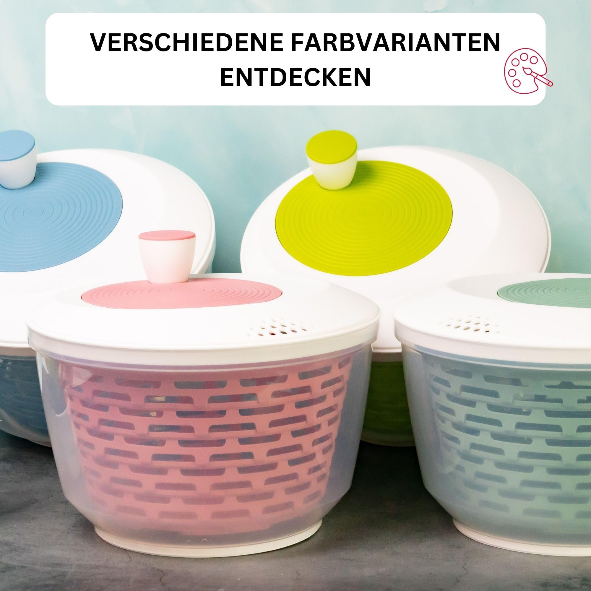 • Effektives und müheloses Trocknen von frisch gewaschenem Salat, Schleudern im modernen Siebeinsatz mit speziellem Design für effizientes Trocknen, Sammeln des Wassers in der äusseren, transparenten Schüssel, keine Verwässerung von Dressings