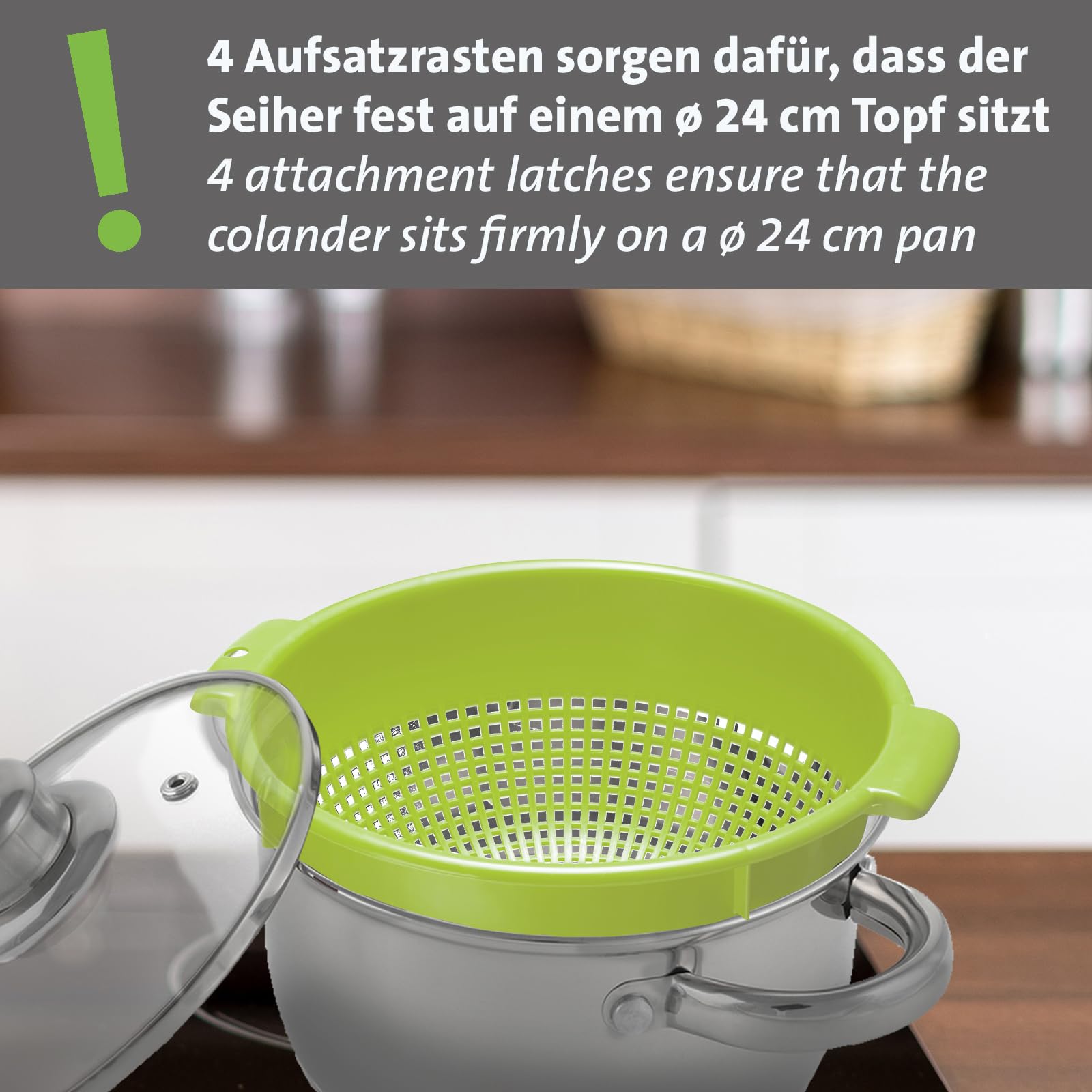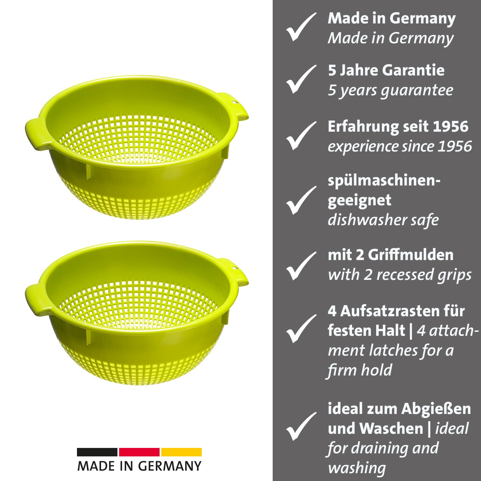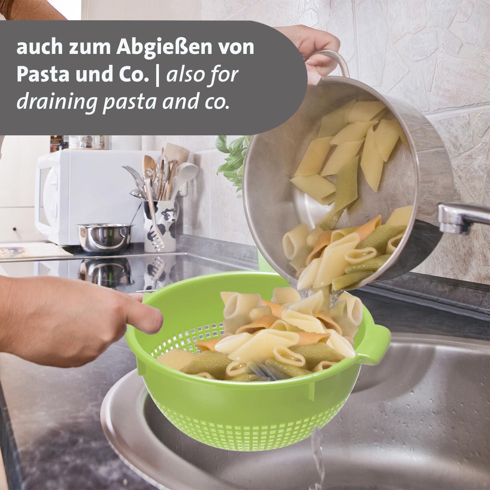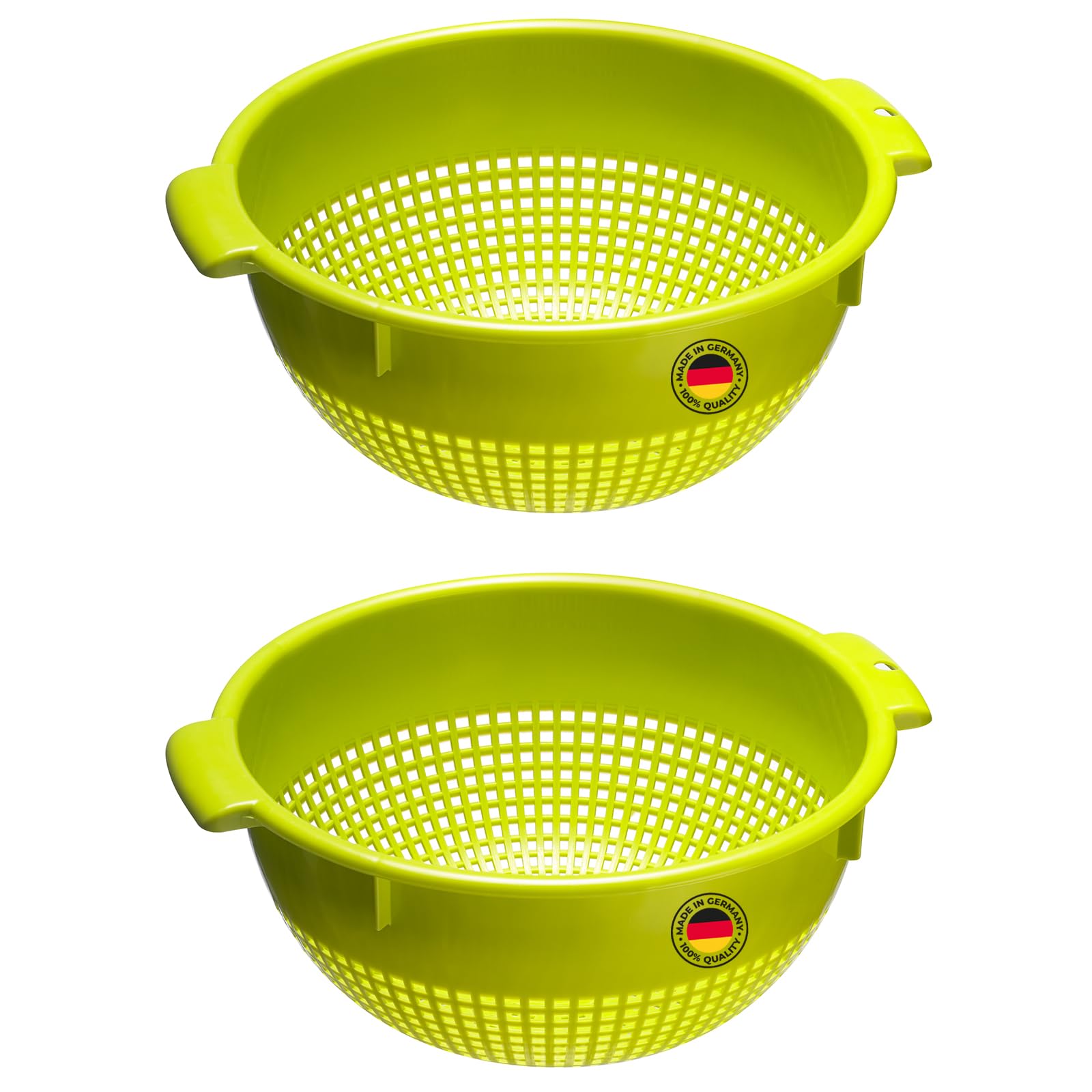 Westmark Seiher – Zwei grosse Seiher mit 2 Griffmulden und 4 Aufsatzrasten zum Waschen und Abtropfen – Apfelgrün, Kunststoff, ø 24 cm