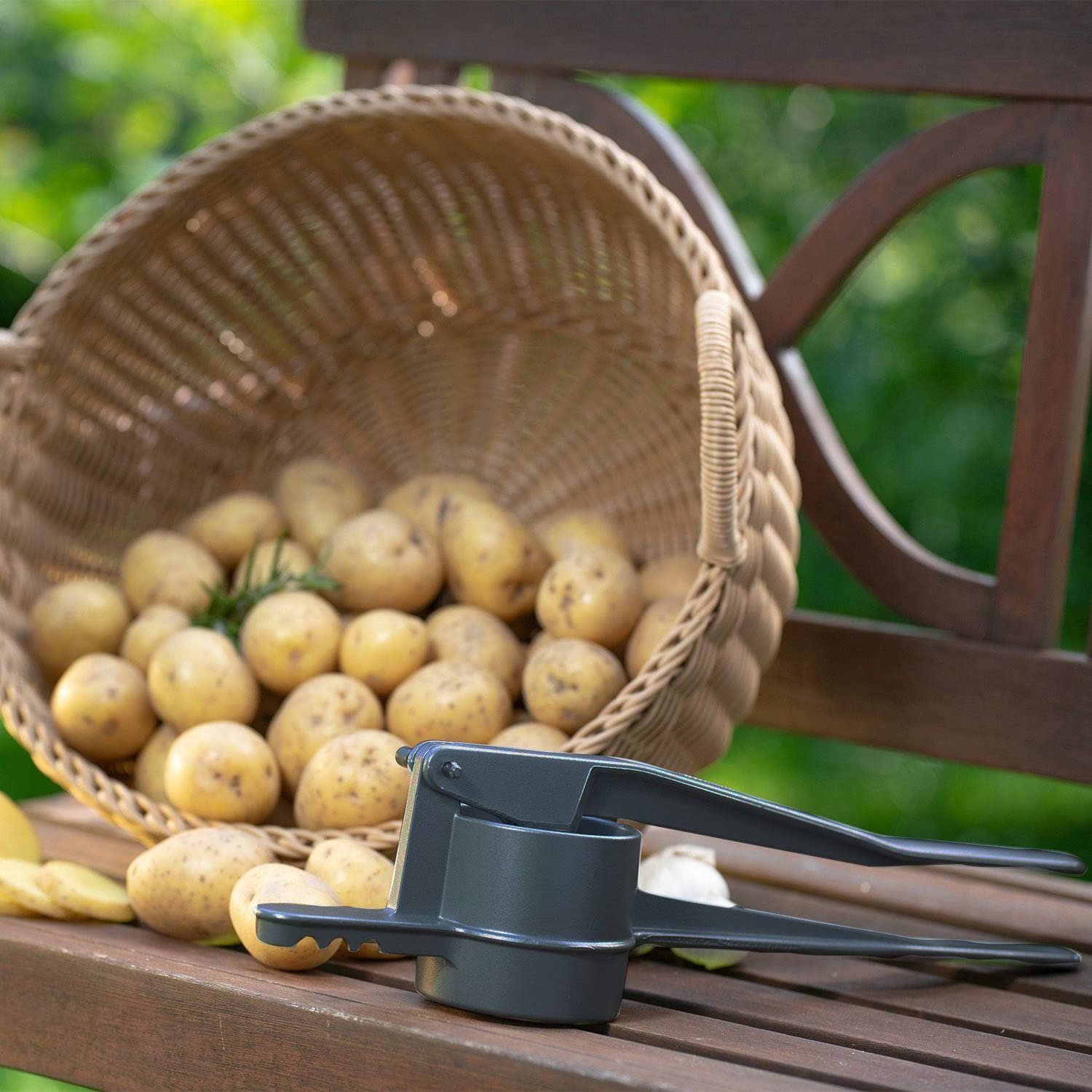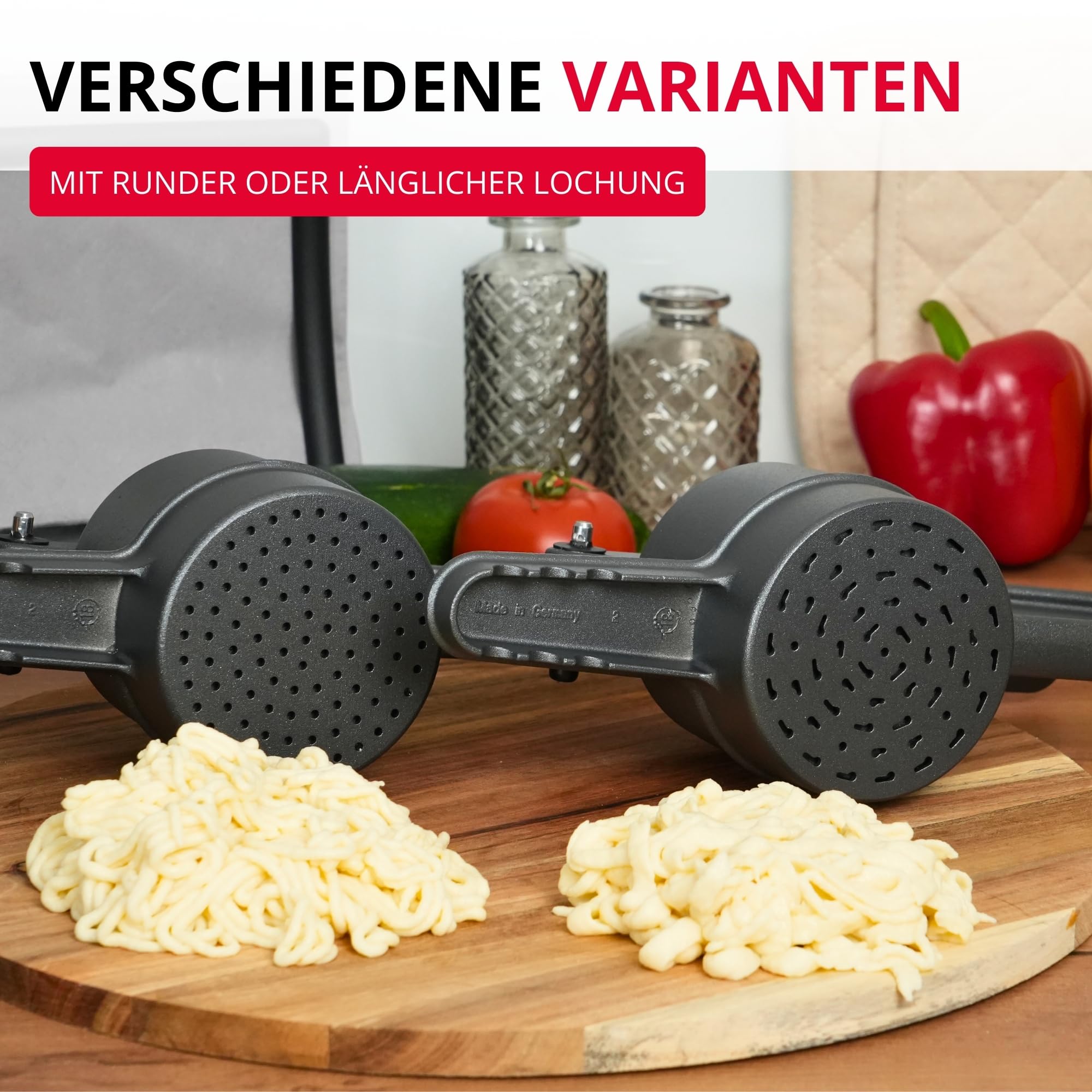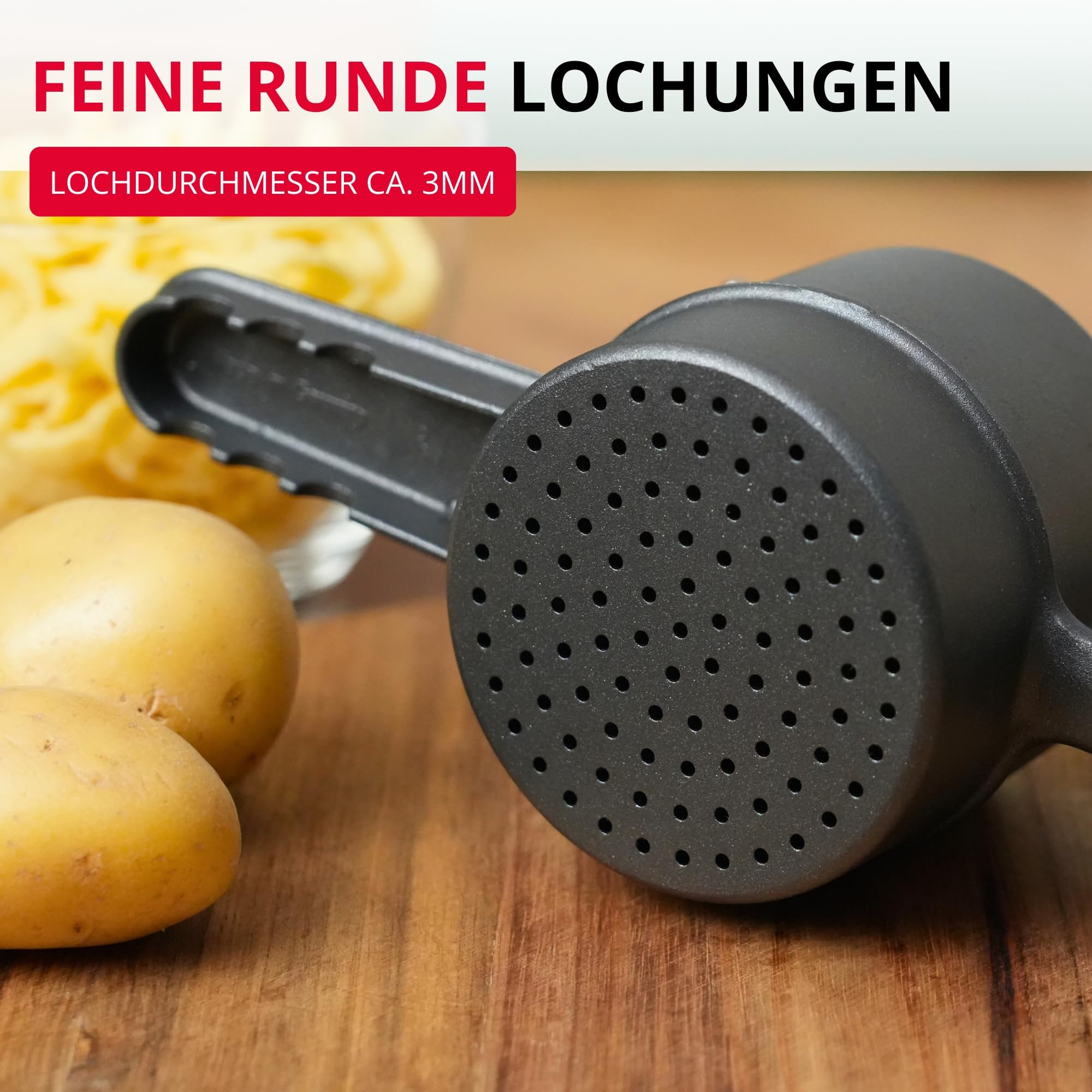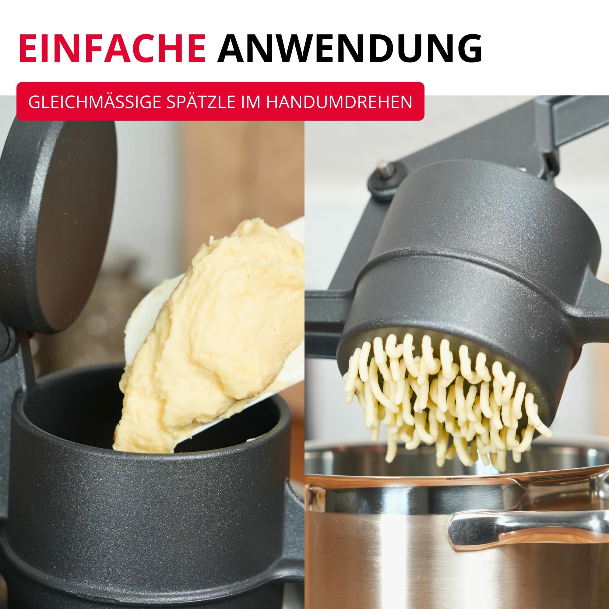 Hochwertige und funktionale Spätzlepresse in edlem Design, aus Aluminium mit dunkler, moderner und lebensmittelechter Spezialbeschichtung. Mit runder Lochung, zum Herstellen von Spätzle, Kartoffelpüree, Spaghetti-Eis oder Obstsäfte - Grosser Pressbehälter, Füllvolumen ca. 250 ml, klassische Rund-Lochung (Lochdurchmesser ca. 3mm), die langen Hebelarme ermöglichen eine optimale Kraftübertragung für einfaches und schnelles Pressen von Spätzleteig, Kartoffeln, Früchten oder Eis - Besonders gute Handhabung und sicherer Halt durch griffige und rutschhemmende Spezialbeschichtung, der untere Griff ist speziell abgeflacht und bietet mit 3 Auflagerasten festen Halt auf Töpfen und Schüsseln mit unterschiedlichen Durchmessern - Made in Germany: Hochwertig solide Verarbeitung, Spülen von Hand empfohlen, spülmaschinengeeignet, geschmackvolles und angesagtes Design in Anthrazit, besonders griffig und tolle Haptik - Lieferumfang: 1x Westmark Spätzle-/Kartoffelpresse, Spätzlepress, "Special Dark Edition", Material: Aluminium, strukturierte Beschichtung, Farbe: Anthrazit, 6110226Z