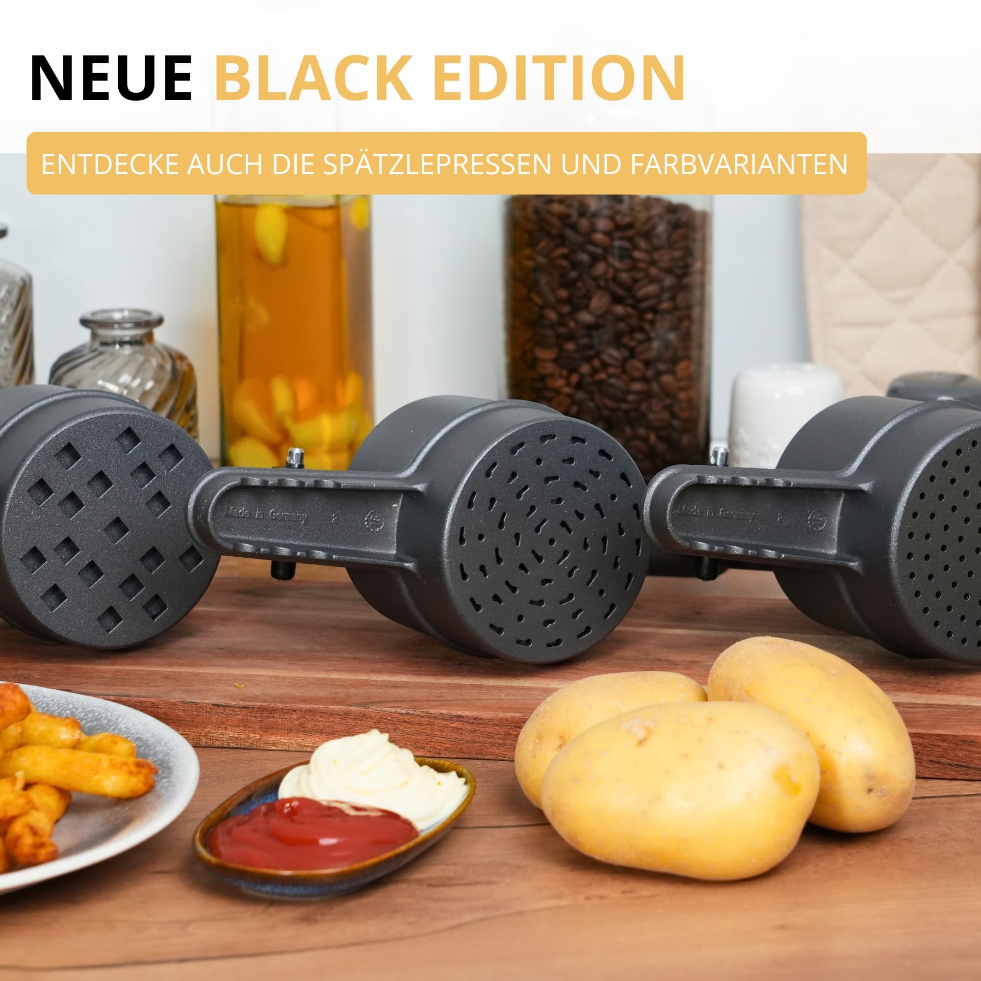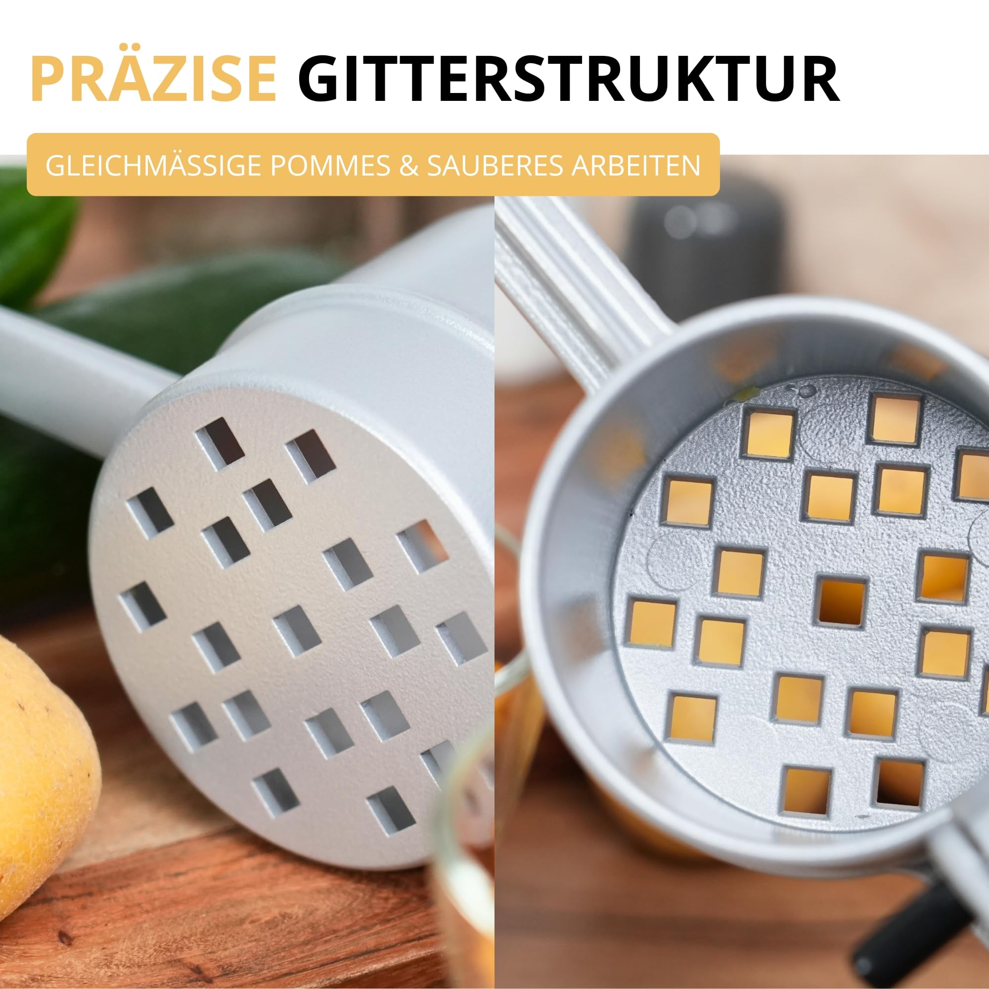 Westmark Pommes-Frites-Presse – Klassische Qualität aus Aluminium!Die hochwertige Kartoffelpresse aus robustem, leichtem Aluminium sorgt für müheloses Pressen. Der grosse Pressbehälter (250 ml) und die langen Hebelarme ermöglichen kraftsparendes Arbeiten. Das Lochbild garantiert gleichmässige Ergebnisse.Westmark steht seit Jahrzehnten für Qualität und Funktionalität – ein zuverlässiger Küchenhelfer für perfekt gepresste Kartoffeln und mehr!