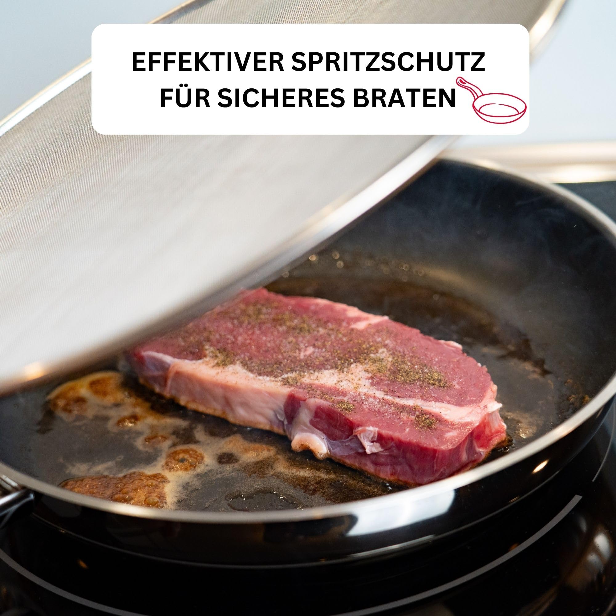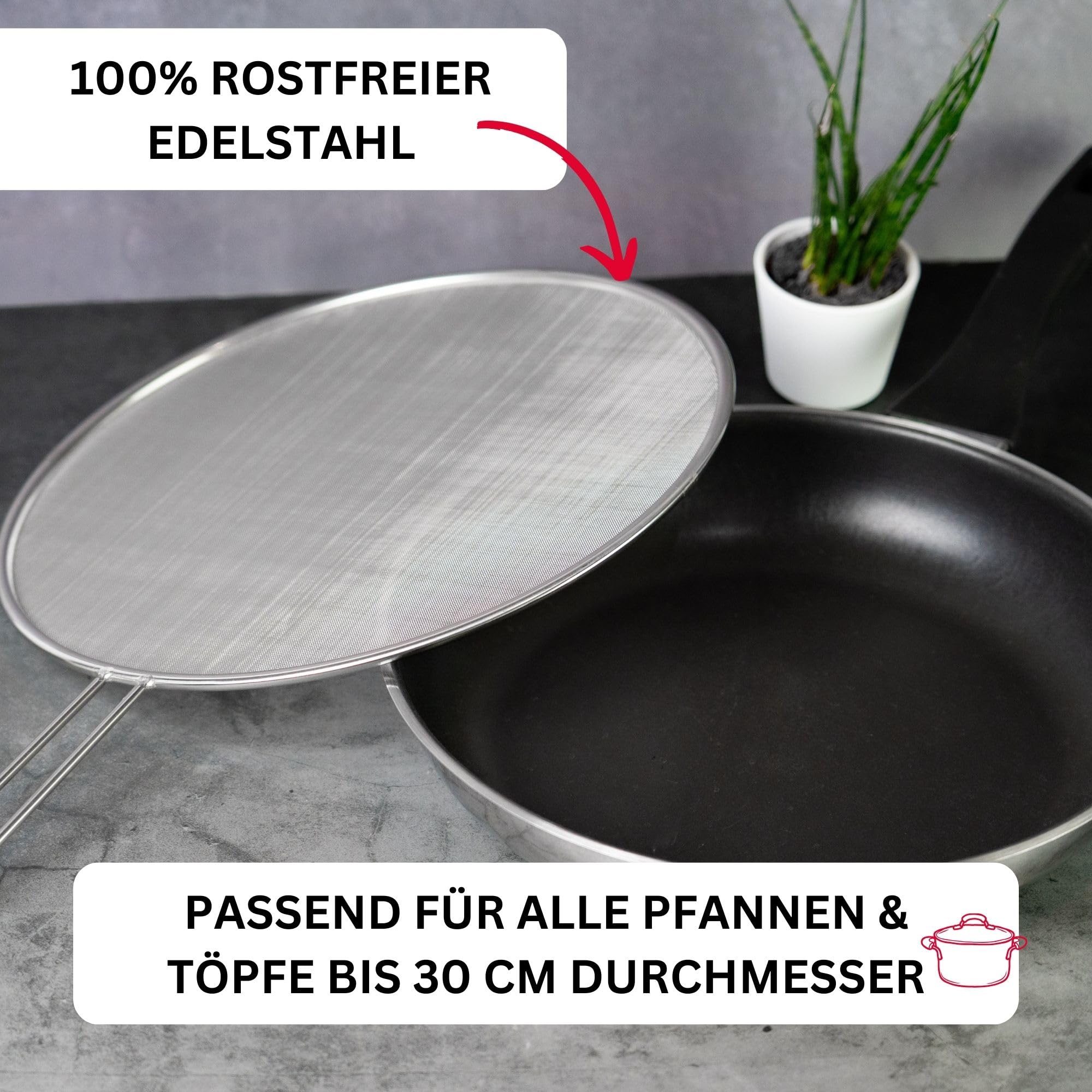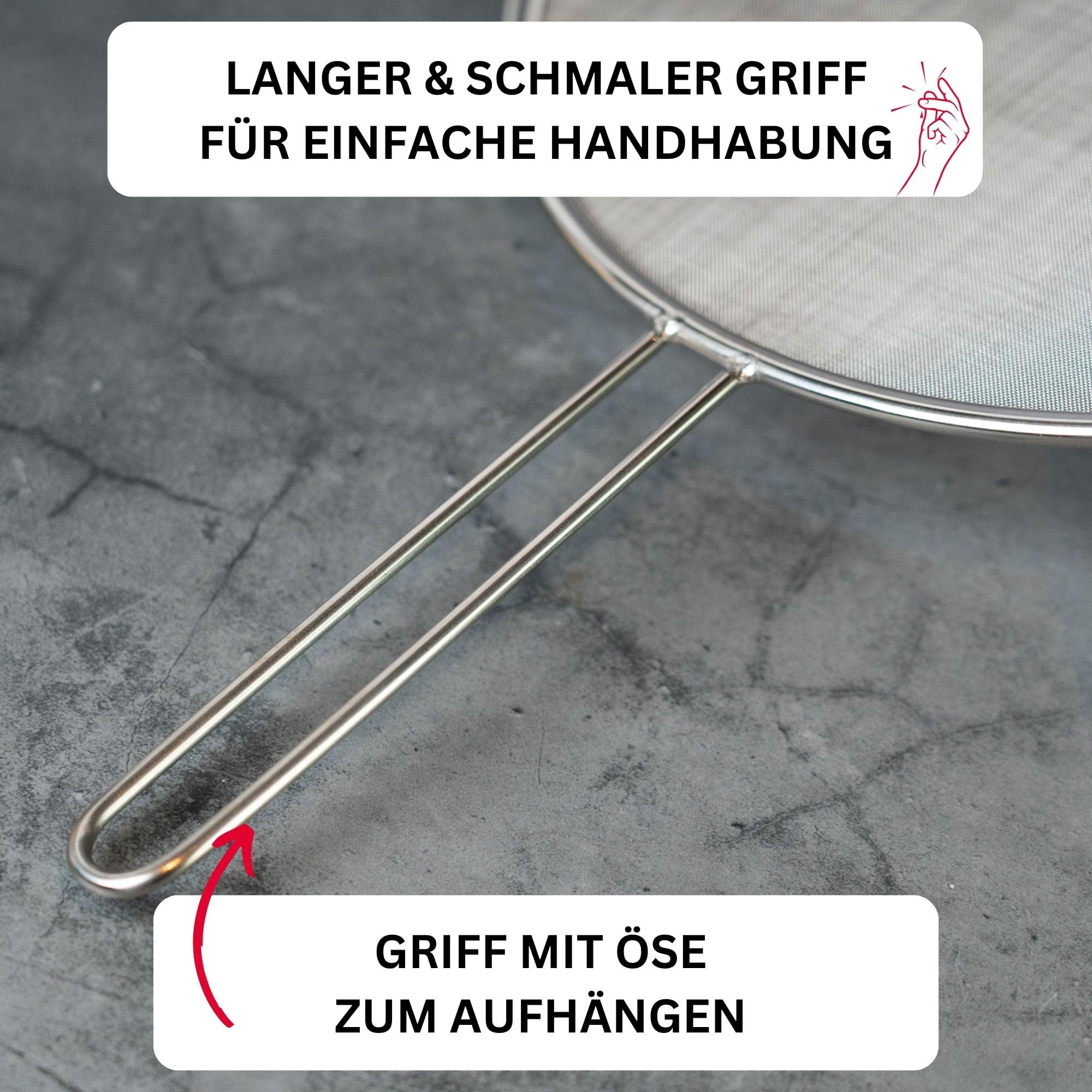 Effektiver, sehr stabiler Spritzschutz aus rostfreiem Edelstahl für alle Pfannen und Töpfe bis 30 cm Durchmesser - Spritzfreies und sicheres Braten von Speisen durch feinmaschiges Sieb, sowie einfache Handhabung durch langen, schmalen Griff - Griff mit praktischer Öse zum aufhängen oder platzsparendes Aufbewahren im Küchenschrank - Hohe Langlebigkeit, rostfreier Edelstahl, leichte Reinigung, spülmaschinengeeignet - Lieferumfang: 1x Westmark Spritzschutz, Picante, Masse: 45,5 x 30 x 0,7 cm, Material: Rostfreier Edelstahl, Farbe: Silber, 12182260