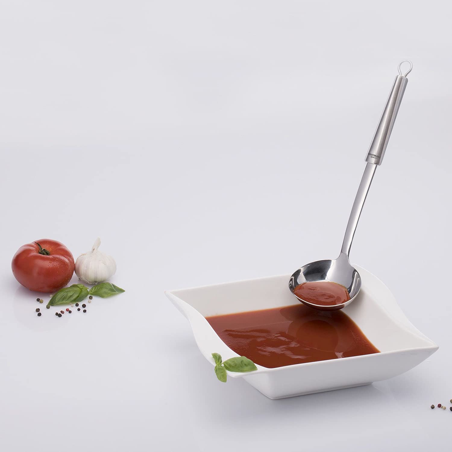 Suppen- und Schöpflöffel (ca. 100 ml) aus rostfreiem Edelstahl zum Umrühren und Servieren von flüssigen Speisen wie Suppen oder Eintöpfen - Einfaches Servieren und Portionieren in der Küche und am Tisch durch grossen und tiefen Löffelkopf, kein Verbrennen der Finger dank langem Griff, geschmacksneutral und verfärbungsresistent - Angenehmer Halt durch abgerundeten, konisch geformten Griff, platzsparend verstaubar dank Aufhänge-Öse - Langlebig, Sorgfältig solide Verarbeitung, Einfache Reinigung, Rostfrei, Spülmaschinengeeignet - Lieferumfang: 1x Westmark Schöpfkelle, Glory, Masse: 30,8 x 8,9 x 7,4 cm, Gewicht: 181 Gramm, Material: Rostfreier Edelstahl, Farbe: Silber, 18562270