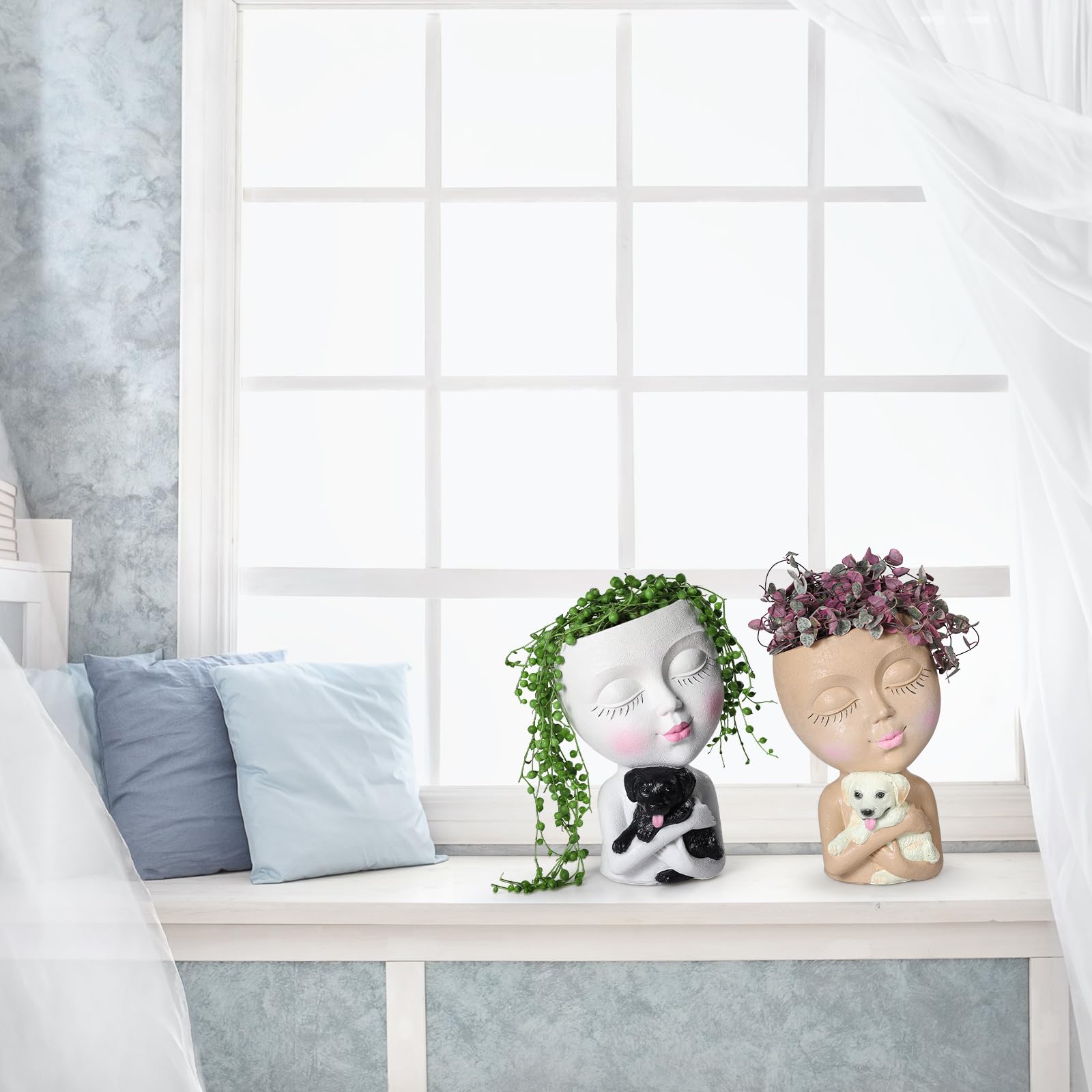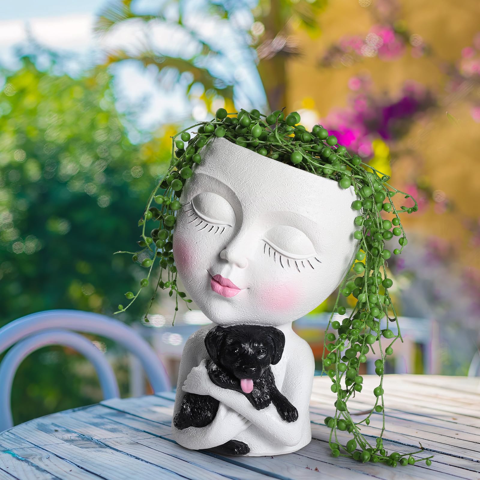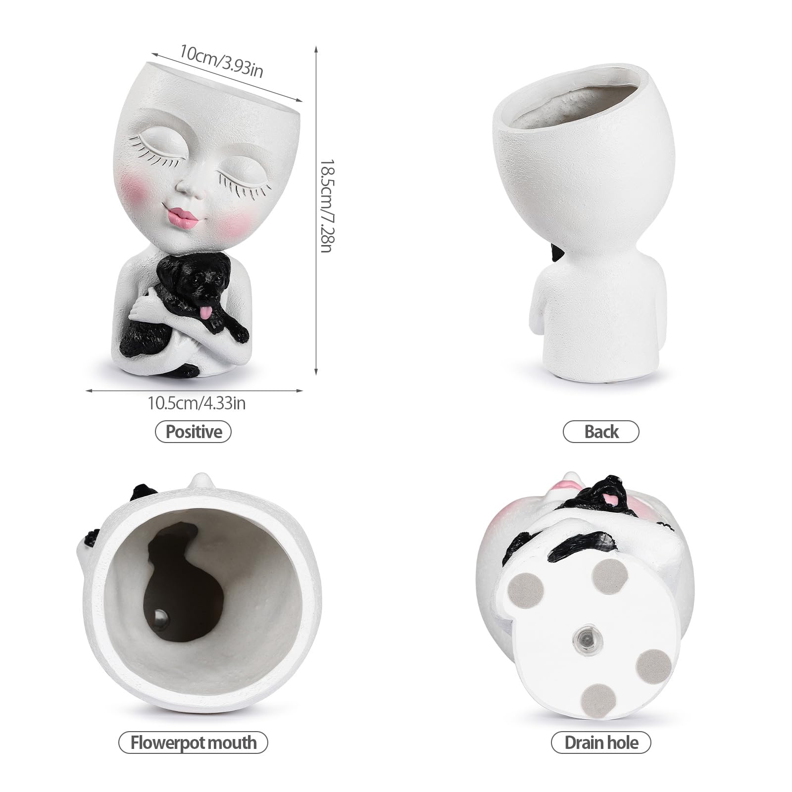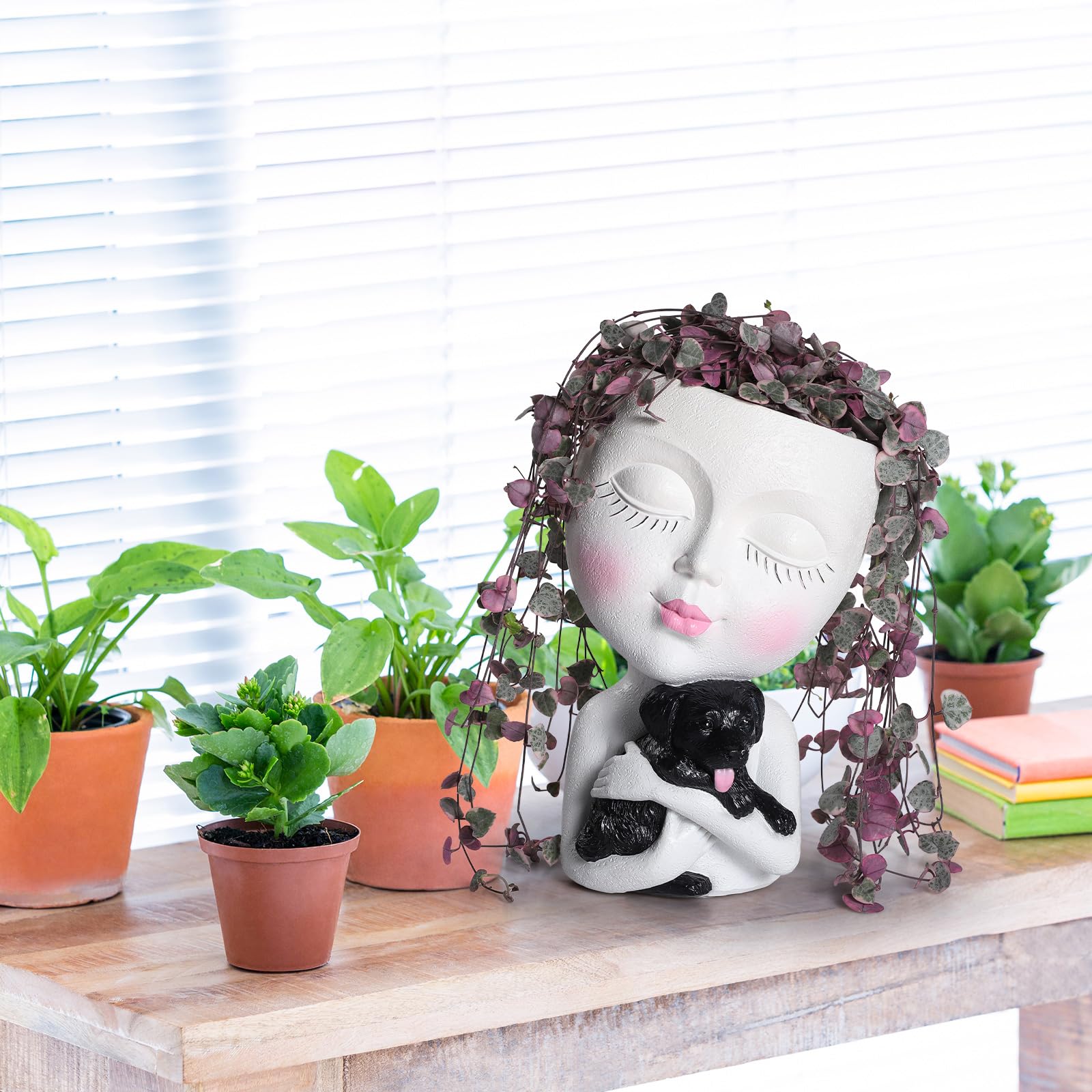 WEWEOW Gesichtspflanzgefäss, Kopf für drinnen und draussen, Pflanztopf mit Hund, Sukkulenten-Übertopf mit Ablaufloch, niedliche Damengesicht-Blumentöpfe (weiss)