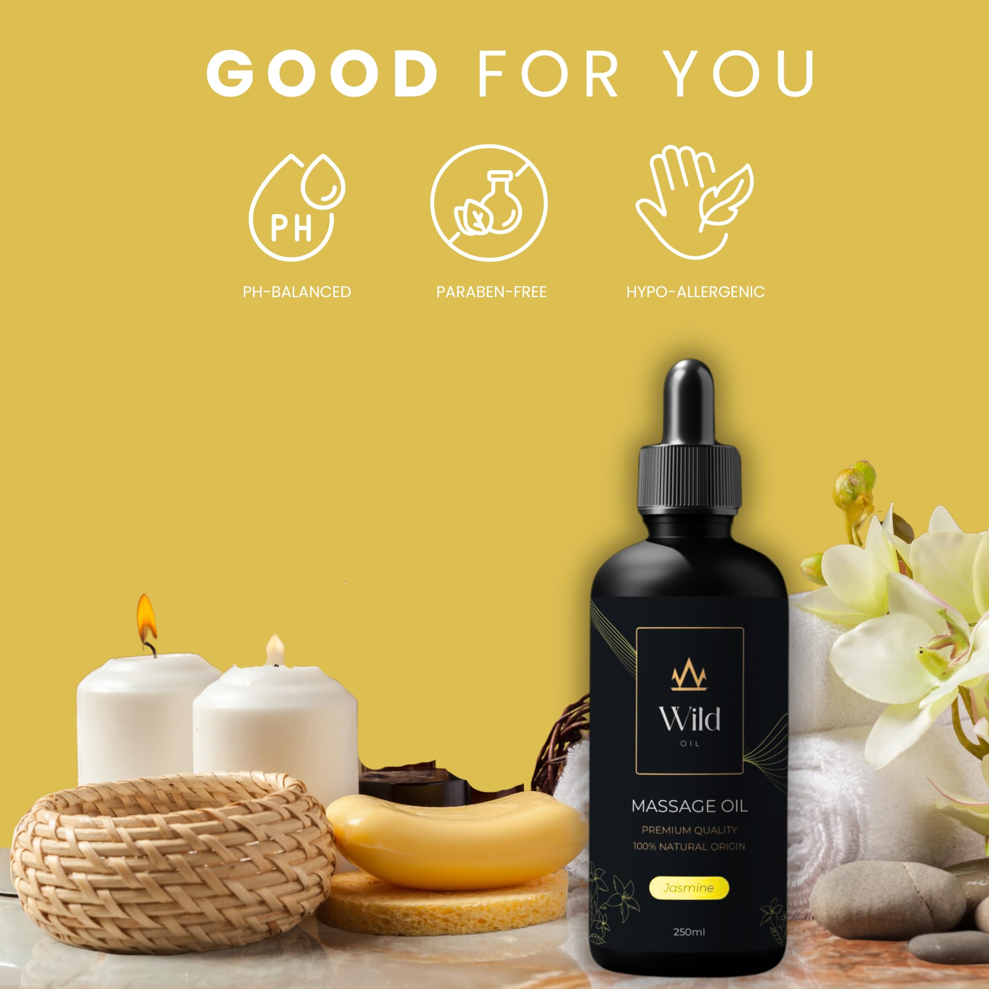 Verwandle deine Selfcare-Routine mit dem Wild Natürlichen MassageölUnsere 100-ml-Formel wurde entwickelt, um ein Premium-Wohlfühlerlebnis zu bieten. 100 % natürlich und vegan, ideal als Massage- oder Trägeröl, speziell formuliert, um Haut und Muskeln zu hydratisieren, zu entspannen und zu pflegen.100 % natürlich & vegan: Frei von aggressiven Inhaltsstoffen, perfekt für alle Hauttypen, auch für empfindliche Haut.Tiefe Hydratation: Zieht schnell ein und hinterlässt die Haut weich, elastisch und gepflegt.Vielseitige Körperpflege: Empfohlen für entspannende Massagen, Muskelpflege nach dem Sport oder als tägliche Körperpflege.Ideal nach dem Bad: Auf die feuchte Haut nach der Dusche auftragen, um die Feuchtigkeit zu bewahren und das Wohlgefühl zu verlängern.Hypoallergen & dermatologisch getestet: Sicher für empfindliche Haut und die ganze Familie.Mache jede Anwendung zu einem kleinen Ritual der Entspannung und Pflege. Wähle Wild und bringe das Spa-Erlebnis zu dir nach Hause.