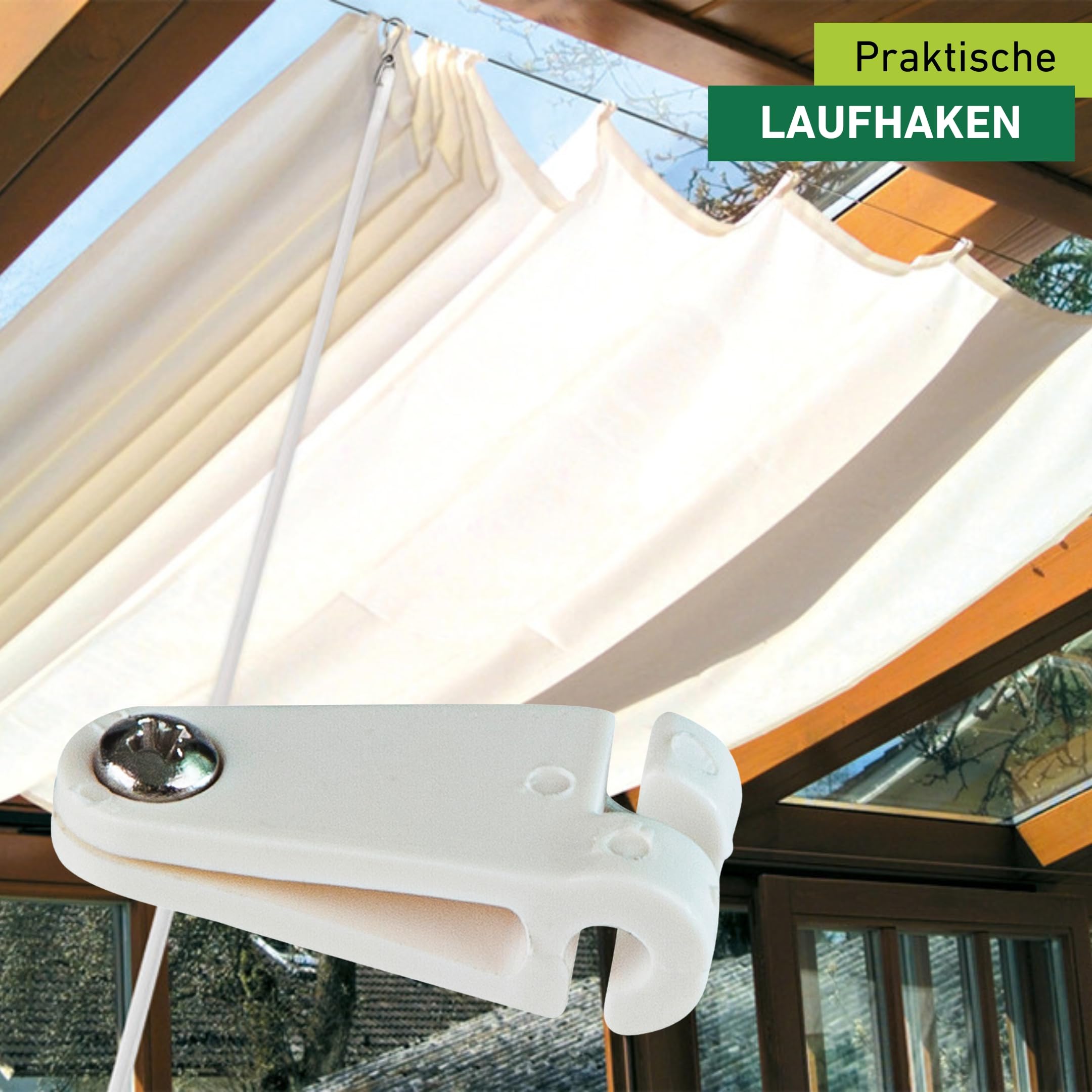 Zur Befestigung des Sonnensegels am Edelstahlseil. Aus hochwertigem, UV-beständigem Kunststoff, für 2 - 2,5 mm Edelstahlseile. Waschbar mit dem Segel. Einfache Montage. Anwendung Laufhaken am Stoff positionieren, Schraube einschrauben - fertig.