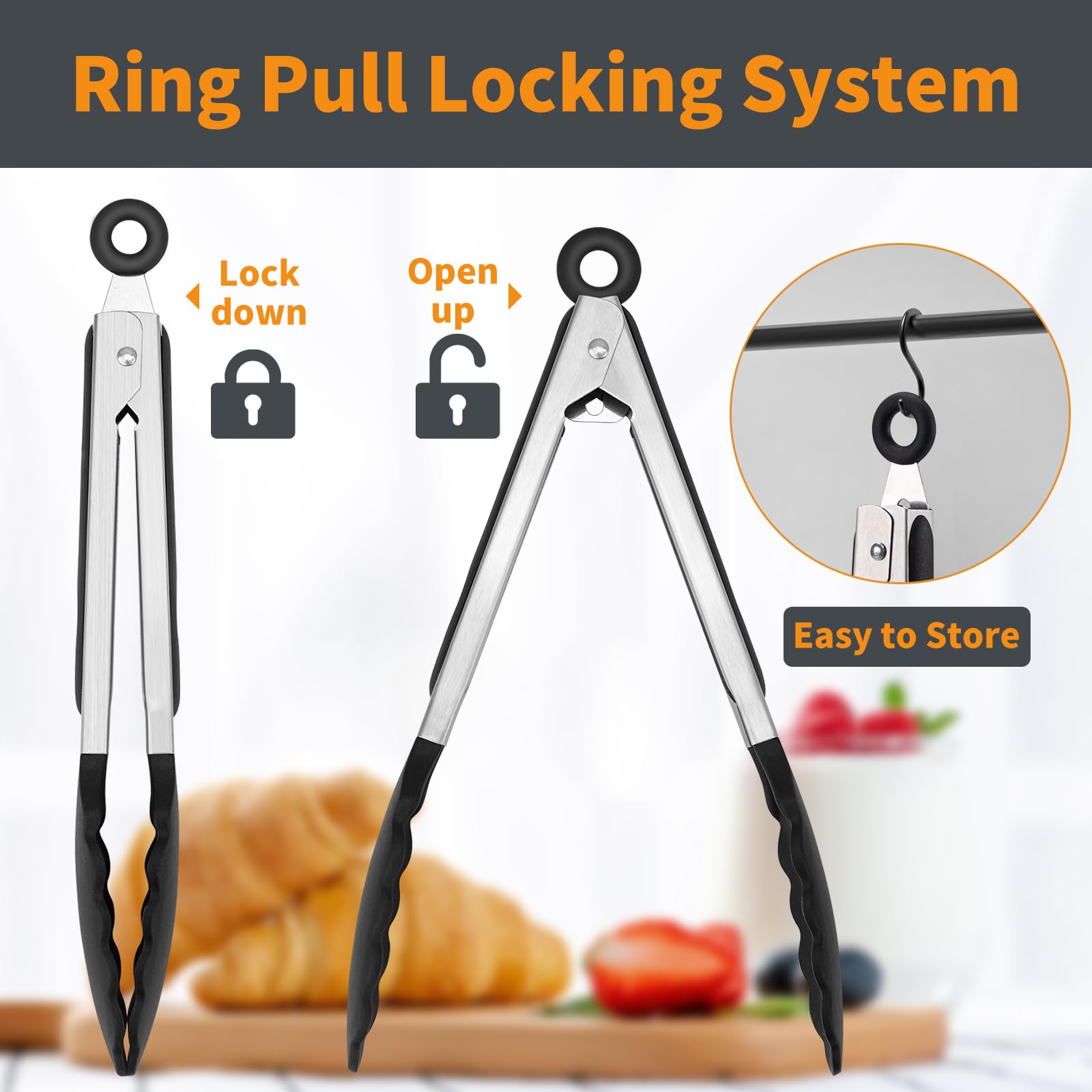 • 【Einfach zu verstauen】Grillzange verfügt über die Zugring-Technologie, zum Verriegeln am Ring ziehen, zum Entriegeln auf den Ring drücken, einfach zu bedienen. Hängen Sie es nach Gebrauch an die Aufhängeöse oder ziehen Sie an der Schlaufe, um es platzsparend in einer Schublade zu befestigen.