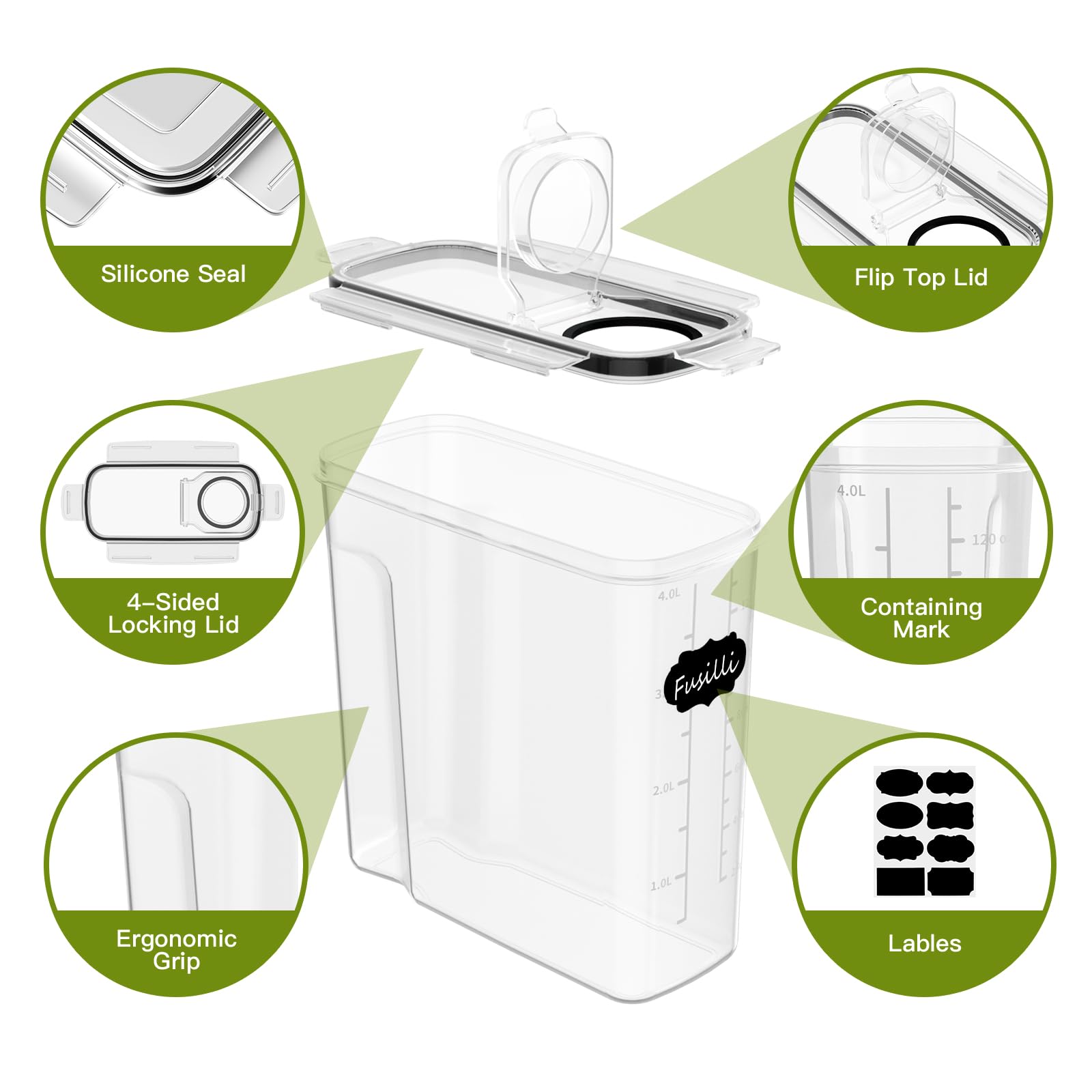 Grösse: 9,4 x 4,5 x 9,4 Zoll, 4,0 l verdickter Kunststoff, sicher, langlebig und leicht zu reinigen. Der 4-seitige Verschluss und der Silikonring halten Lebensmittel lange frisch und feuchtigkeitsbeständig. Sparen Sie Platz und organisieren Sie Ihre Küche so, dass Sie alles auf einen Blick finden