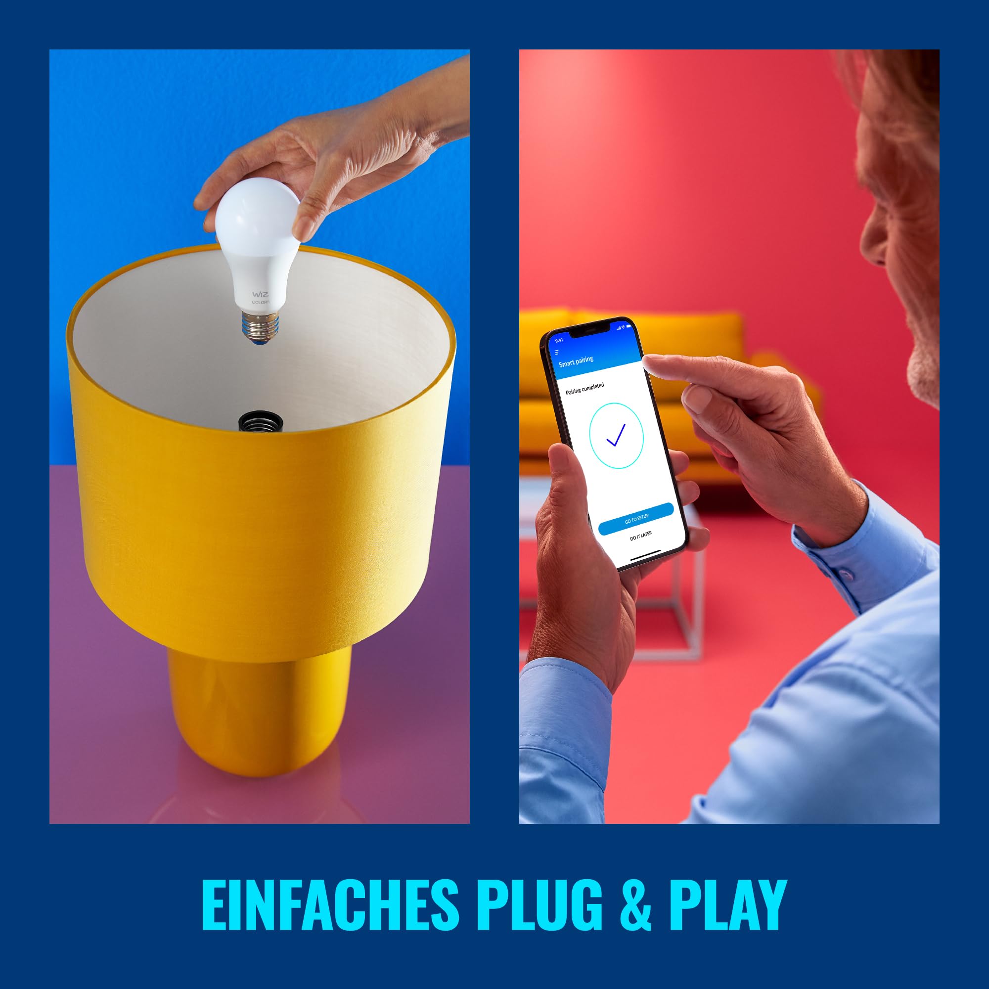 Mit den smarten WiZ LED Lampen schaffen Sie das perfekte Licht immer passend für Ihren Alltag. Wählen Sie zwischen warmweissem- bis kaltweissem Licht und dimmen Sie es je nach Belieben. Steuern Sie die Leuchte bequem über die WiZ App oder bedienen Sie sie per Sprachbefehl.