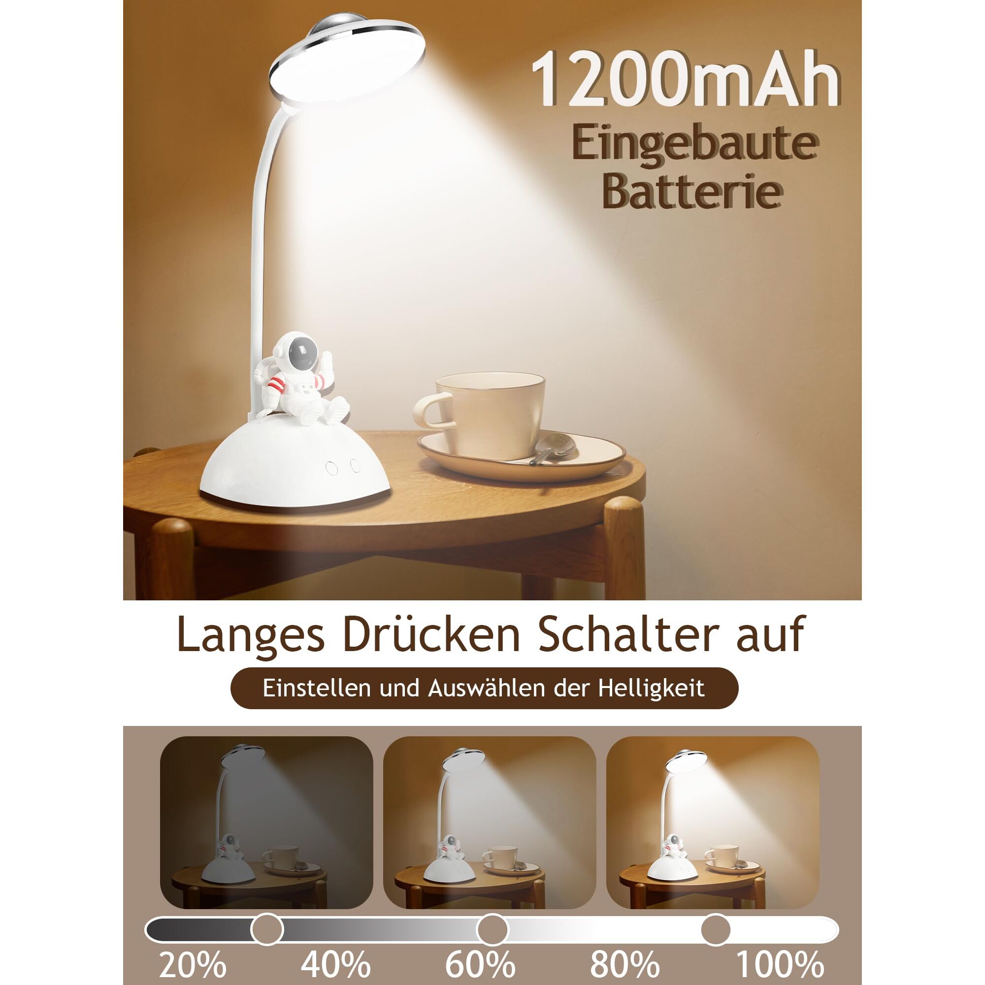 Drücken Sie lange auf den Schalter der Tischlampe, um die Lichthelligkeit einzustellen.