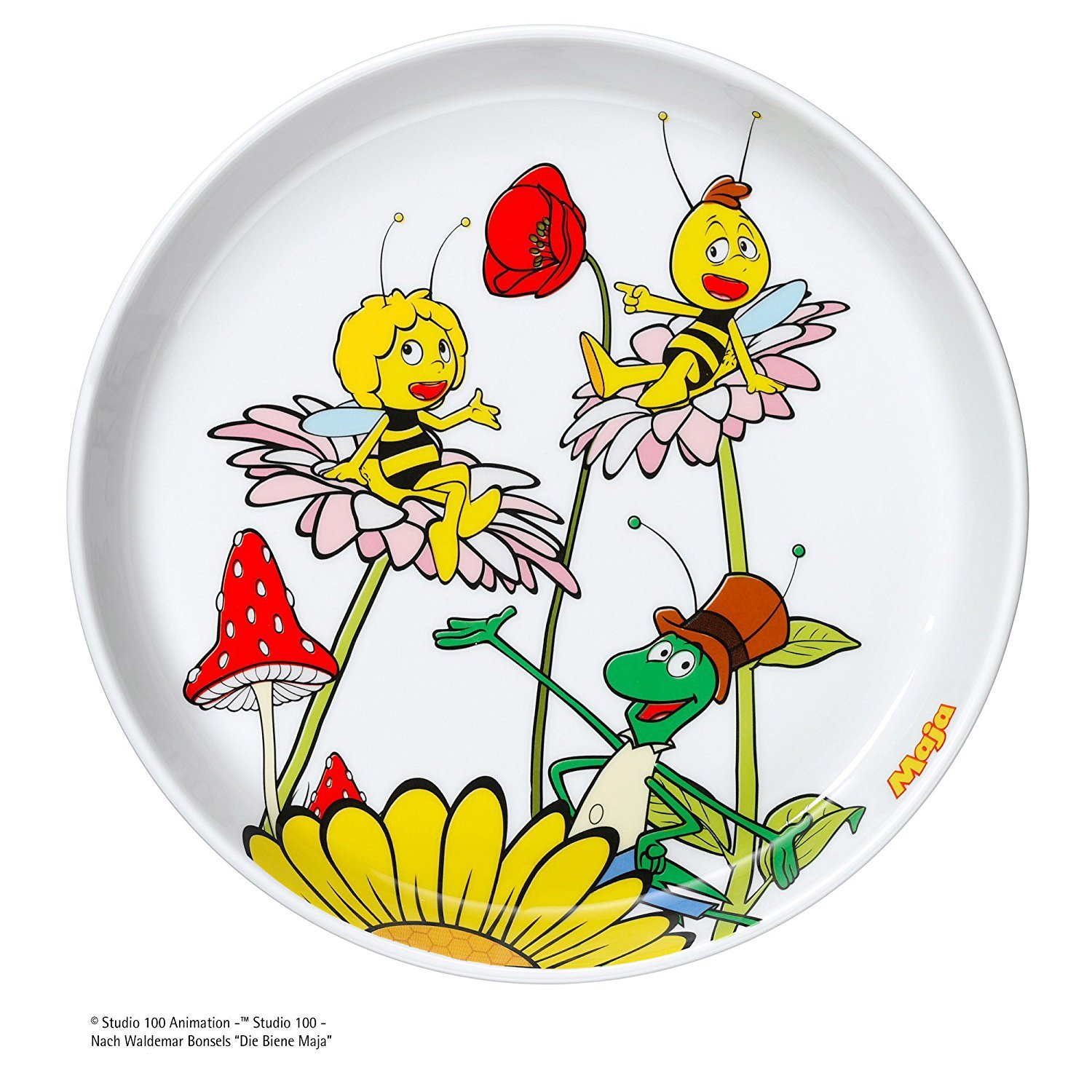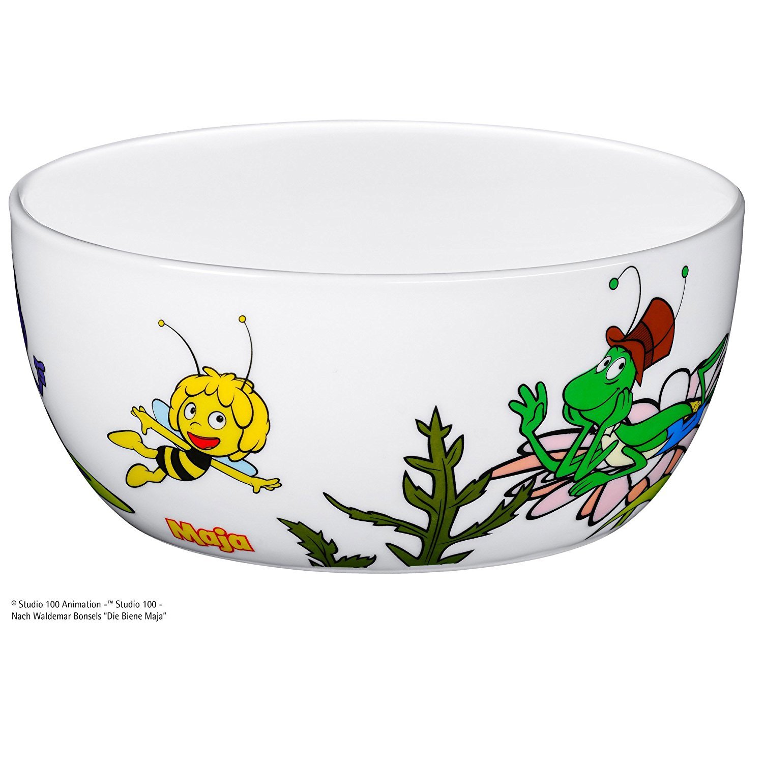 Glücklich fliegt Biene Maja mit ihren Freunden über die Klatschmohnwiesen und sorgt für Freude und viel Honig. Sie ist ein absoluter Klassiker: obwohl die Biene Maja seit über 100 Jahren ein Kinderbuchstar ist, rangiert sie heute noch auf der Beliebtheitsskala ganz oben. Auf dem WMF Biene Maja Kinderbesteck aus Cromargan Edelstahl rostfrei 18/10 schmücken Biene Maja und ihre Freunde die Stielenden. Passend dazu gibt es ein zweiteiliges Kinderporzellan bestehend aus Teller und Schüssel.Mit dem Kinderbesteck von WMF lernen die Kleinen spielerisch, mit Messer, Löffel und Gabel umzugehen. Mehr als 125 Jahre Erfahrung stecken in den kindgerechten Besteckteilen aus rostfreiem Edelstahl, die ausserdem mit liebevoll gestalteten Motiven und farbigen Bildern begeistern. Das 6-teilige WMF Kindergeschirrset, bestehend aus dem 4-teiligen Kinderbesteck, einer Müslischale und einem Porzellan-Teller, zeichnet sich durch ein kindgerechtes Design aus, das die Fähigkeit zum selbständigen Essen verbessert und gleichzeitig für Spass beim täglichen Essen sorgt. Die Kinderbesteckset sind in entsprechende Altergruppen eingestuft, dieses eignet sich für Kinder ab 3 Jahren. Die Grösse und Form dieser Kinderbesteckteile machen dieses Set zum perfekten Erstbesteck für absolute Sicherheit und die Entwicklung der Feinmotorik. Die Grössen der Besteckteile und die kräftigen Stiele eignen sich besonders für kleine Hände und die kindliche Motorik. Die Messer haben einen leichten Wellenschliff. Der Laffenrand des Löffels hat abgerundete Kanten, und die kurzen stumpfen Zinken der Kindergabel passen sich kleinen Kindermündern an. Das Porzellan-Geschirr wurde für absoluten Komfort und mühelosen täglichen Gebrauch konzipiert. Die langlebigen Besteckteile aus Cromargan Edelstahl Rostfrei 18/10 und das Porzellan können in der Spülmaschine gereinigt werden. Spülmaschinenfestes und säurebeständiges Cromargan garantiert vollen Geschmack, aussergewöhnliche Haltbarkeit und eine elegante Ästhetik. Das 6-teilige Kinderbesteck-Set wird in einer hochwertigen Faltschachtel mit Klappdeckel geliefert.