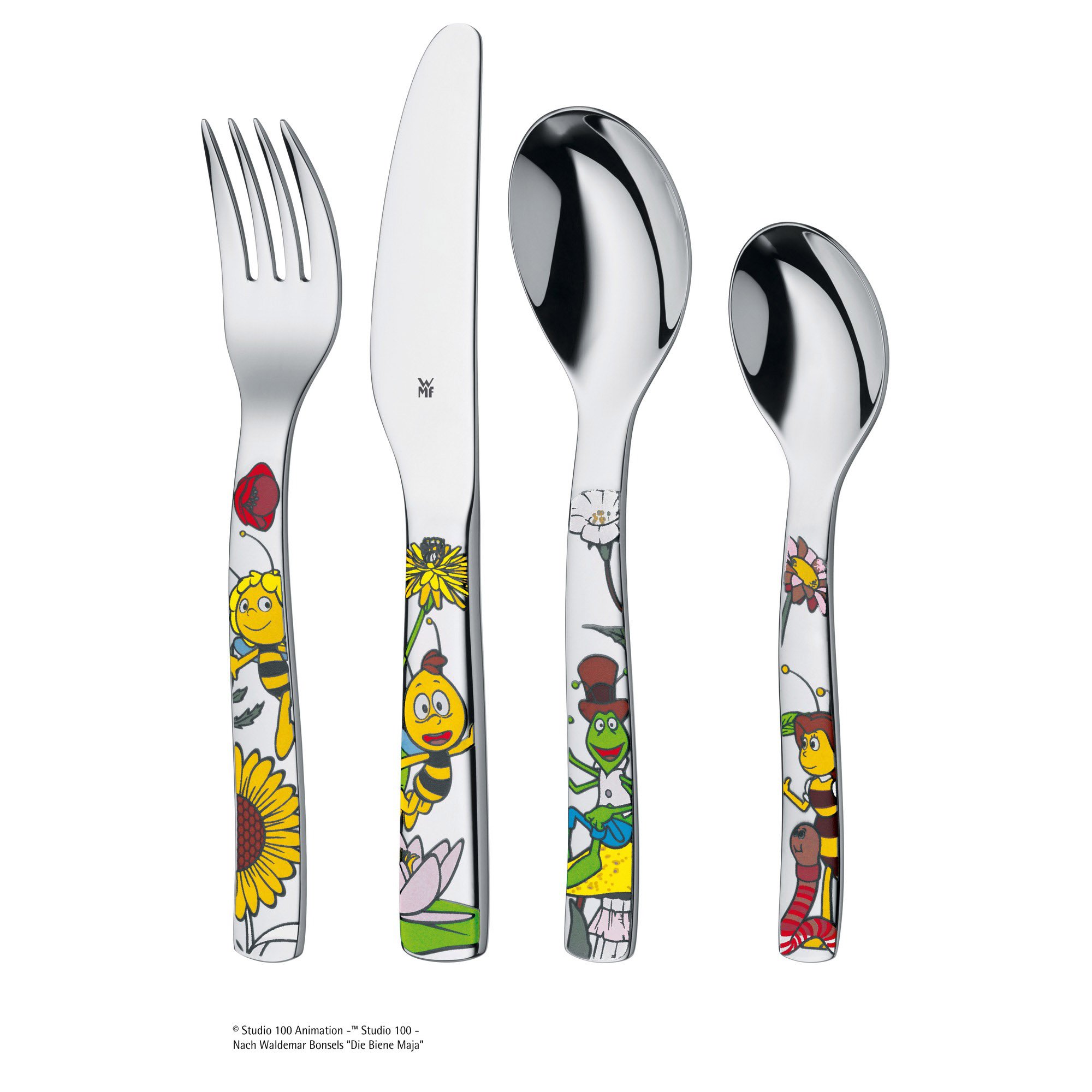 WMF Biene Maja Kinder Geschirrset 6-teilig Kindergeschirr mit Kinderbesteck Edelstahl, mit Namensgravur, ab 3 Jahre, Cromargan poliert, spülmaschinengeeignet, Gravurgeschenk für Taufe oder Geburtstag