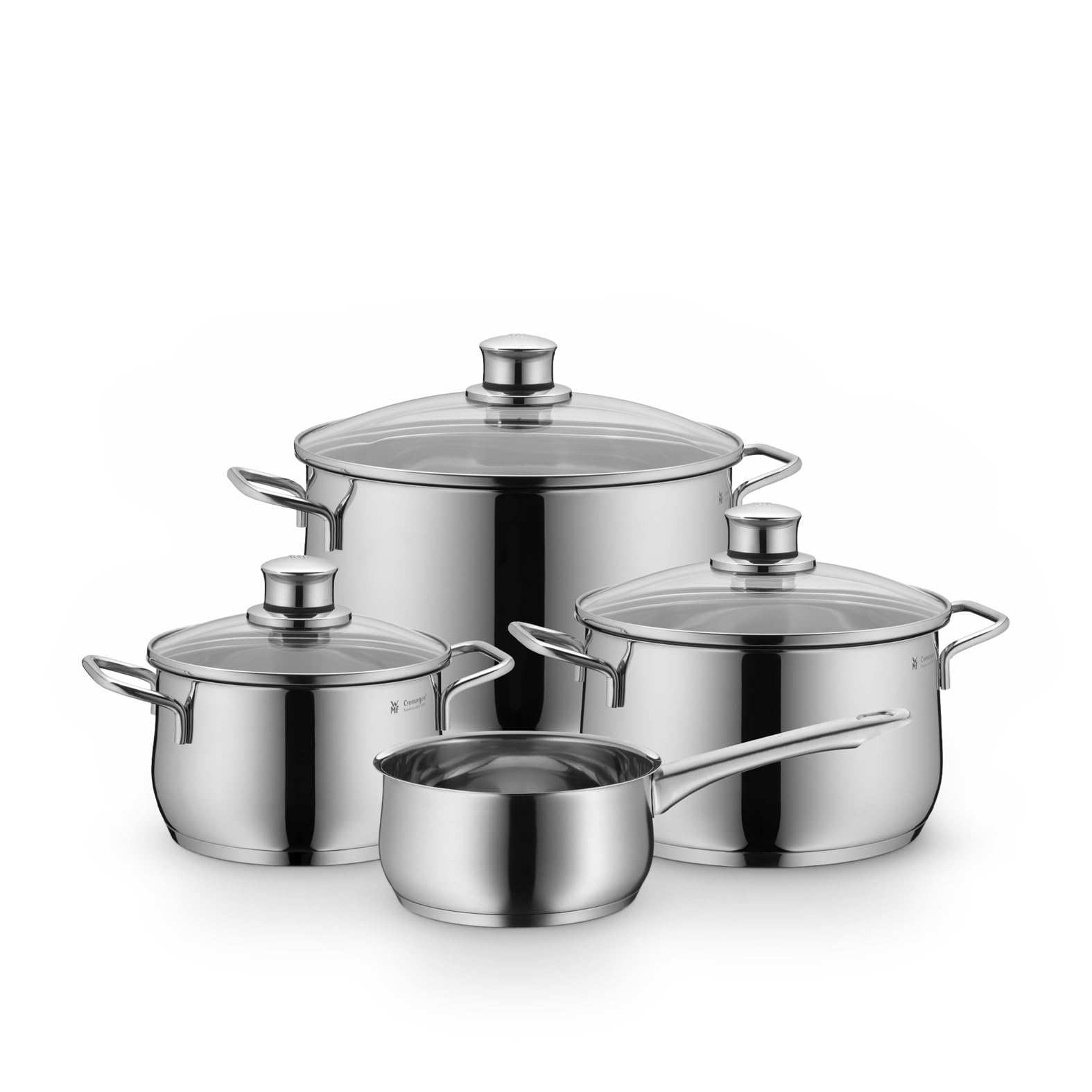 WMF Diadem Plus Topfset Induktion 4-teilig, Kochtopf Set mit Glasdeckel, breiter Schüttrand, Cromargan Edelstahl poliert, Induktions Töpfe Set unbeschichtet, alle Herdarten, spülmaschinengeeignet